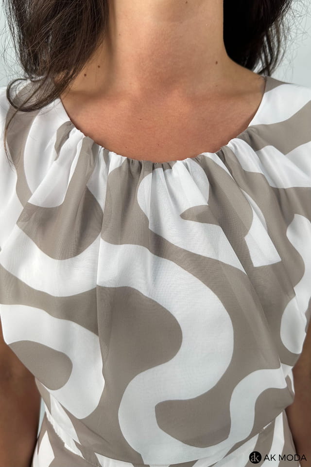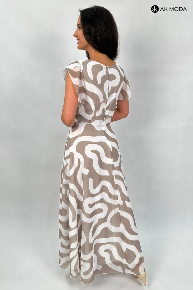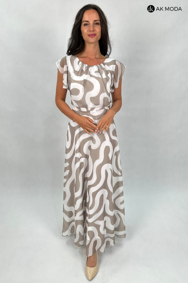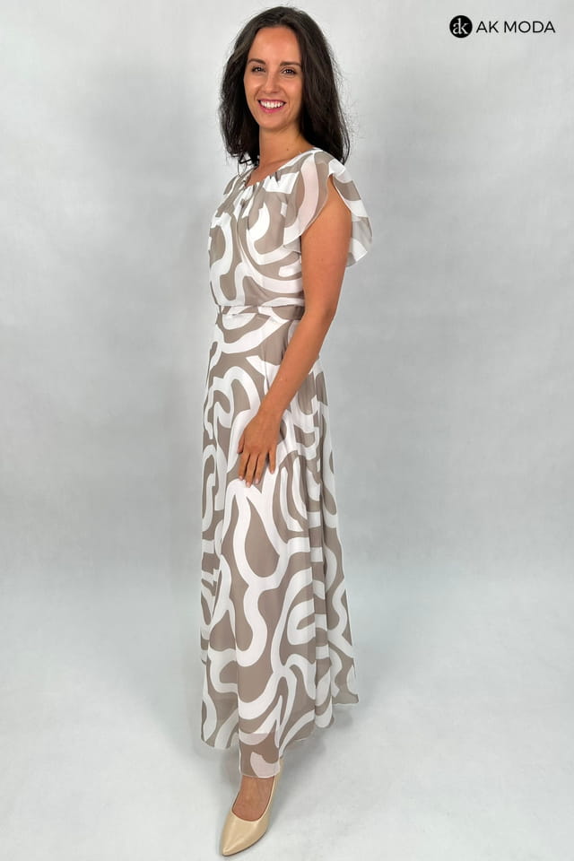 Długa, rozkloszowana sukienka w bezowo-śmietankowe wzory. Dekolt okragły, przy ramionach falbanki.