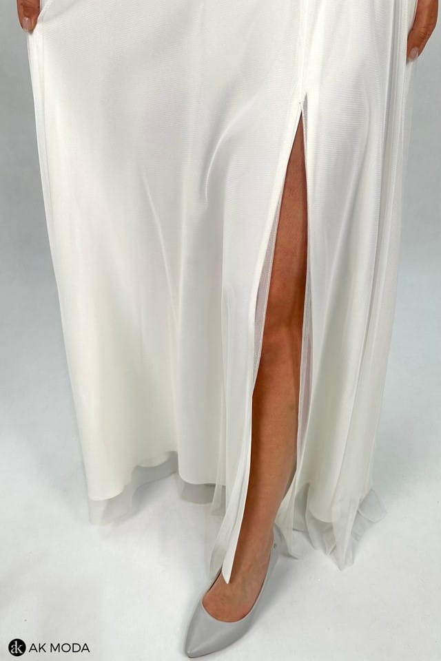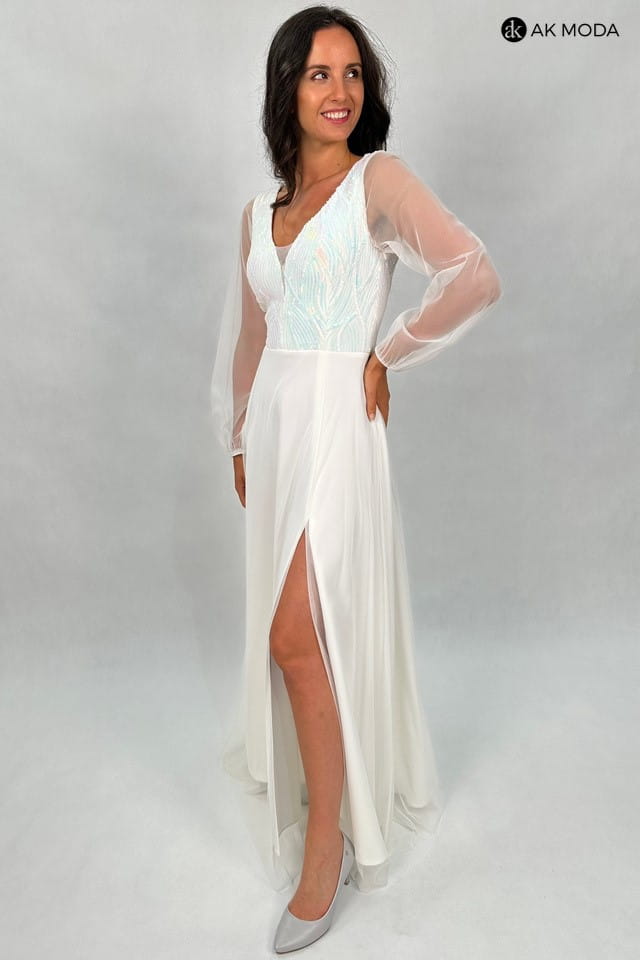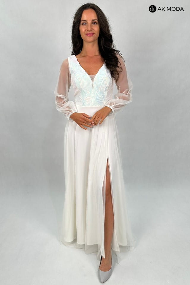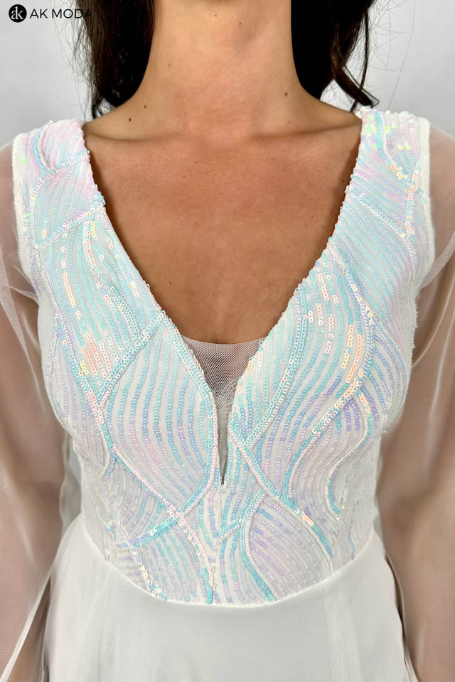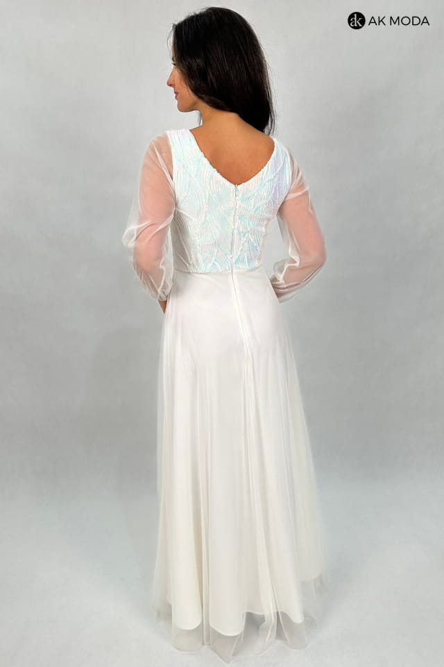 Długa rozkloszowanan sukienka w kolorze śmietankowym. Dekolt w szpic, długie transparentne rękawy zakonczone gumką, odpinany ozdobny kwiatek. Góra sukienki uszta z elastycznego materiału i ozdobiona mieniącymi się cekinami, dół tiulowy.