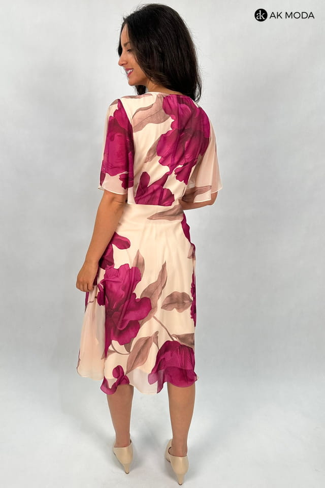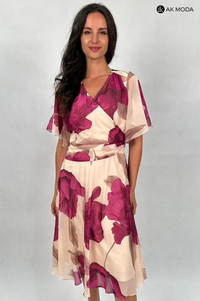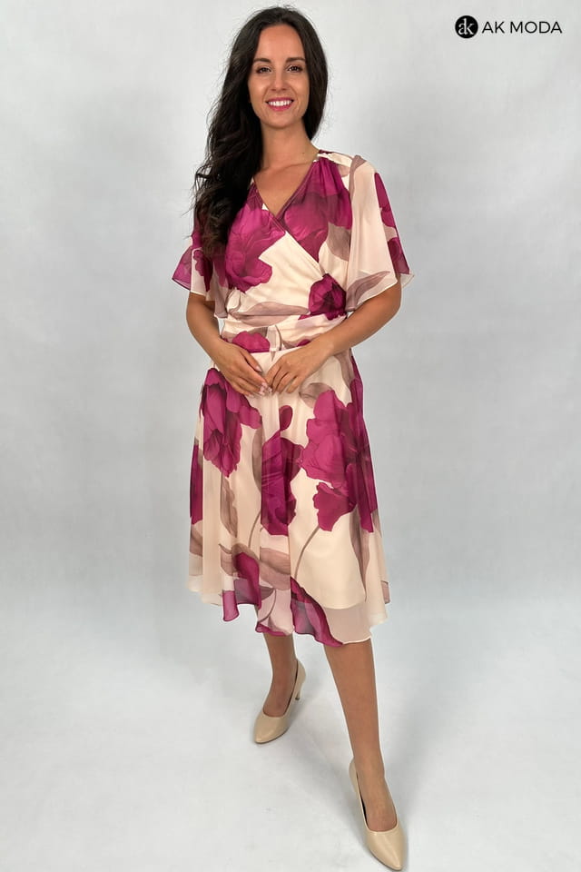 Rozkloszowana sukienka midi w różowe kwiaty na beżowym tle. Dekolt zakładany, krótki luźny rękaw.