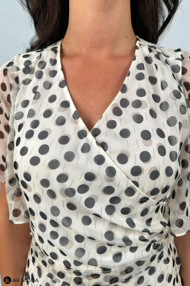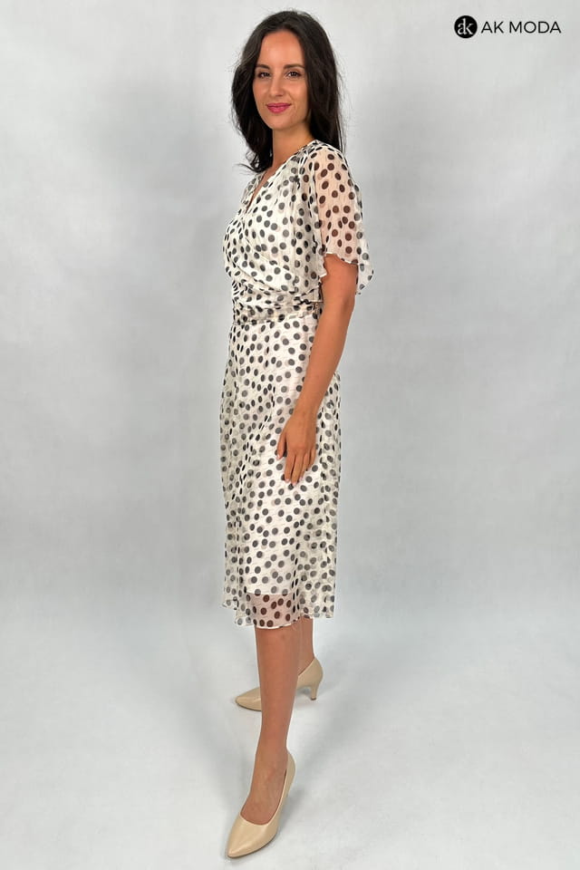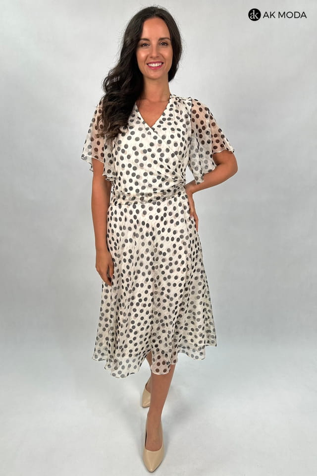 Rozkloszowana sukienka midi w czarne groszki na beżowym tle. Dekolt zakładany, krótki luźny rękaw.
