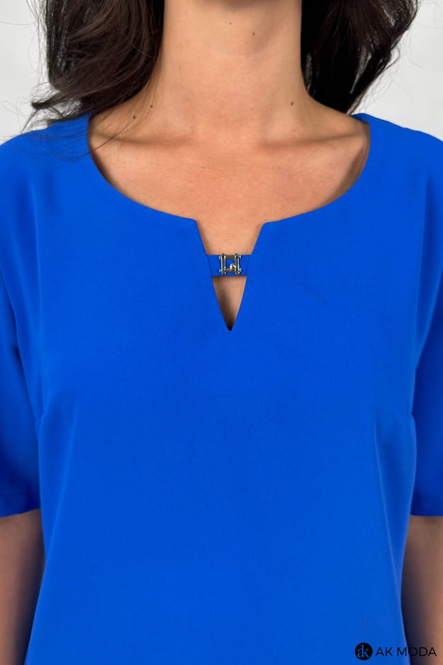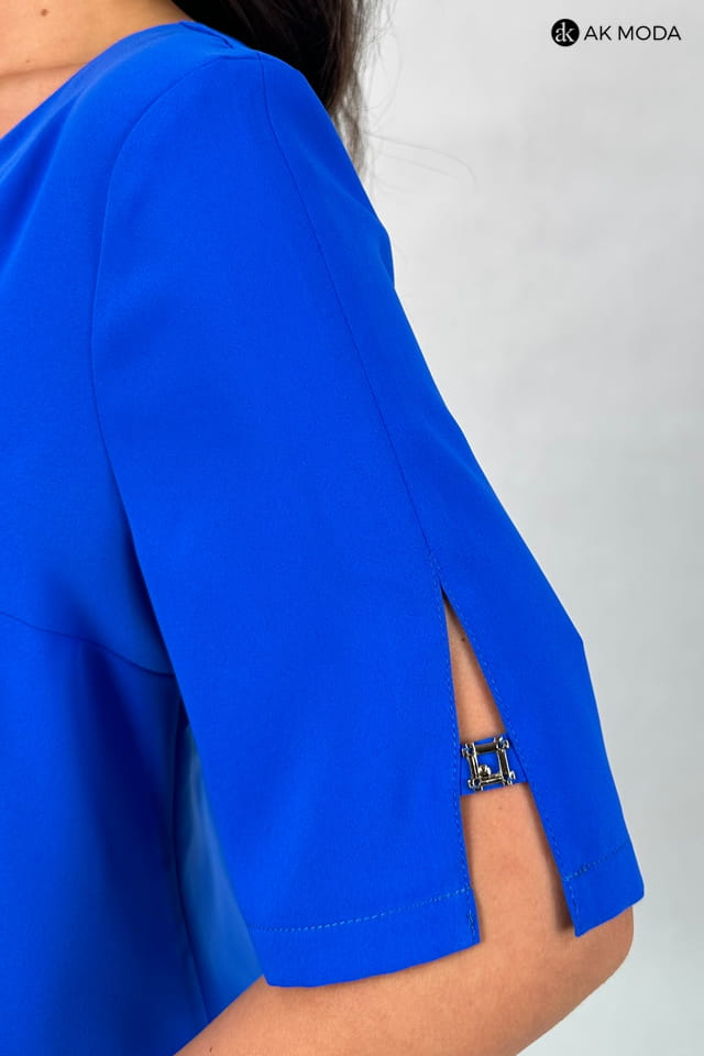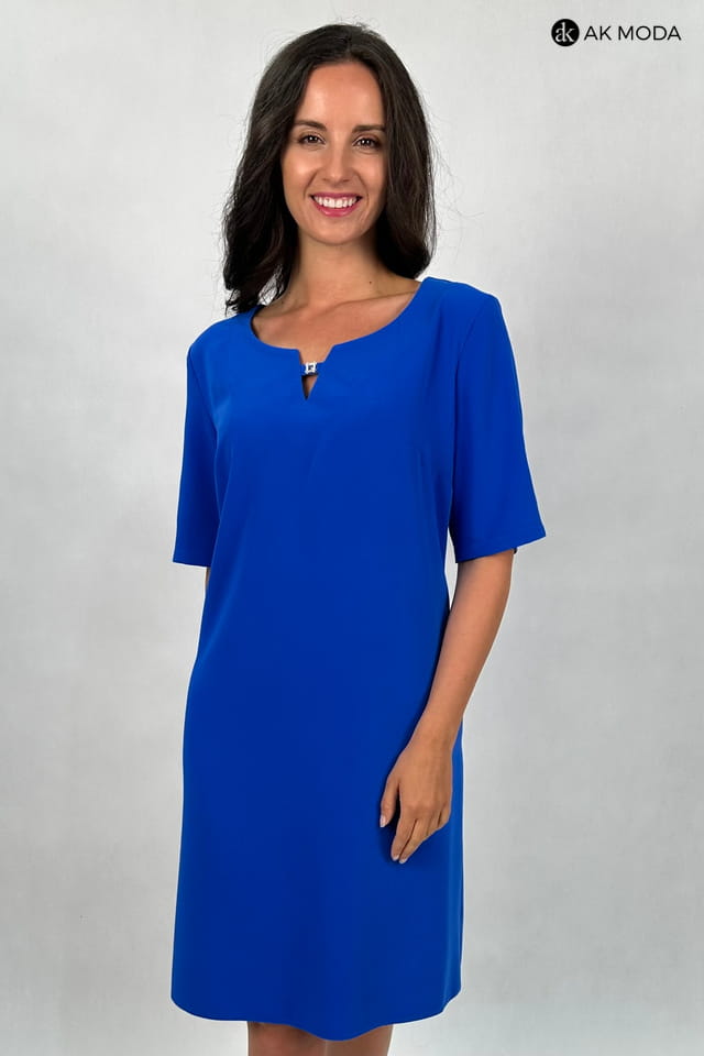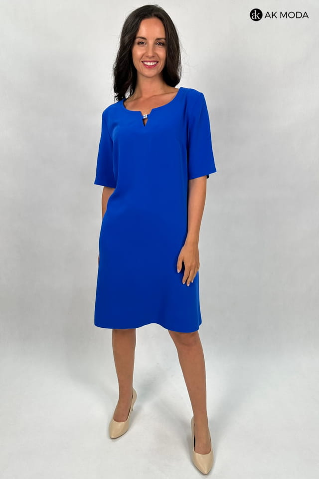 Elegancka sukienka w kolorze chabrowym, w kształcie litery "A". Dekolt okrągły, krótkie rękawy z pęknięciami, na plecach wycięcie z ozdobną kokardką.