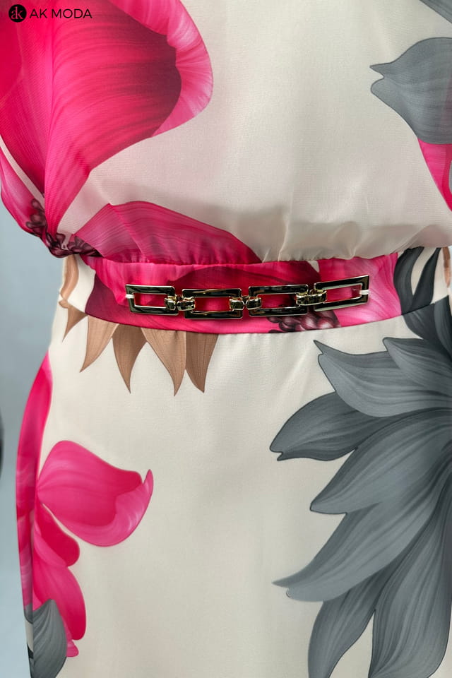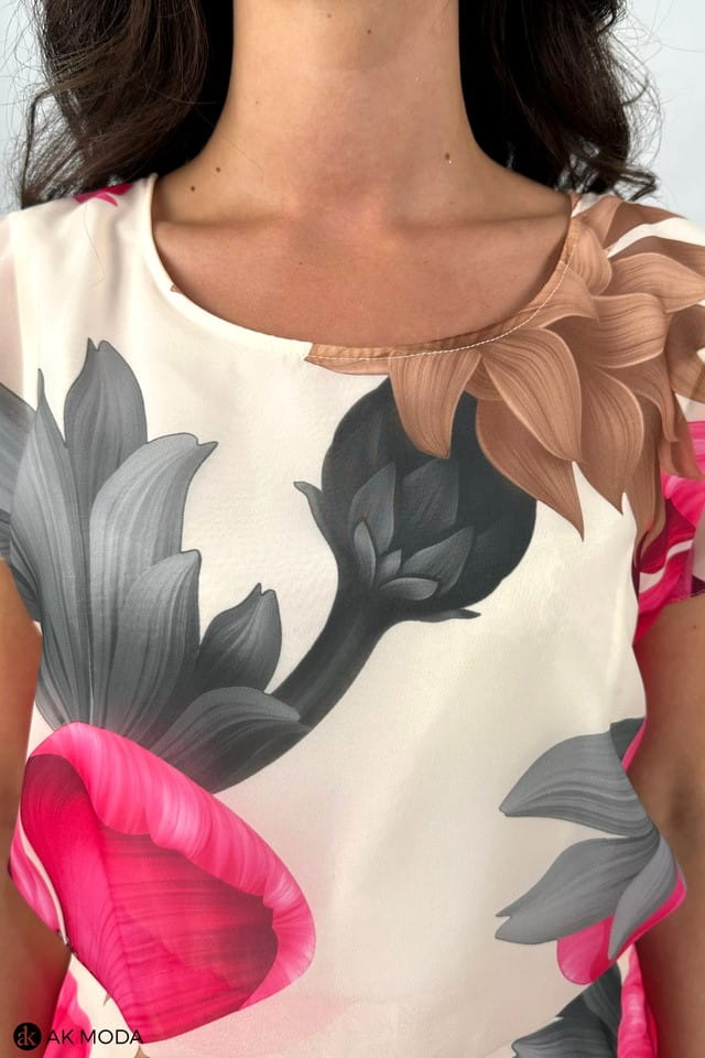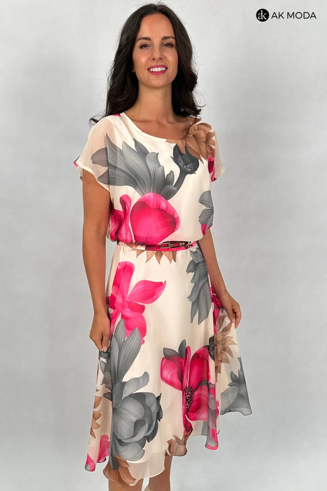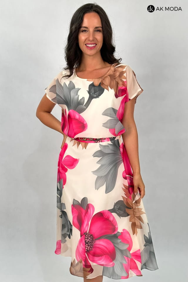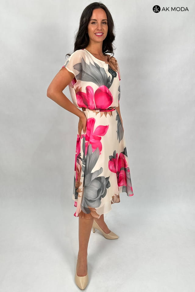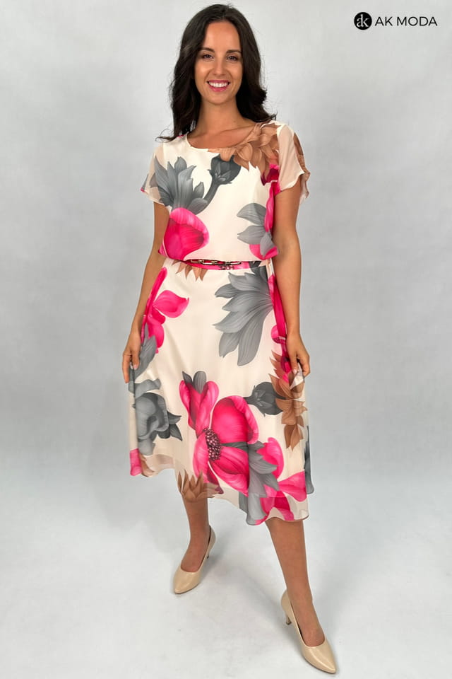 Beżowa sukienka midi z kwiatowym printem. Dół rozkloszowany, góra luźniejsza, w pasie po bokach gumki.
