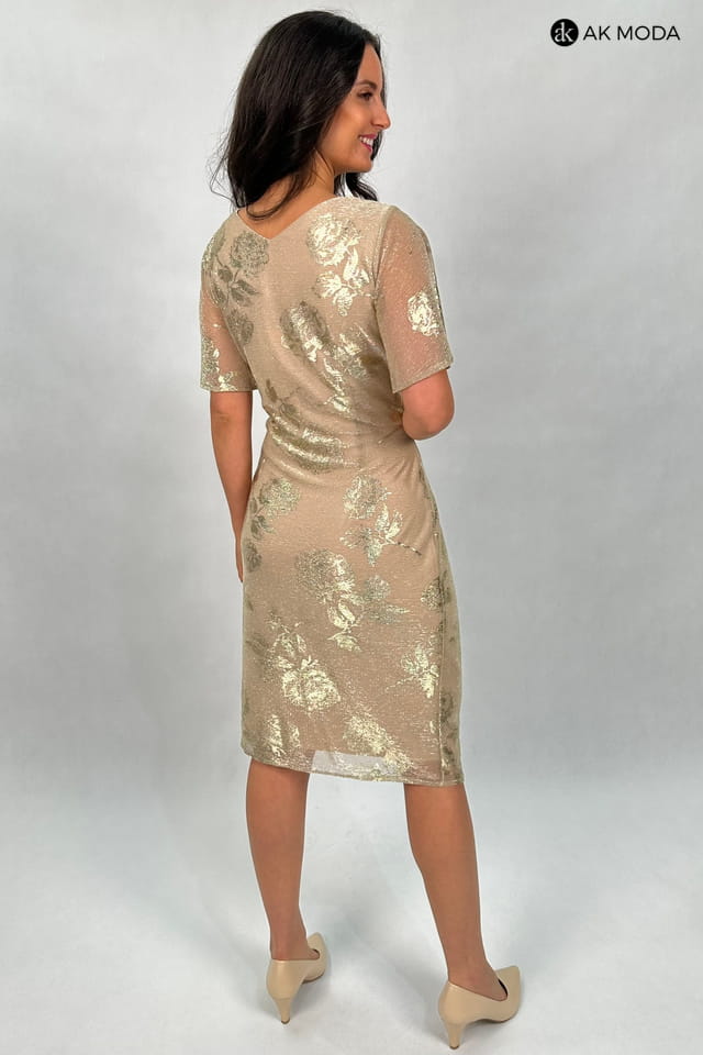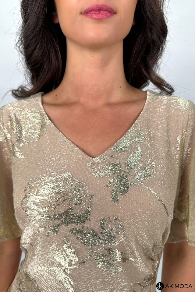 Krótka dopasowana sukienka w kolorze beżowym, z marszczeniem w talii. Dekolt w szpic, krótkie luźne rękawki. Sukienka uszyta z elastycznego materiału, z błyszczącą wierzchnią warstwą, zdobioną kwiatowym printem.