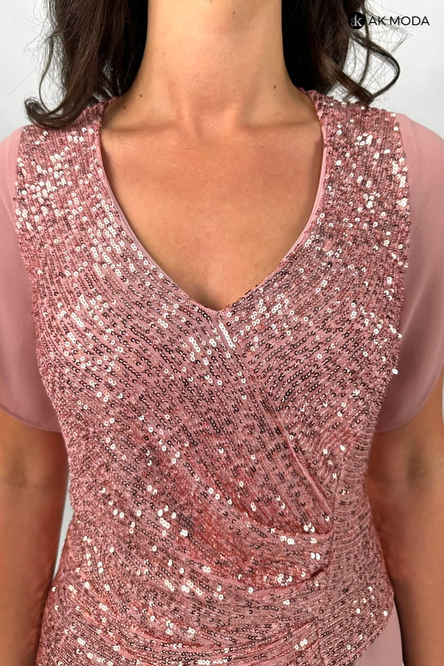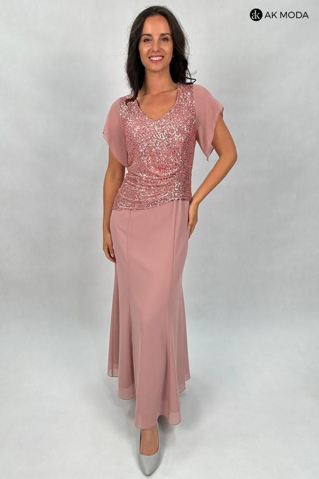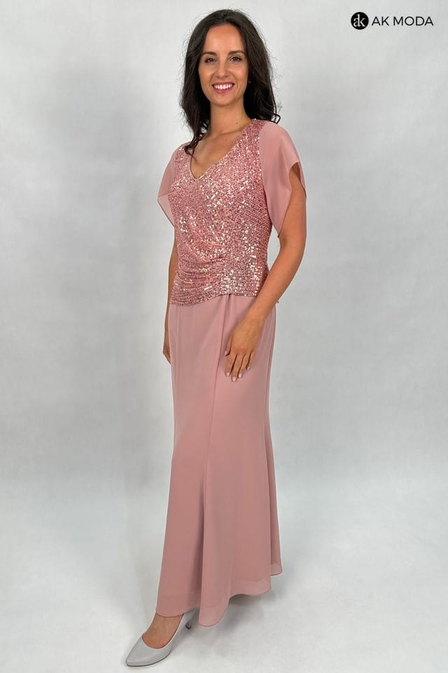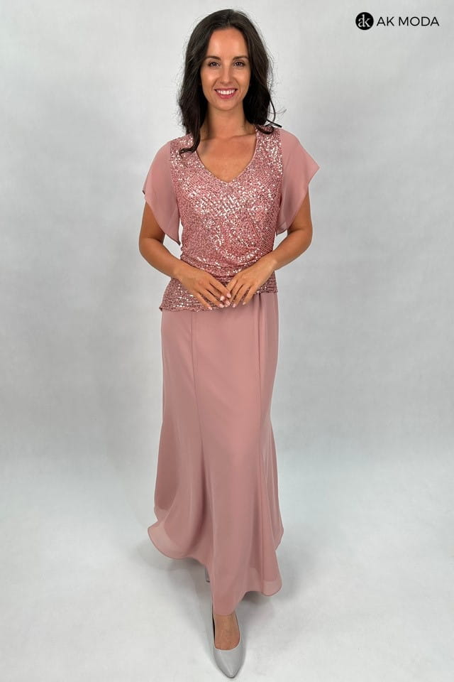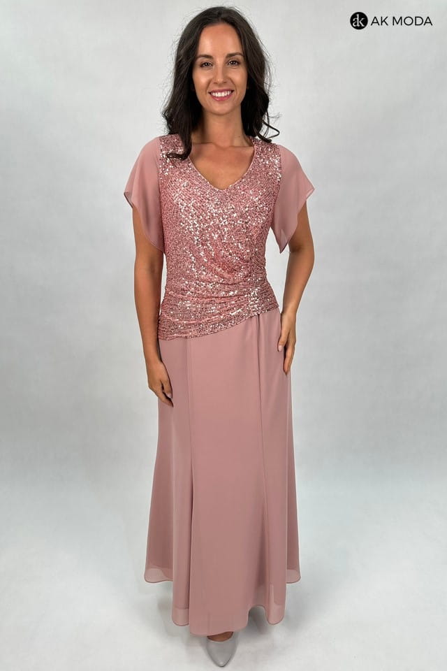 Rozkloszowana sukienka maxi w kolorze brudnego pudrowego różu. Krótkie transparentne rękawy, dekolt w szpic, góra sukienki elastyczna, zdobiona cekinami, dół gładki.