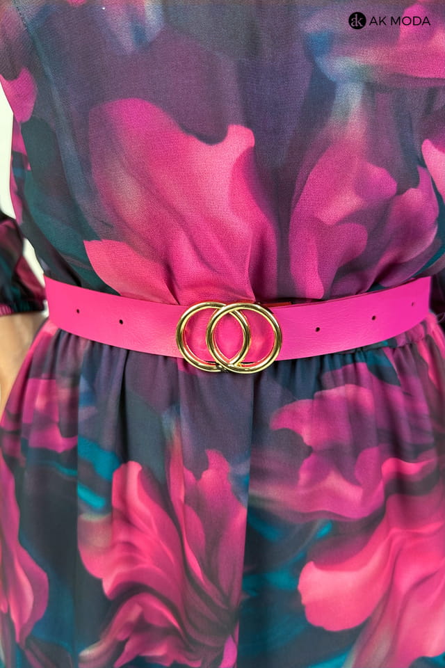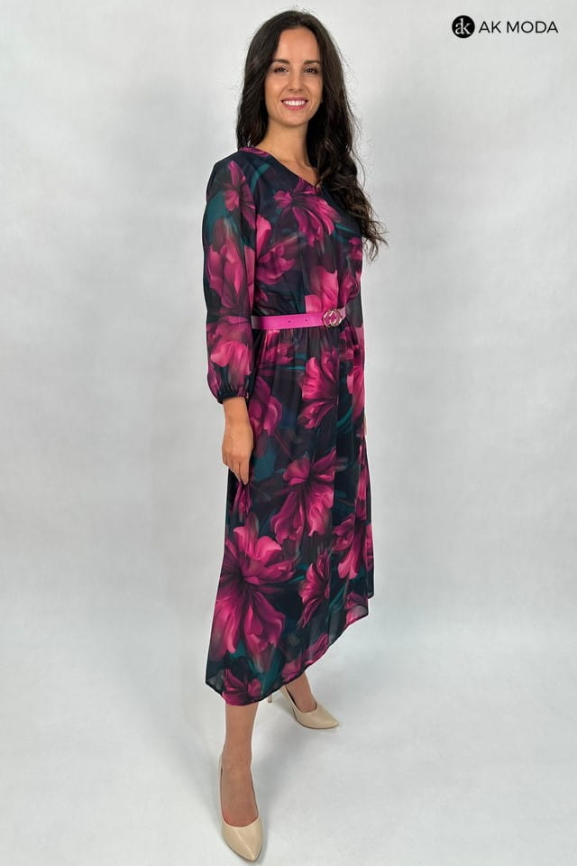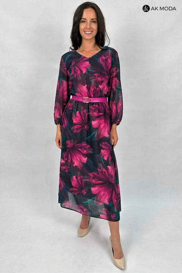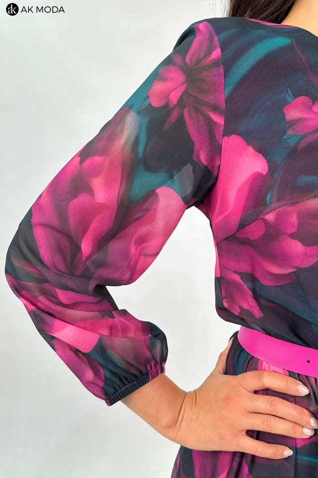 Rozkloszowana sukienka midi z kwiatowym printem, utrzymana w różowo-zielonej kolorystyce. Dekolt w szpic, transparentne rękawy 3/4 zakończone gumką, w pasie gumka i pasek.