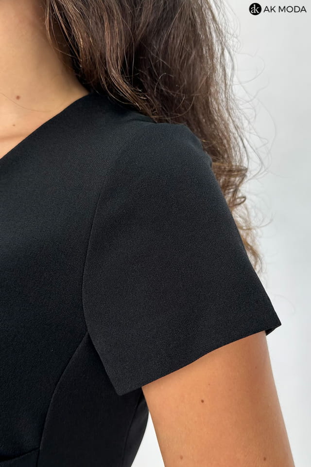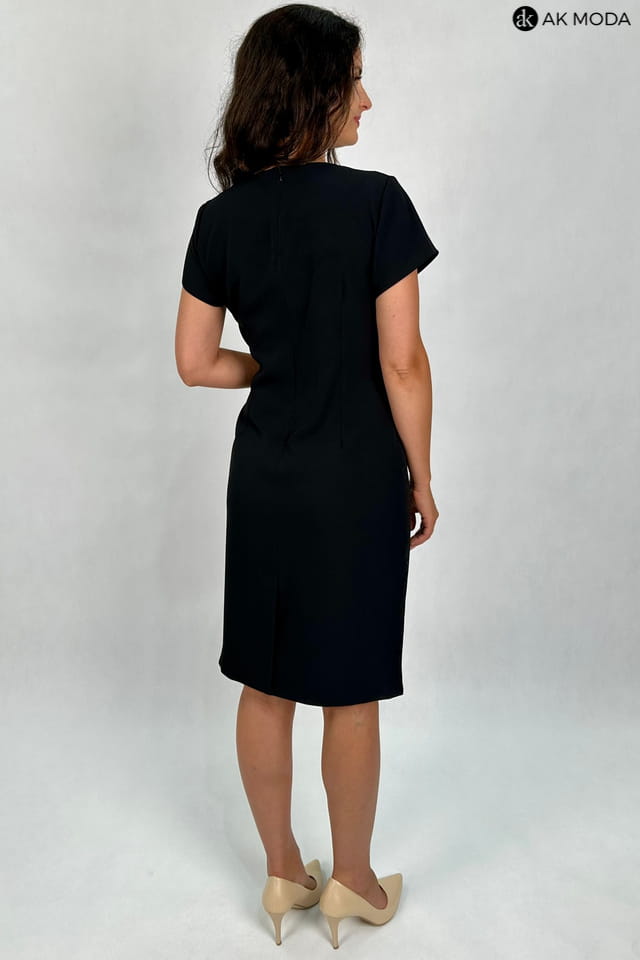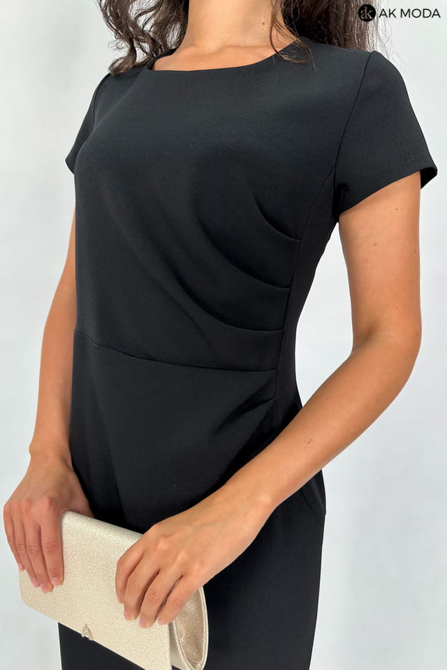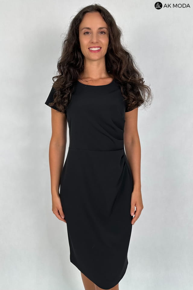 Krótka, dopasowana sukienka w kolorze czarnym z ozdobnym marszczeniem w talii. Dekolt okrągły, krótkie rękawki, fason odcinany w talii.