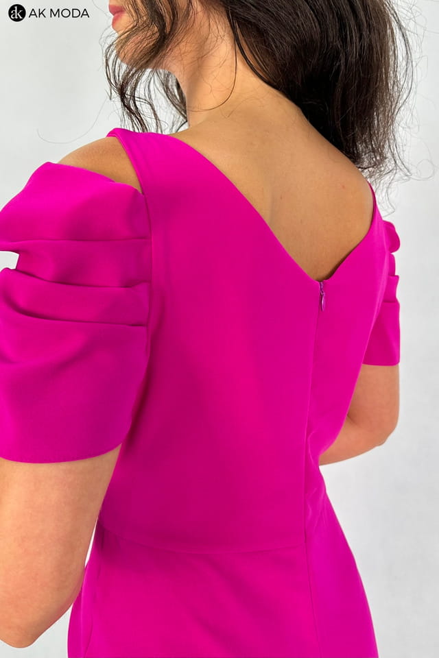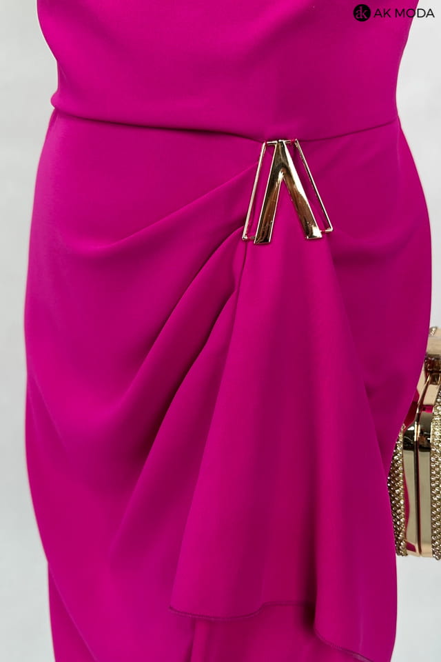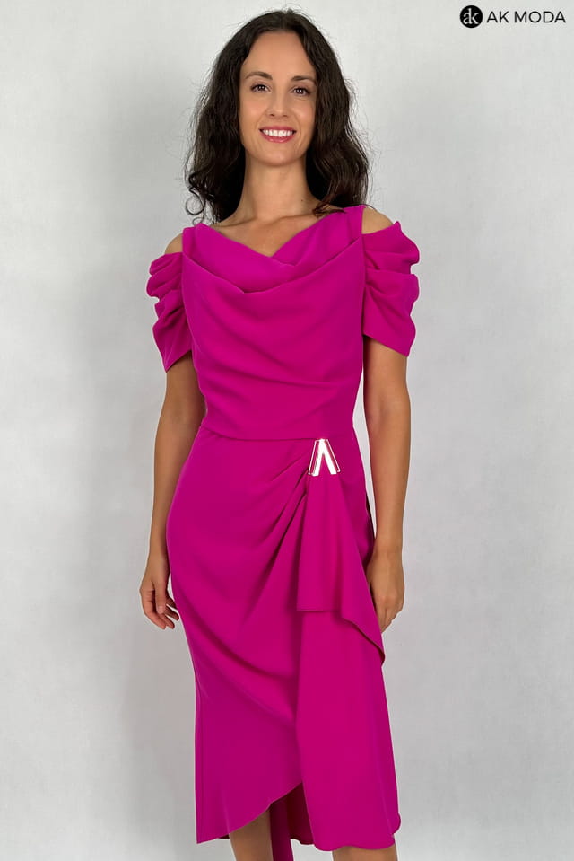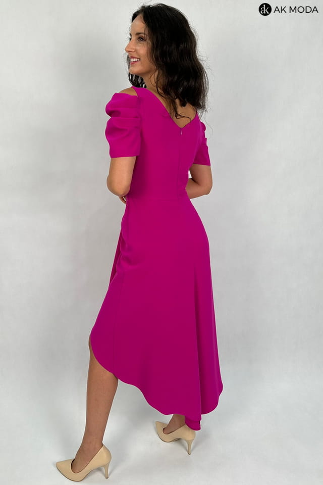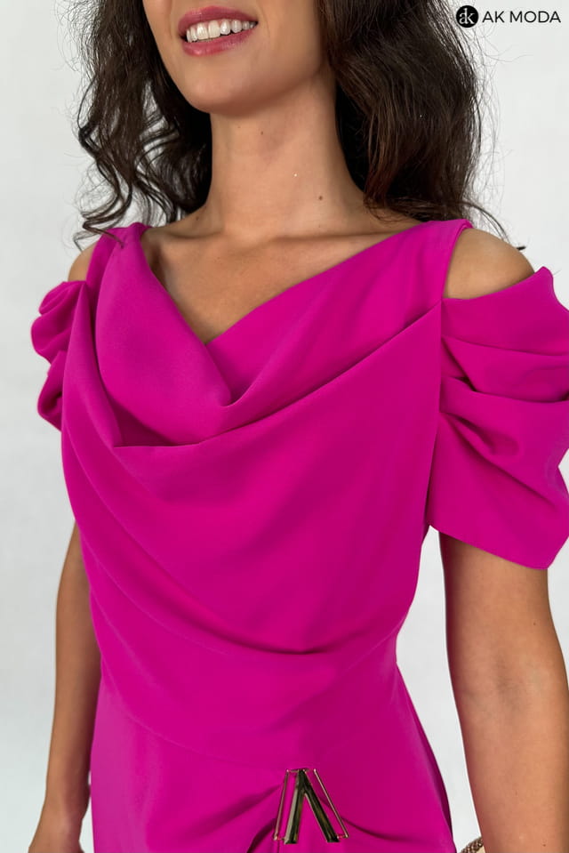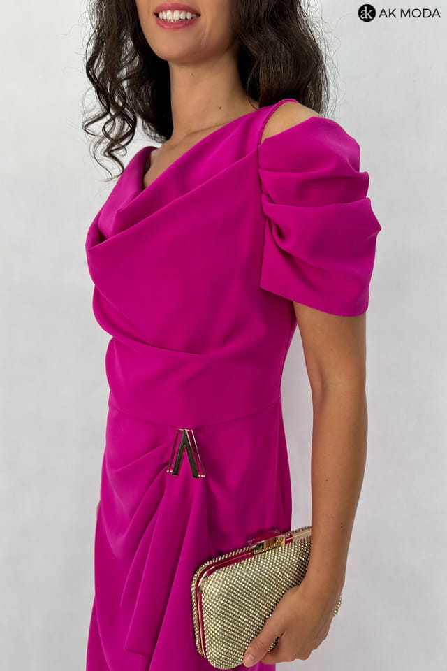 Asymetryczna sukienka midi w kolorze fuksjowym z opadającymi ramionami. Dekolt typu "woda", na boku ozdobnie upiety luźny materiał.