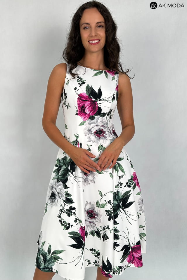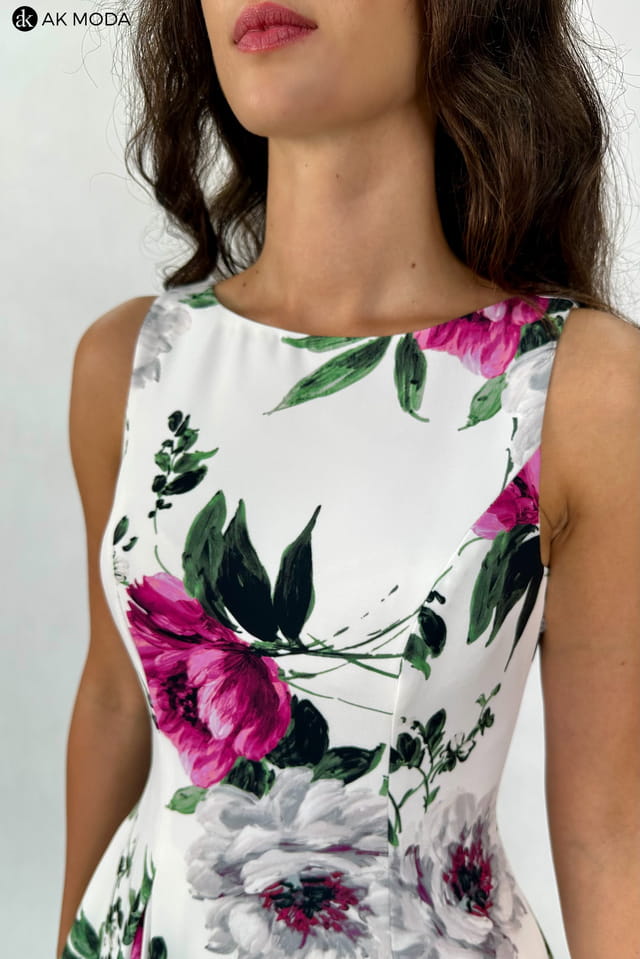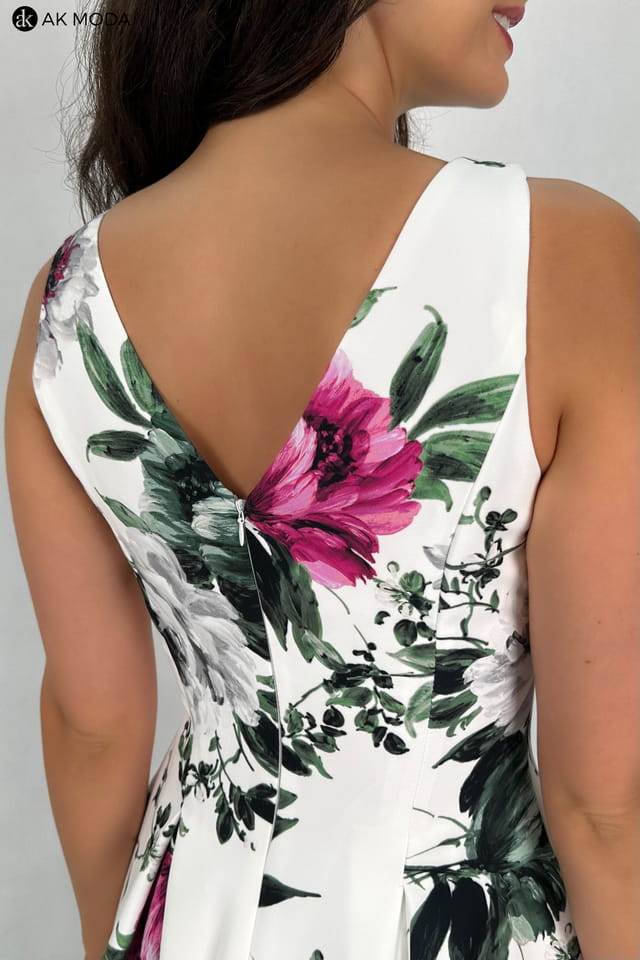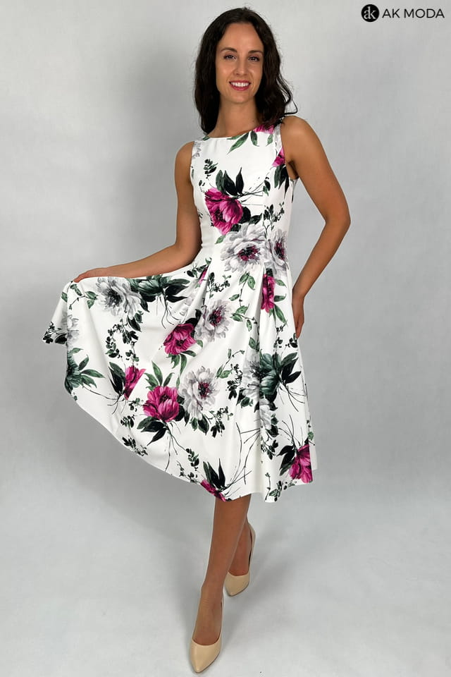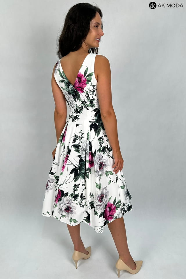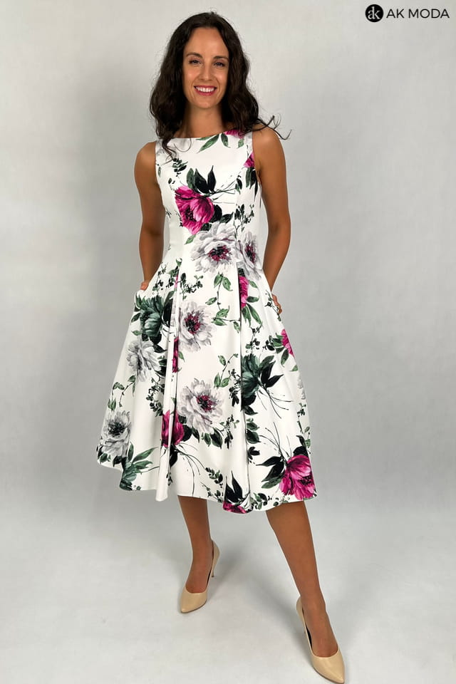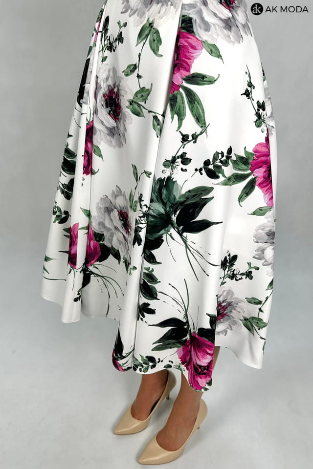Elegancka sukienka midi w kolorze śmietankowym z kwiatowym printem. Dekolt okrągły, na plecach wycięcie w serek. Fason rozkloszowany z usztywnionym dołem i kieszeniami.