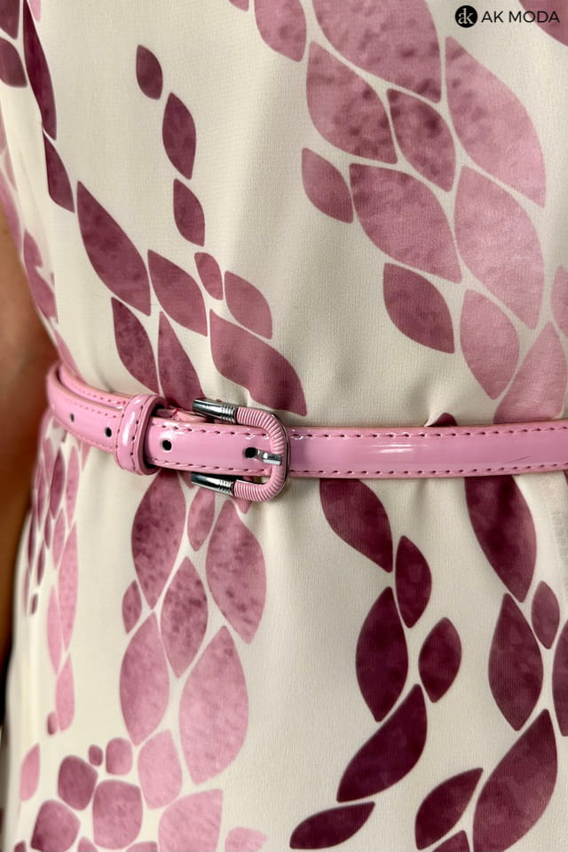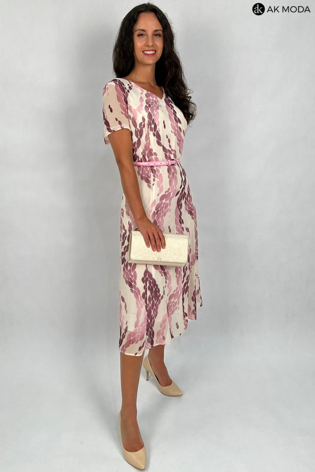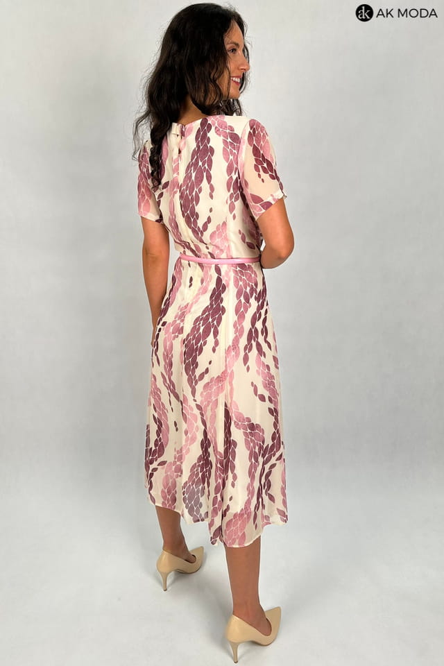 Rozkloszowana sukienka midi w kolorze beżowym, z printem w odcieniach fioletu. Dekolt w szpic, krótkie, transparentne rękawki, w talii pasek.