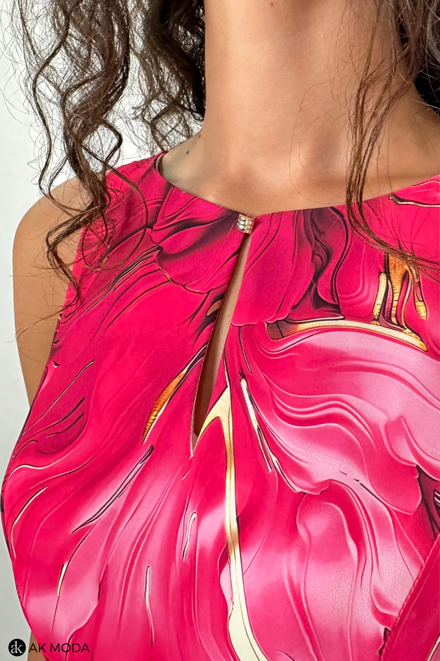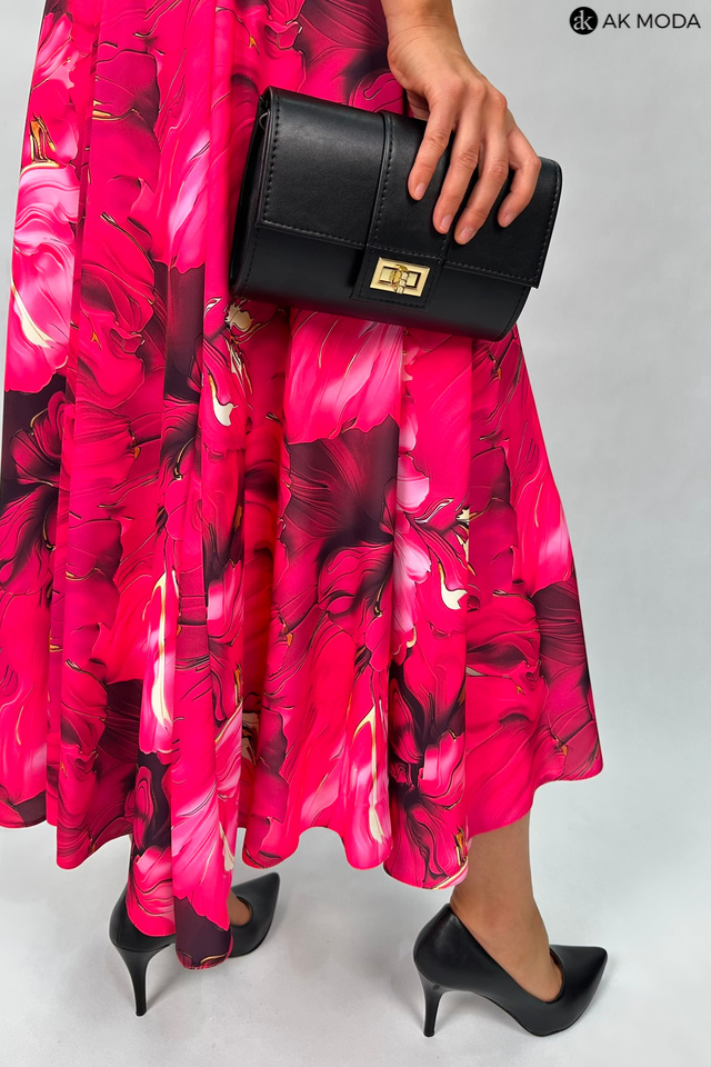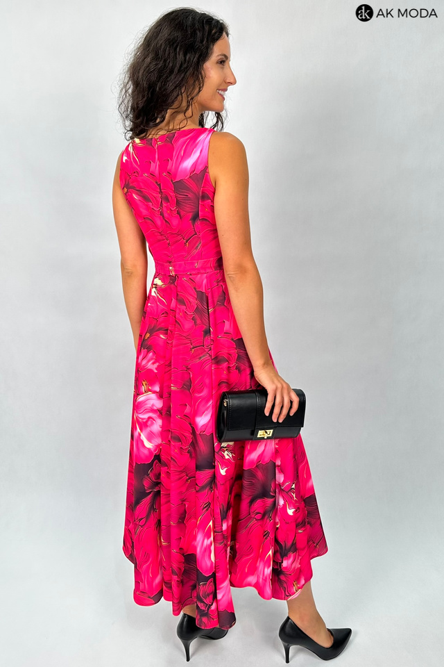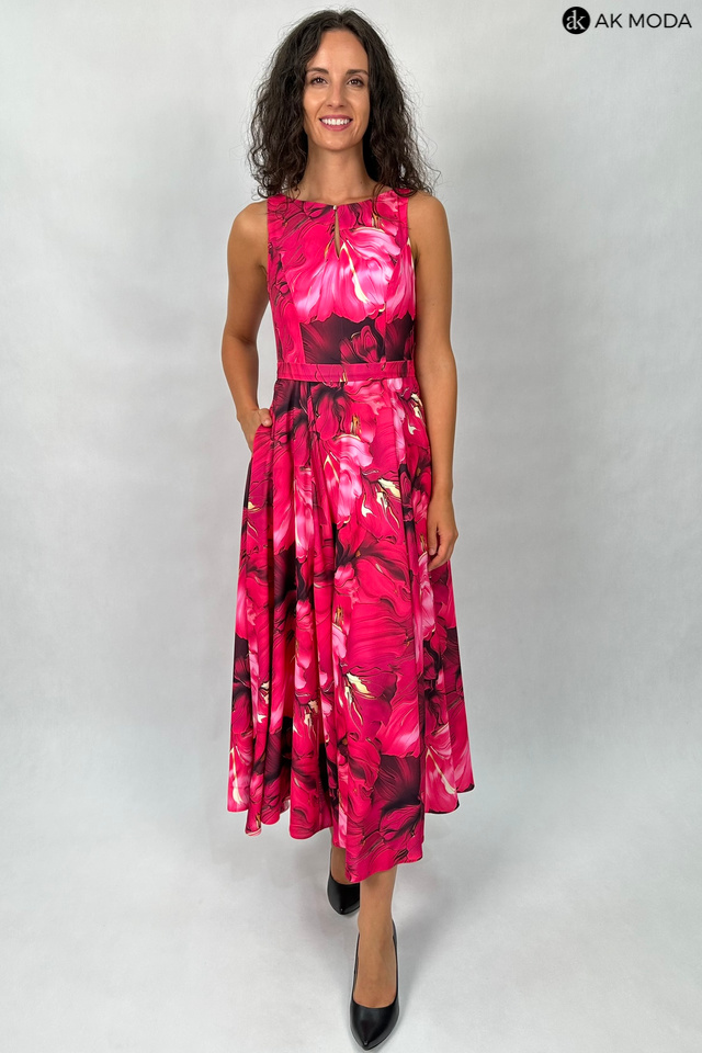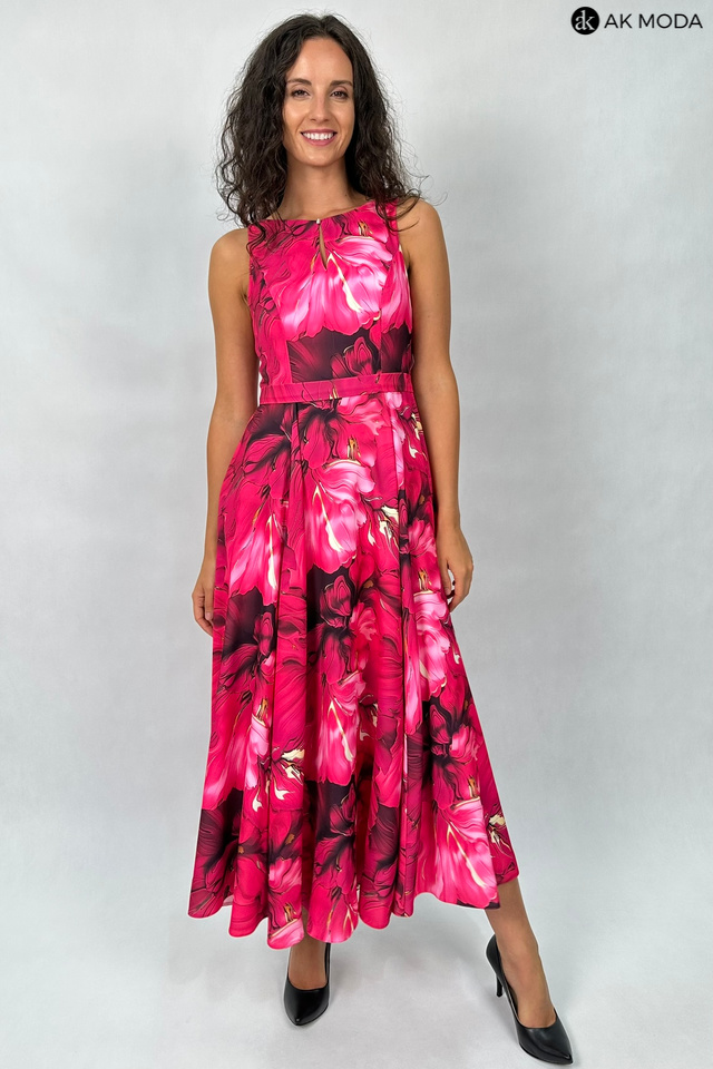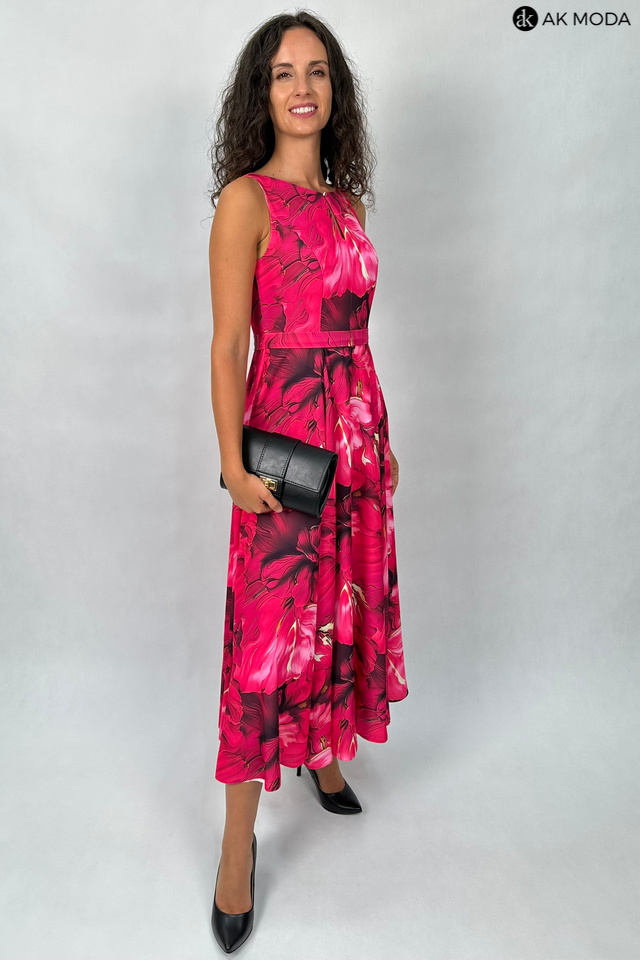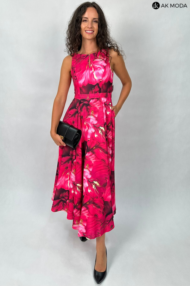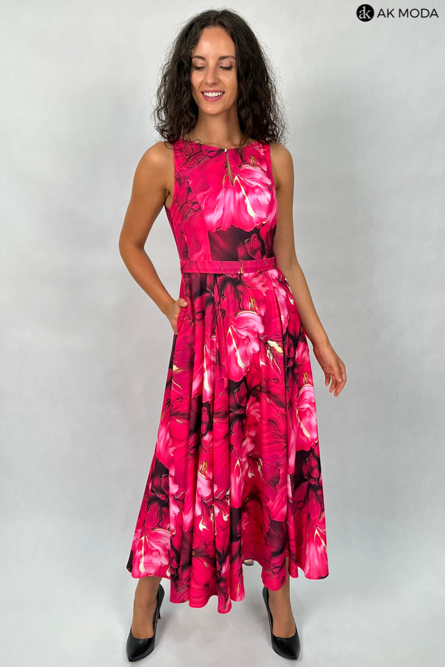 Wzorzysta sukienka midi, utrzymana w kolorystyce różu z żółtymi akcentami. Dekolt okrągły z pęknięciem, w talii pasek. Fason rozkloszowany z kieszeniami.