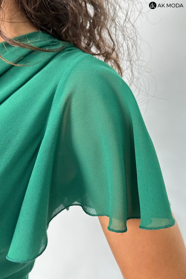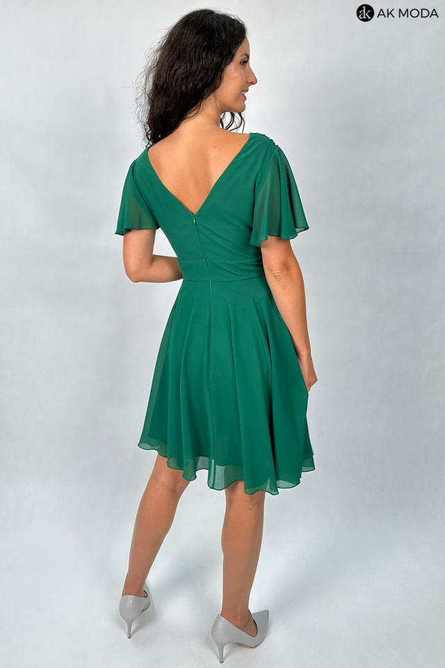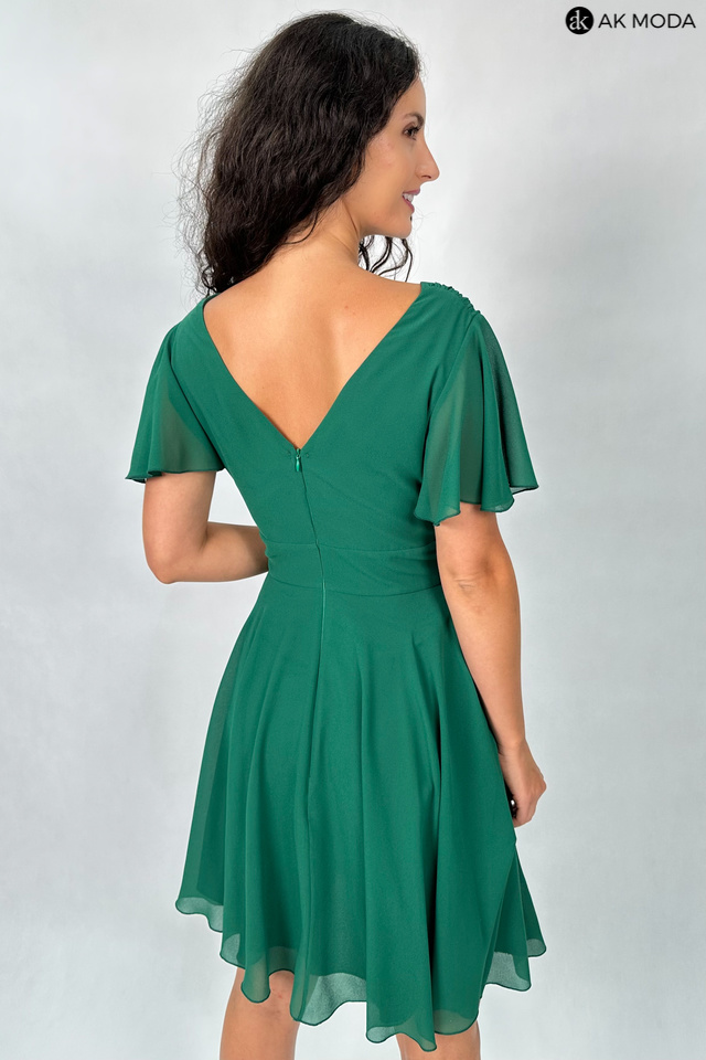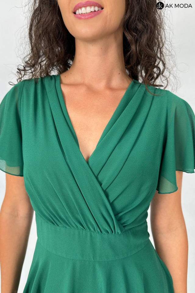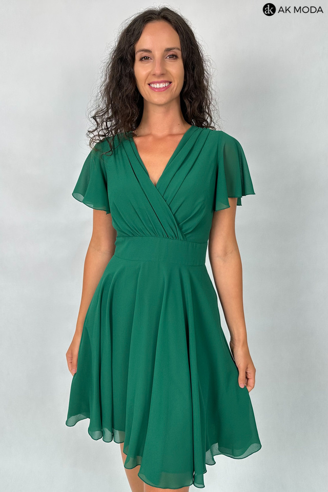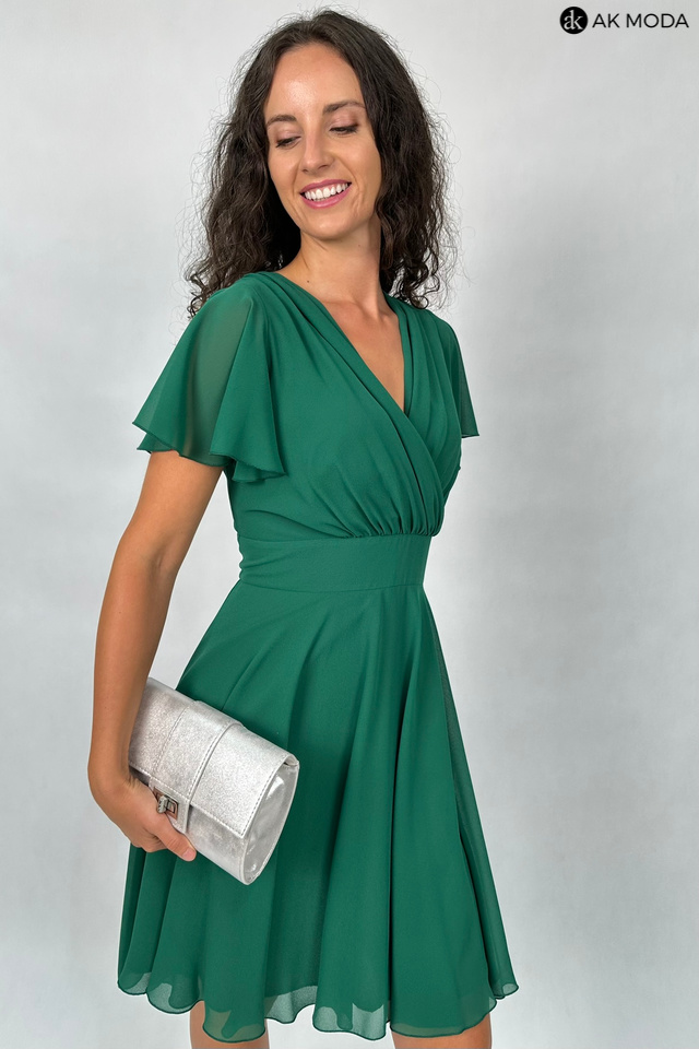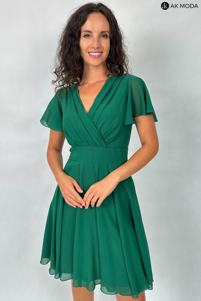 Krótka, rozkloszowana sukienka w kolorze zielonym. Dekolt kopertowy, transparentne rękawy w formie falbanki.