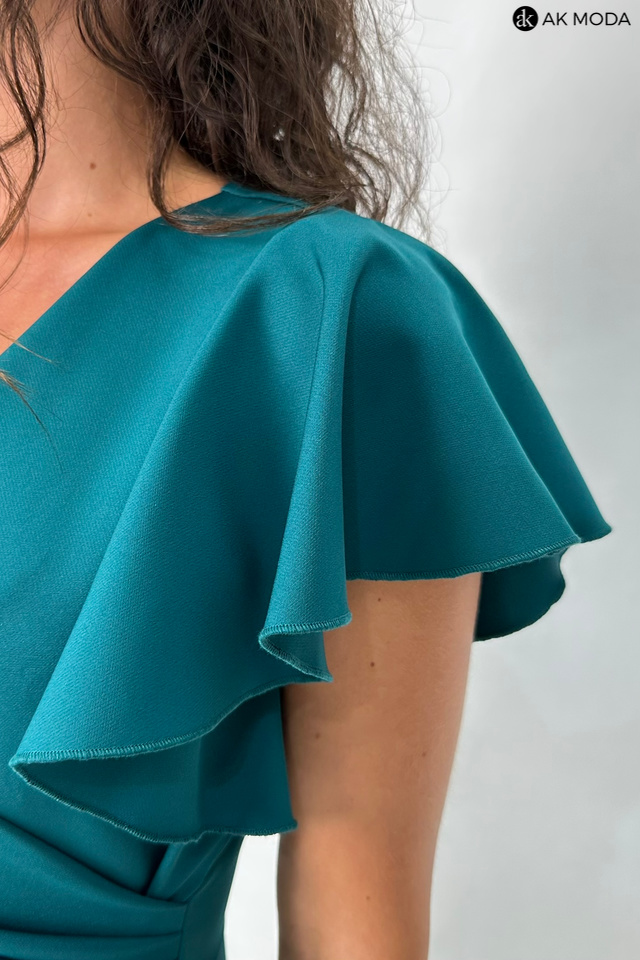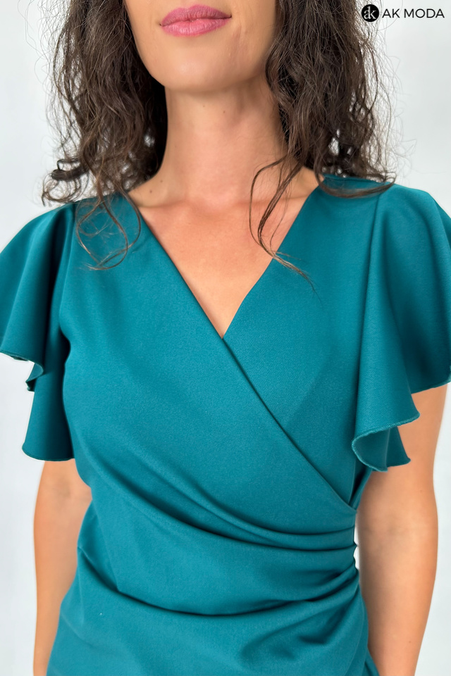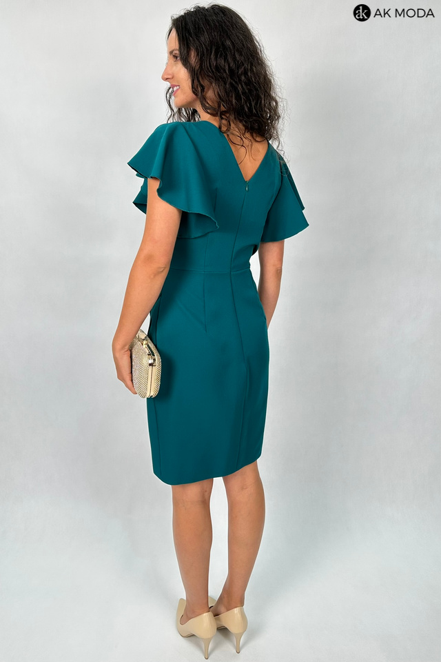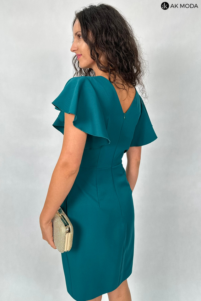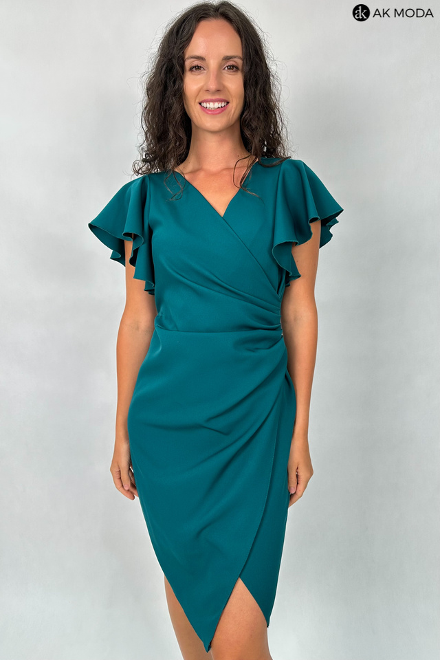 Krótka dopasowana sukienka w kolorze ciemnozielonym z krótkimi rękawkami w formie falbanek. Dekolt kopertowy, w pasie marszczenie, rozcięcie z boku.