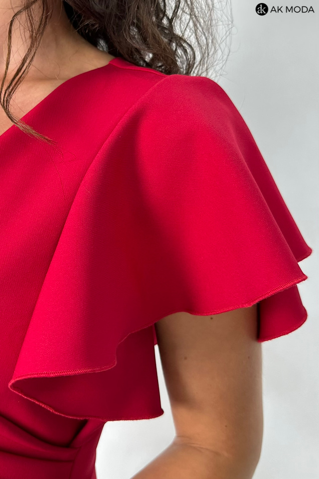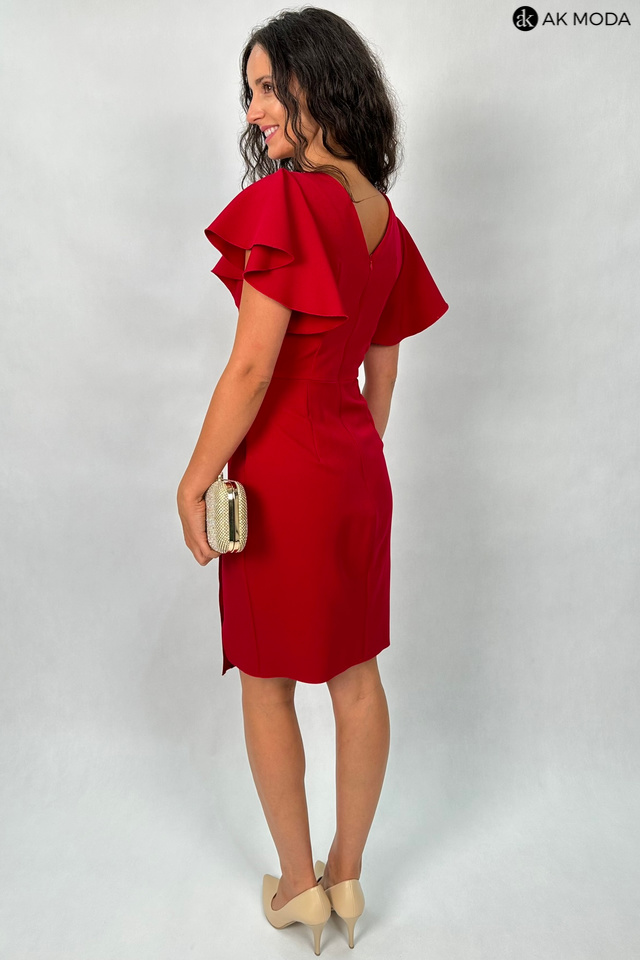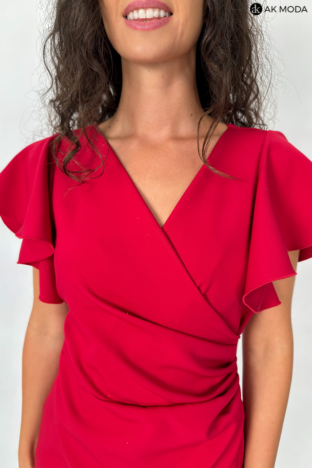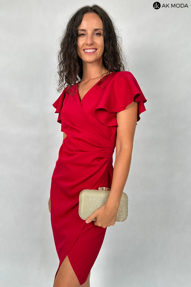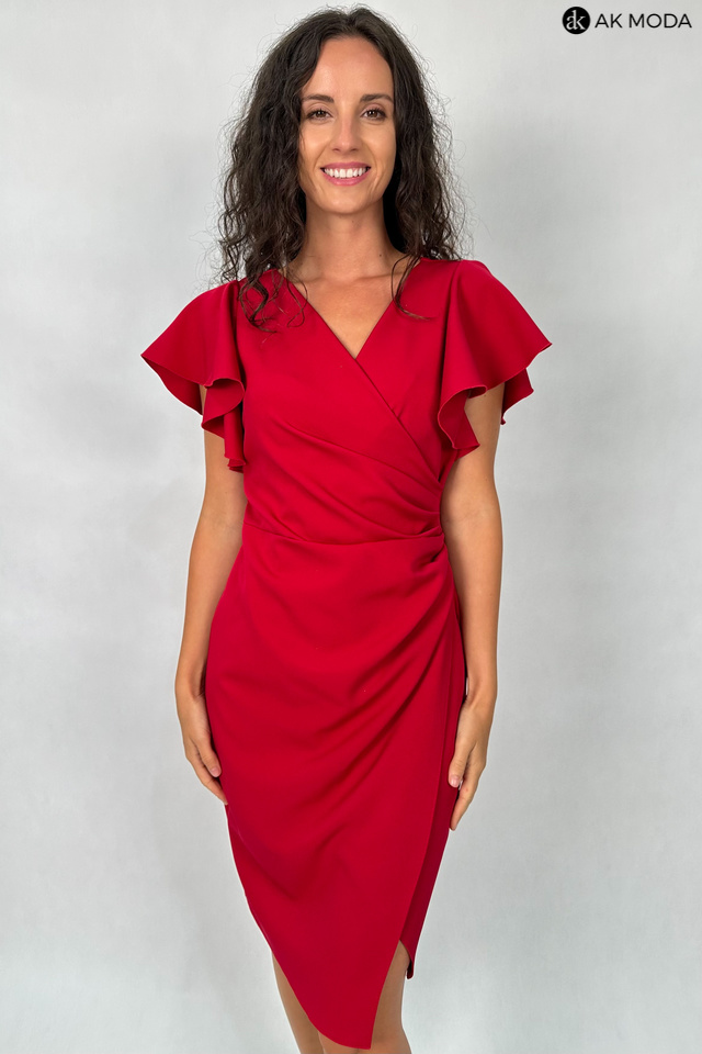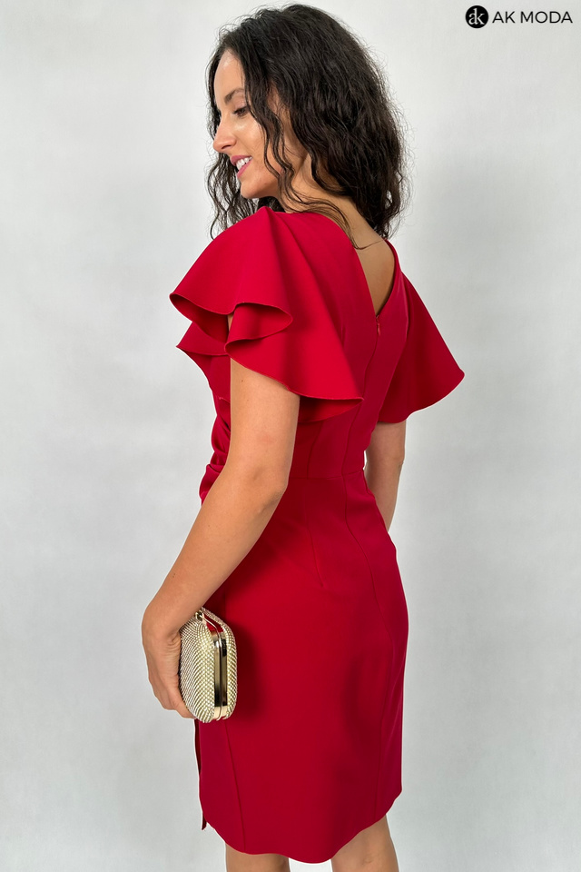 Krótka dopasowana sukienka w kolorze bordowym z krótkimi rękawkami w formie falbanek. Dekolt kopertowy, w pasie marszczenie, rozcięcie z boku.