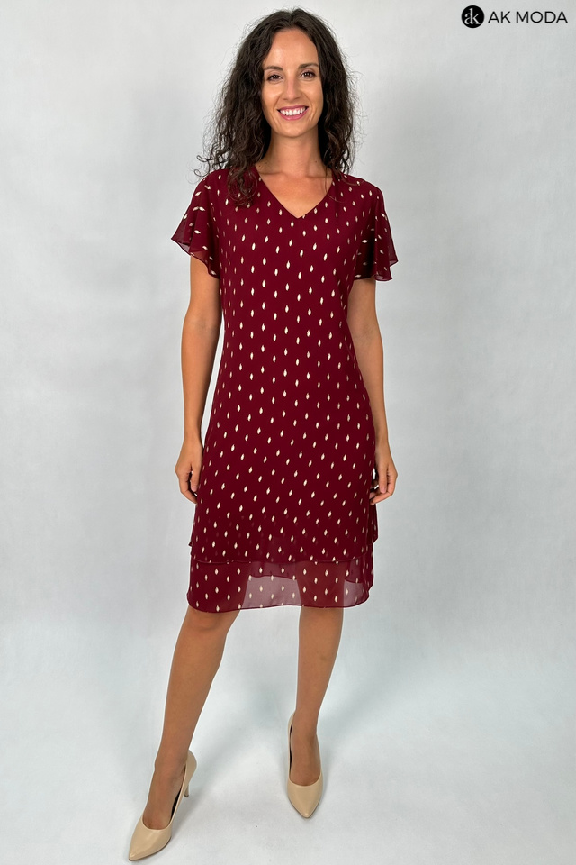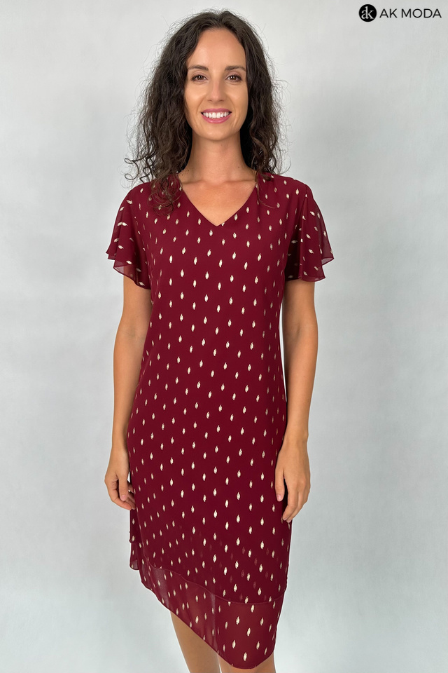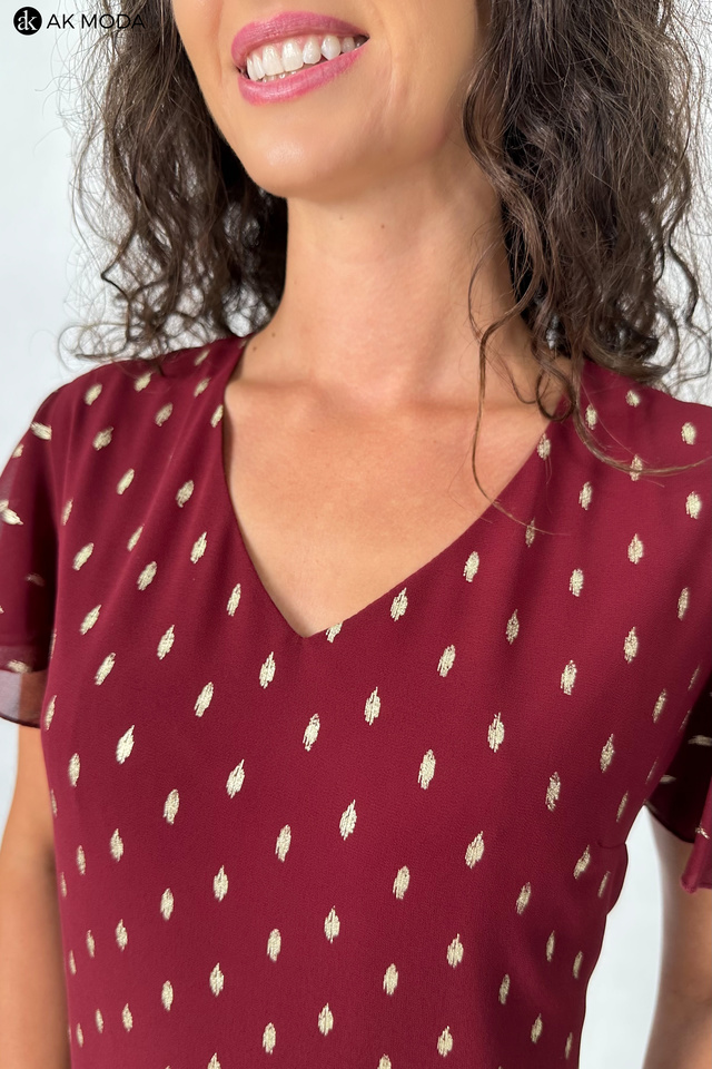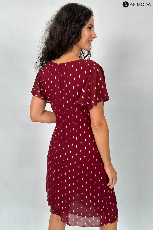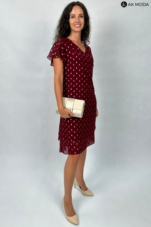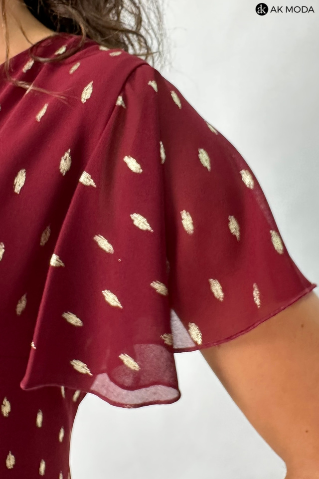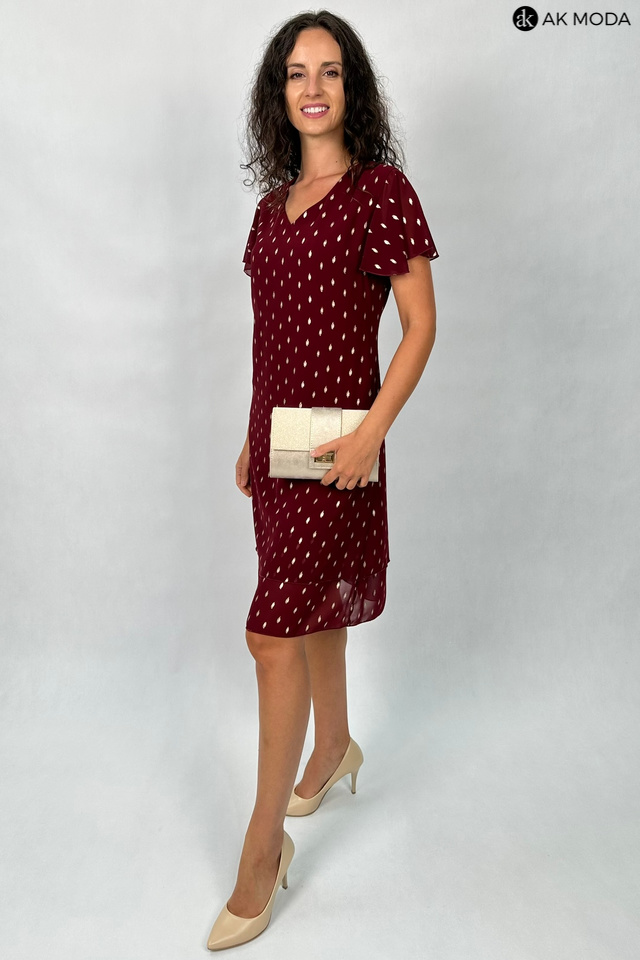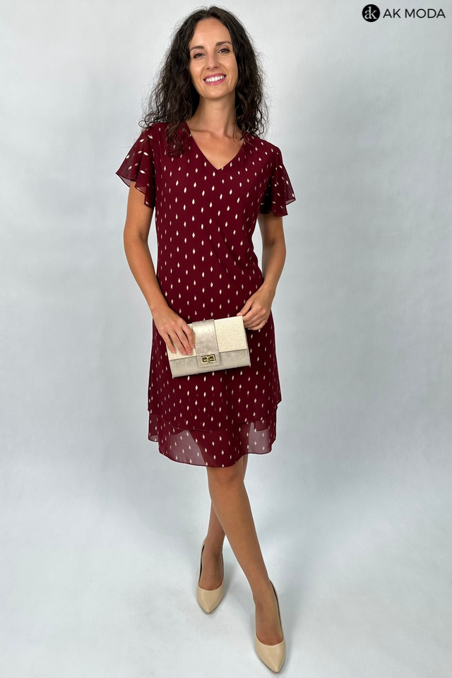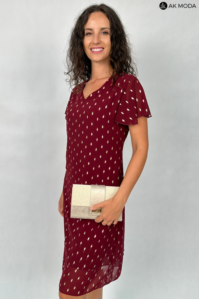Trapezowa sukienka w kolorze bordowym w złote cętki. Dekolt w szpic, krótki zwiewny rękaw w formie falbanki.
