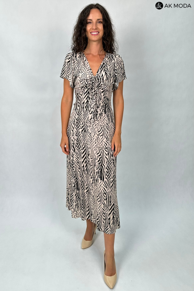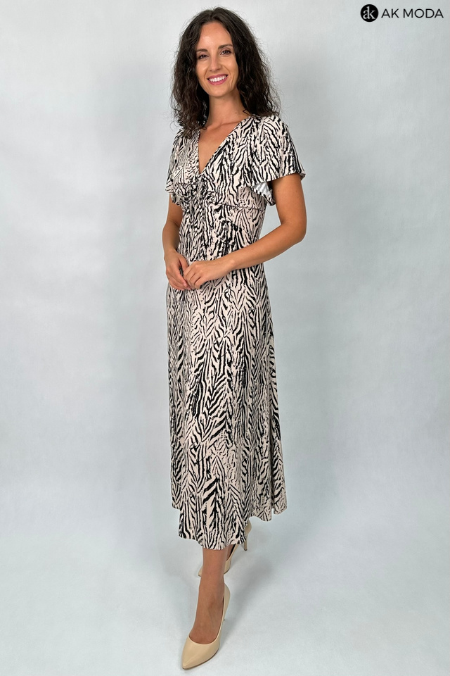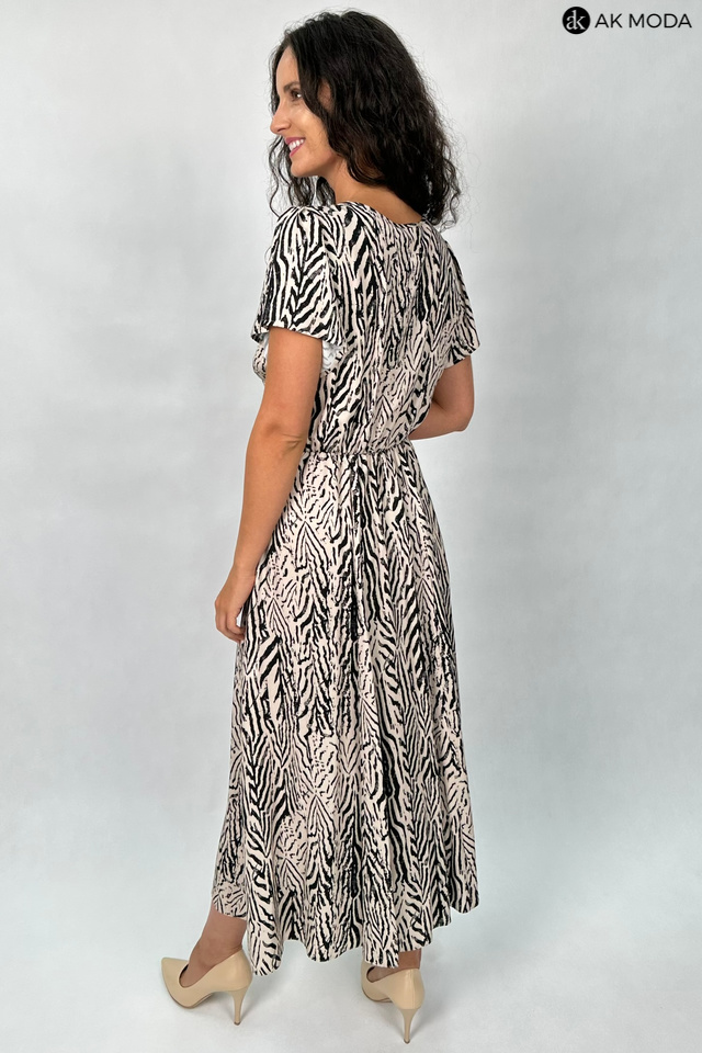 Rozkloszowana sukienka midi w beżowo - czarne wzory. Dekolt w szpic, z marszczeniem, krótkie luźne rękawki, w pasie z tyłu gumka.