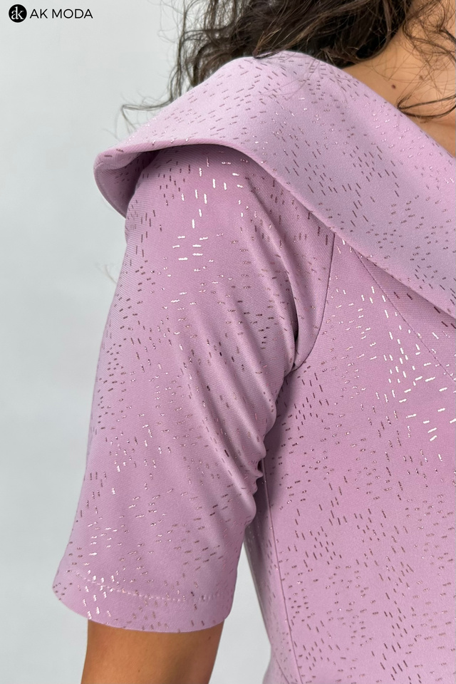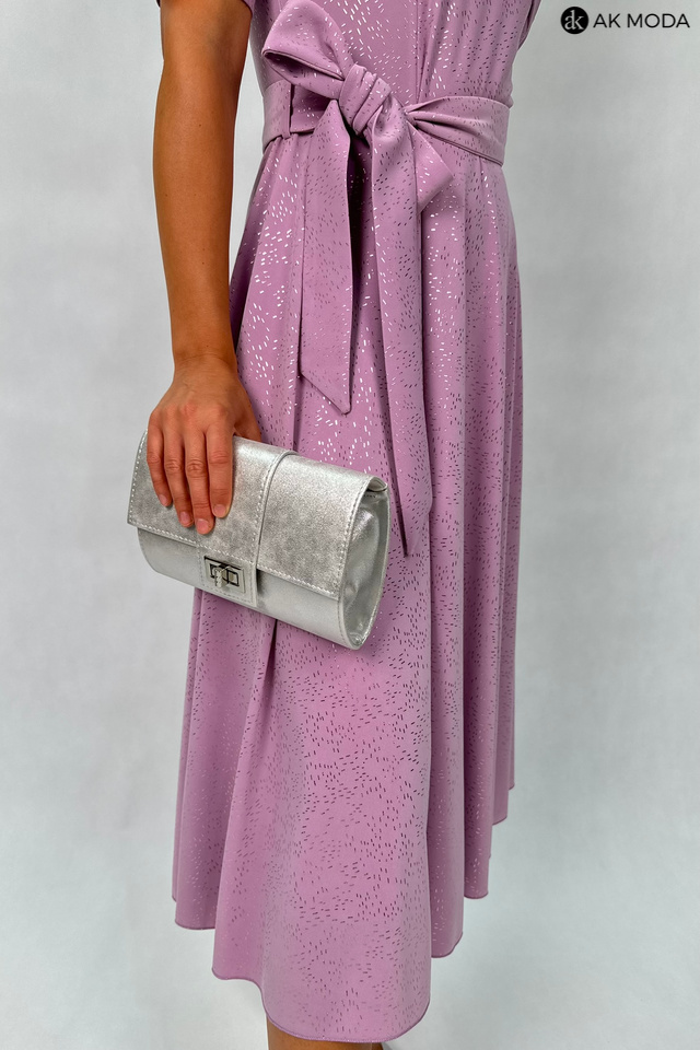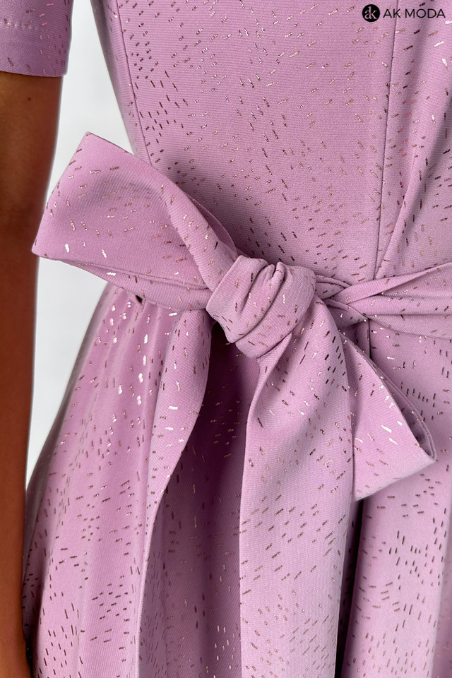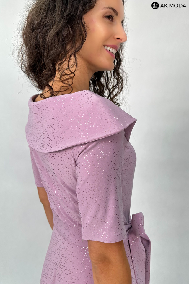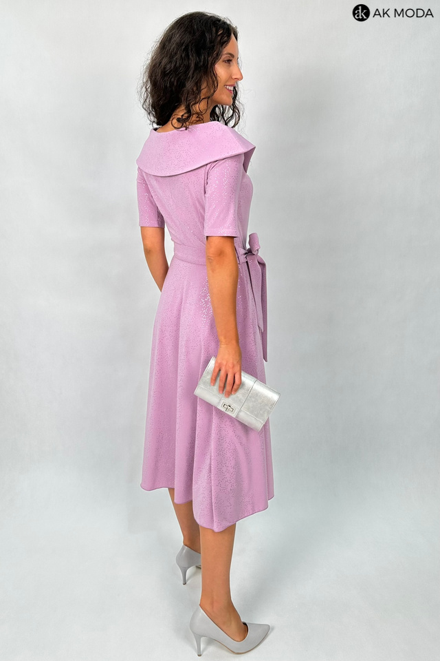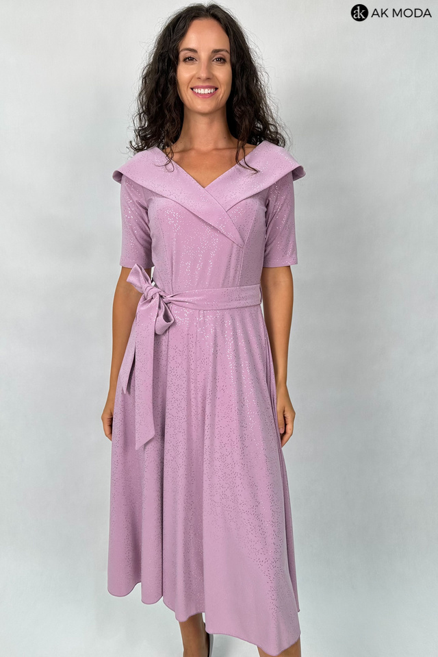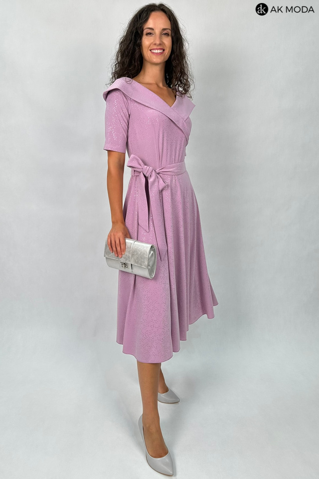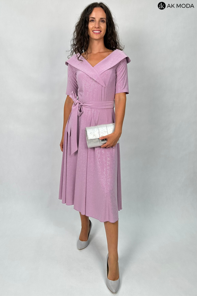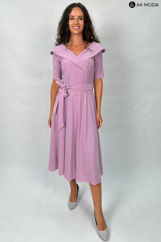 Rozkloszowana sukienka midi w kolorze jasnofioletowym, ozdobiona drobnymi, błyszczącymi elementami, które nadają jej połysk. Sukienka ma pasek w talii,dopasowaną górę i rozkloszowany dół, co nadaje jej elegancki i kobiecy fason oraz krótki rękaw i charakterystyczny dekolt z kołnierzem, który układa się w kształt litery "V".