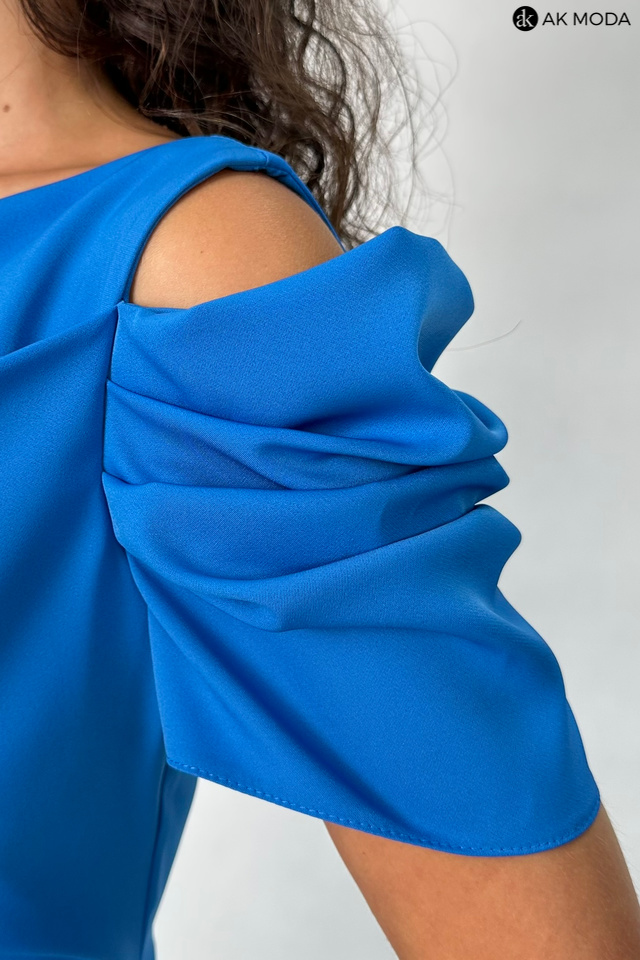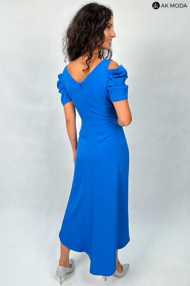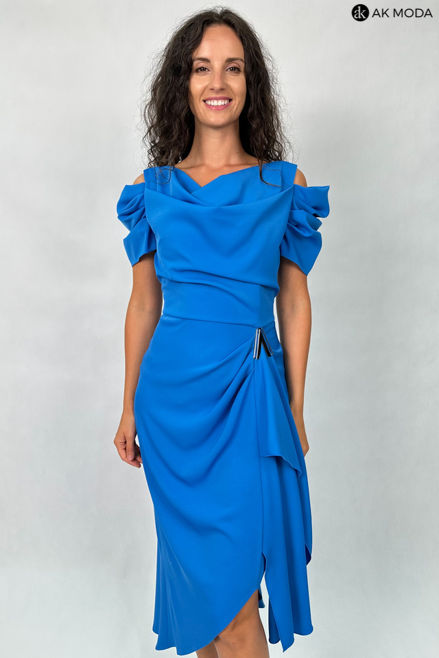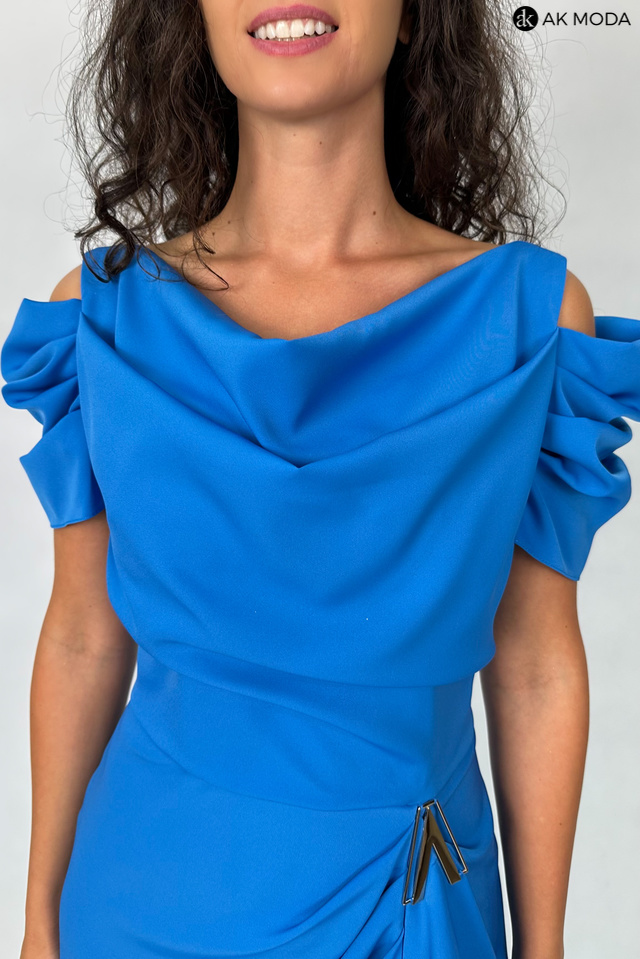 Asymetryczna sukienka midi w kolorze niebieskim z opadającymi ramionami. Dekolt typu "woda", na boku ozdobnie upięty luźny materiał.