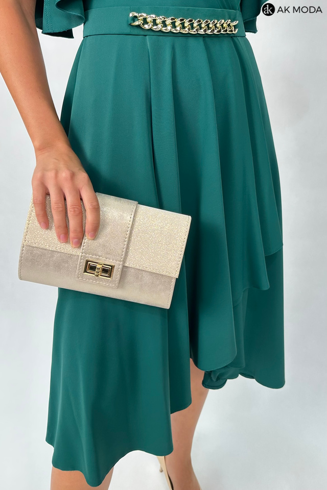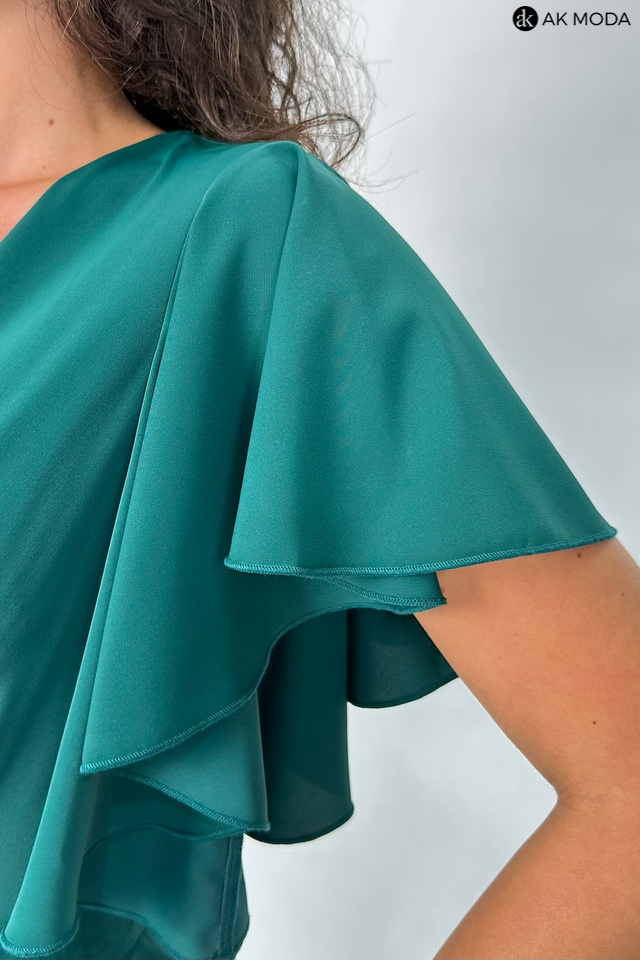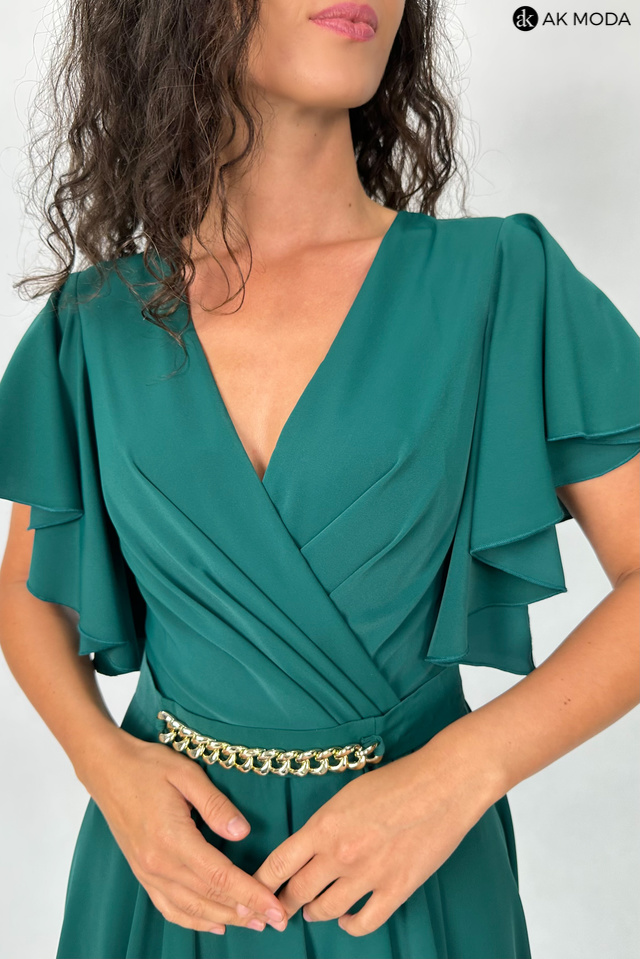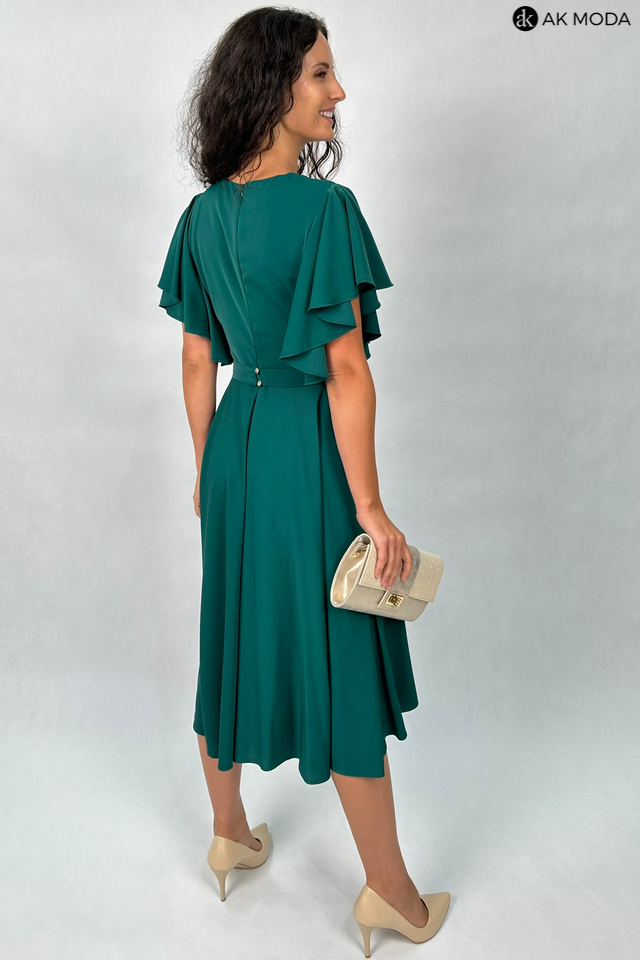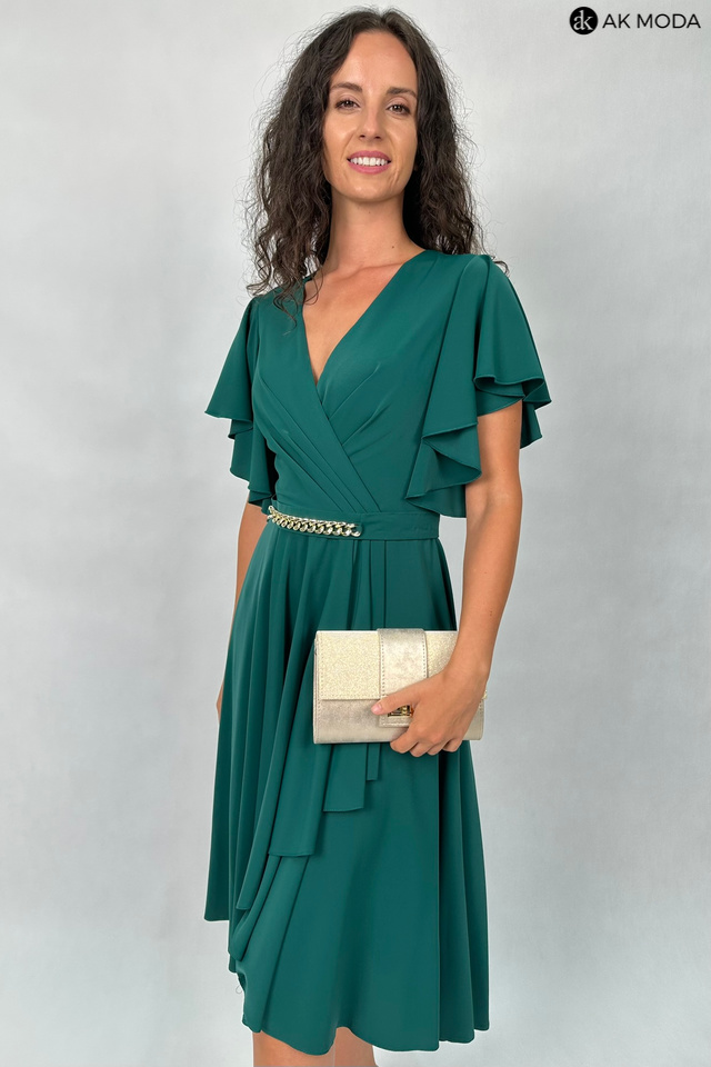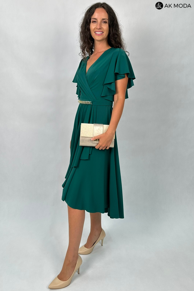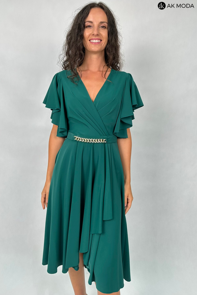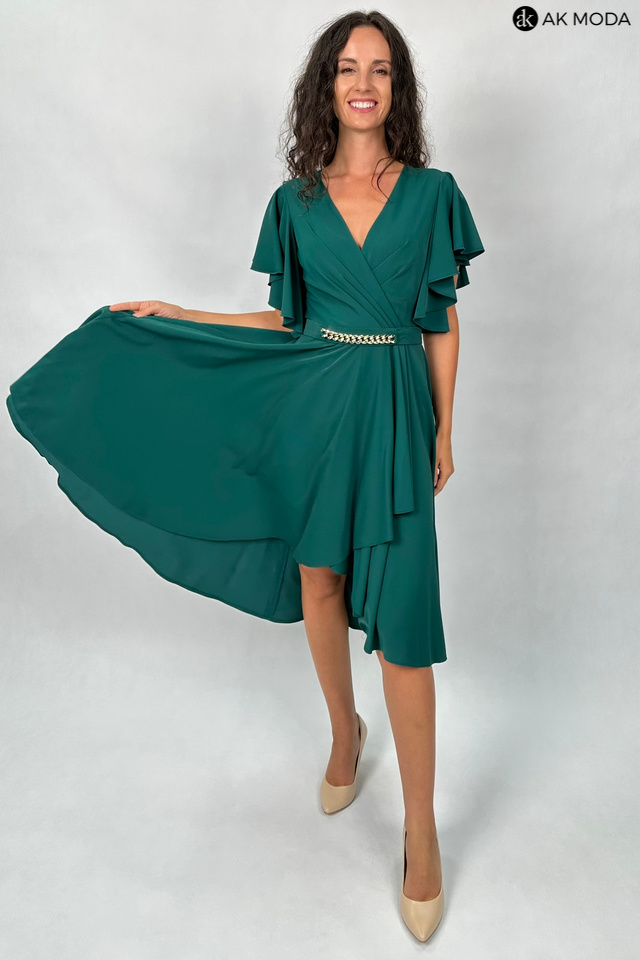 Rozkloszowana, asymetryczna sukienka w kolorze butelkowej zieleni. Dekolt kopertowy, krótkie rękawki w formie falbanki, w talii ozdobny pasek.