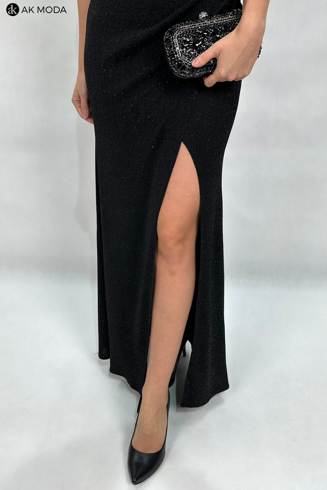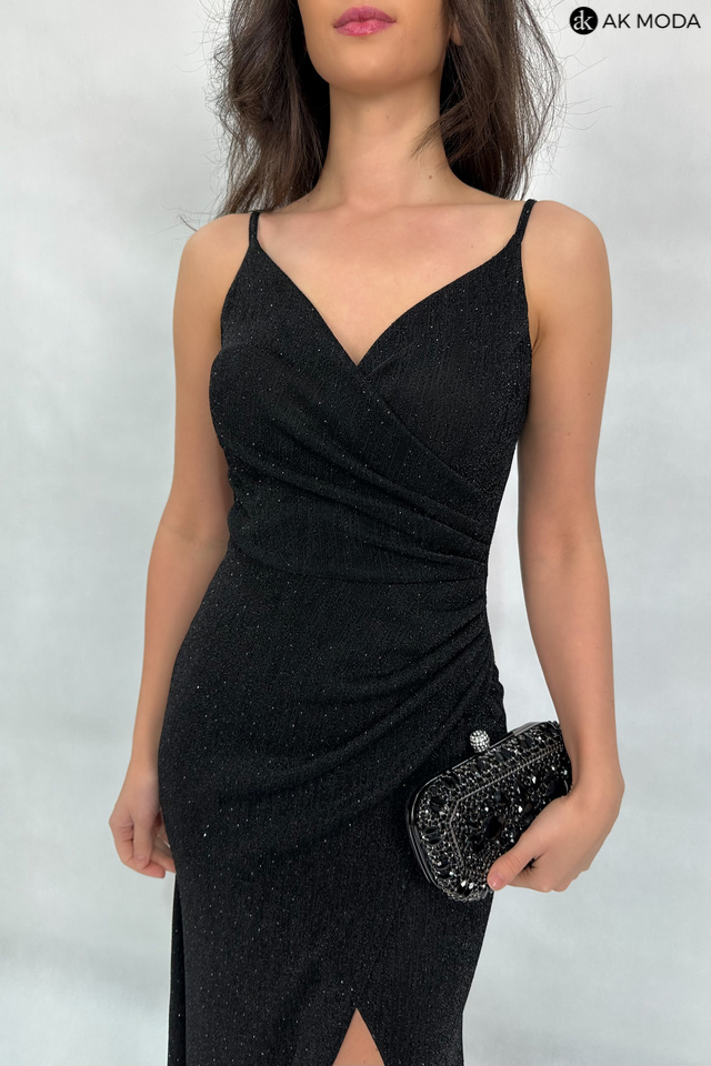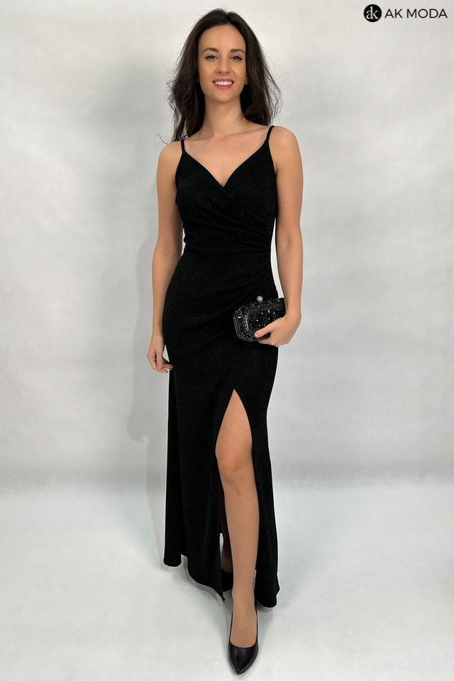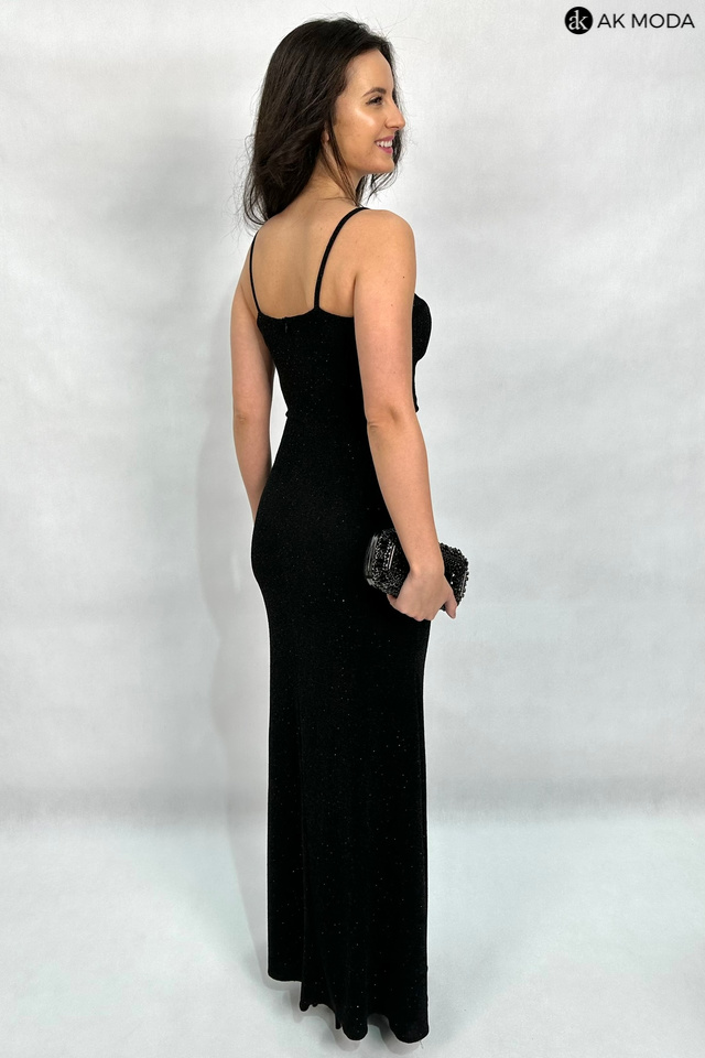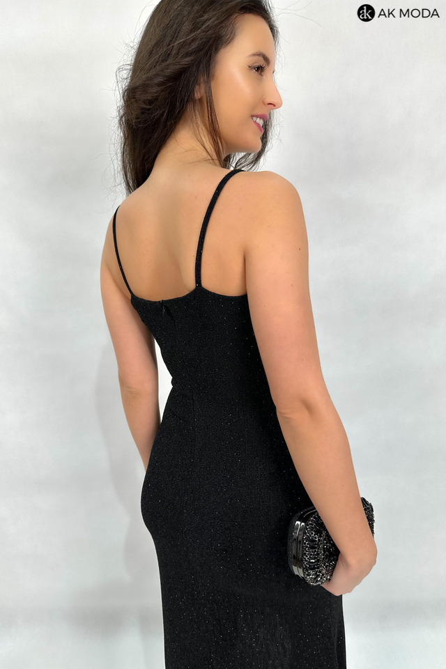 Prosta sukienka maxi na cienkich ramiączkach, w kolorze czarnym. Dekolt kopertowy, w pasie marszczenie, rozcięcie z boku. Sukienka uszyta z elastycznego materiału, w całości zdobiona błyszczącymi dżetami.