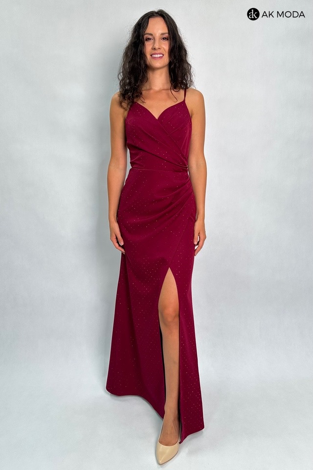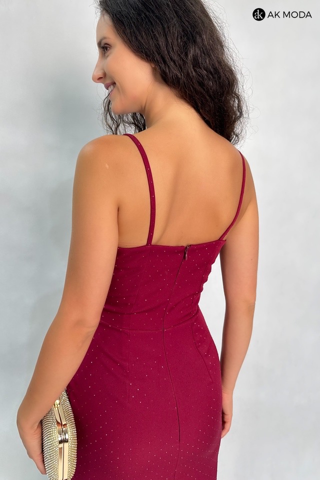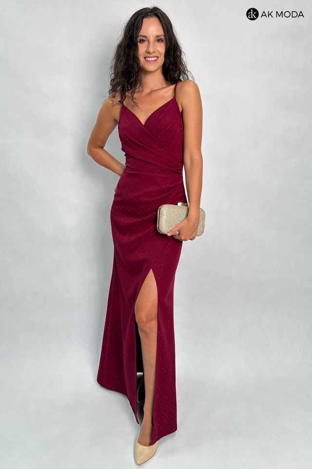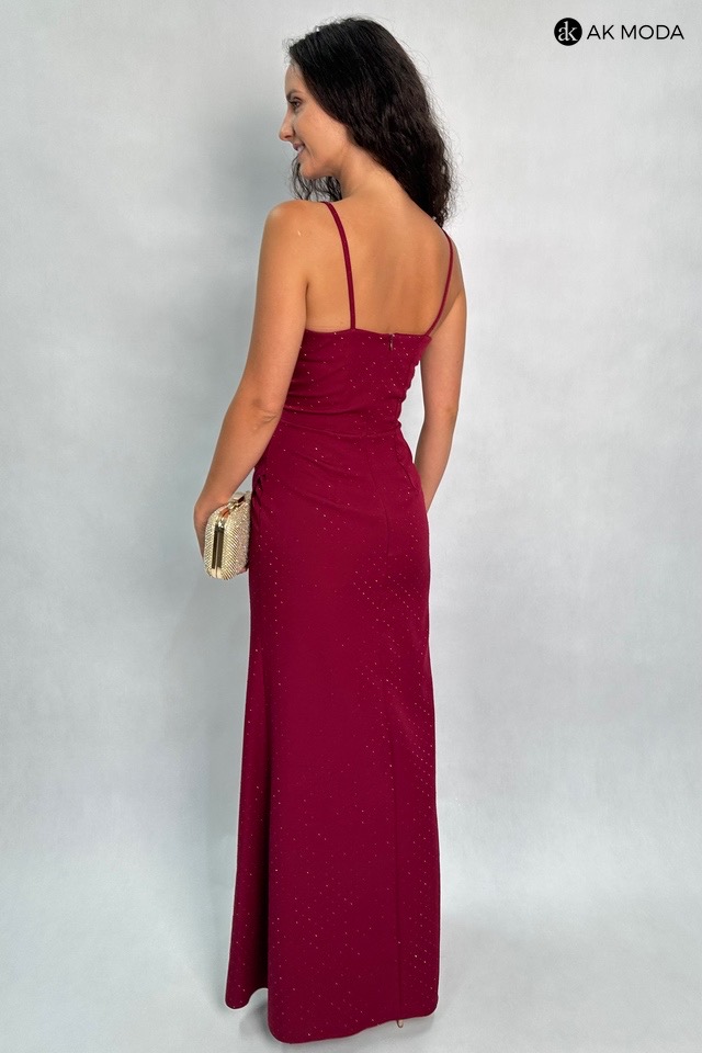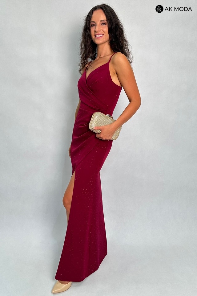 Prosta, długa sukienka na cienkich ramiączkach, w kolorze bordowym. Dekolt kopertowy, w pasie marszczenie, rozcięcie z boku. Sukienka ozdobiona jest błyszczącymi cyrkoniami, które subtelnie mienią się w świetle.