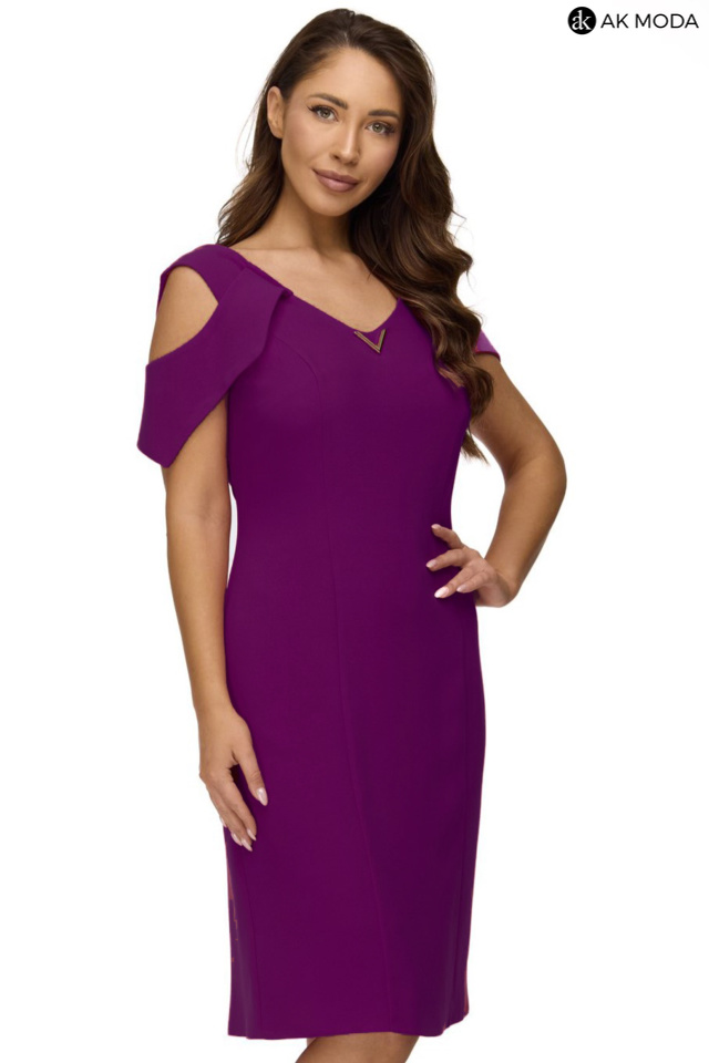 Elegancka, prosta sukienka w kolorze ciemnofioletowym o długości do kolan. Charakteryzuje się dekoltem w kształcie litery "V" oraz ozdobnymi wycięciami na ramionach, które nadają elegancki i nowoczesny wygląd.