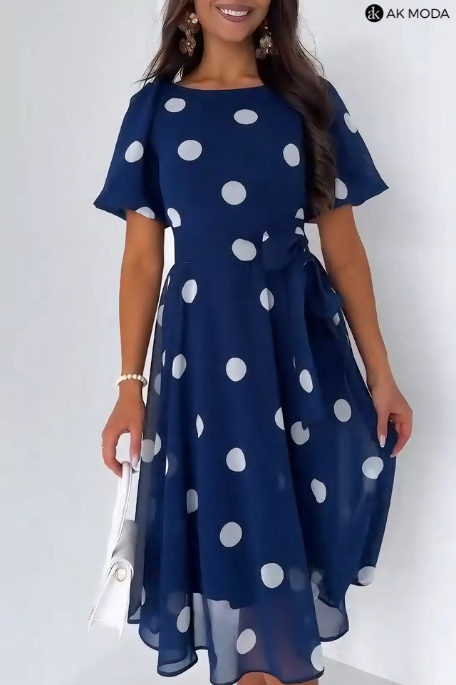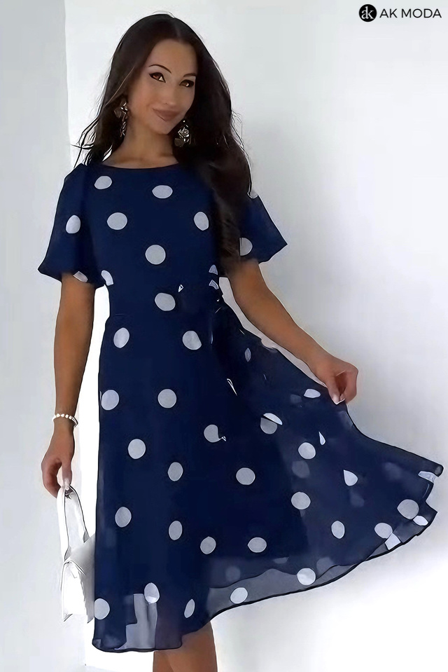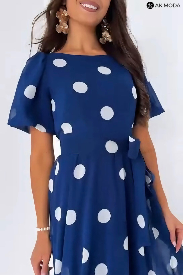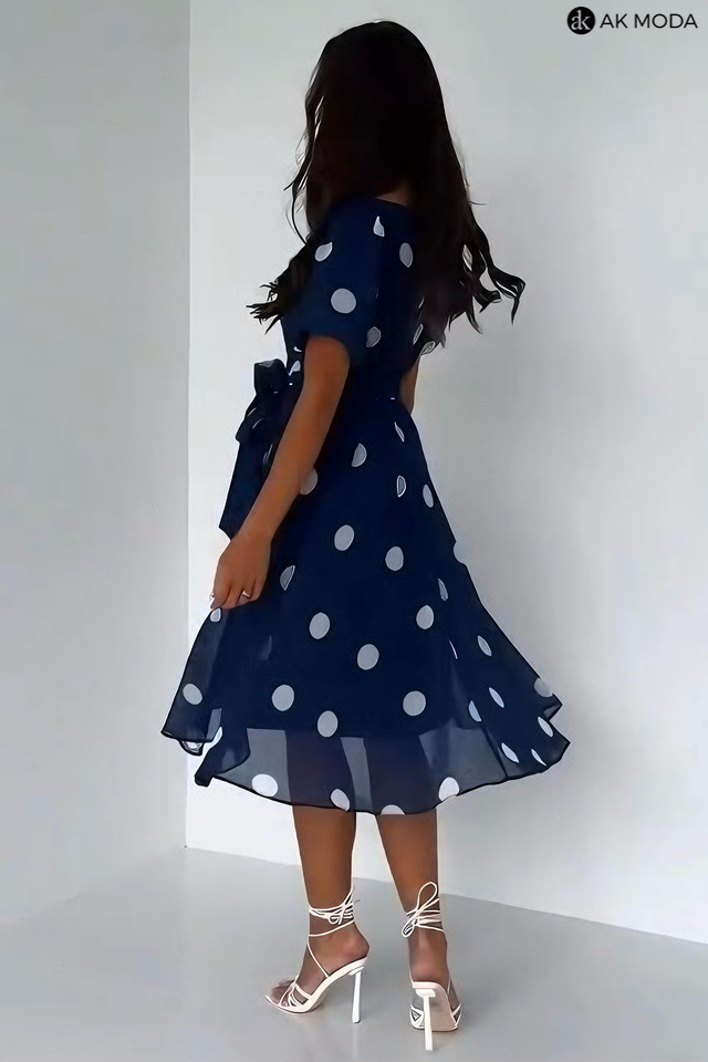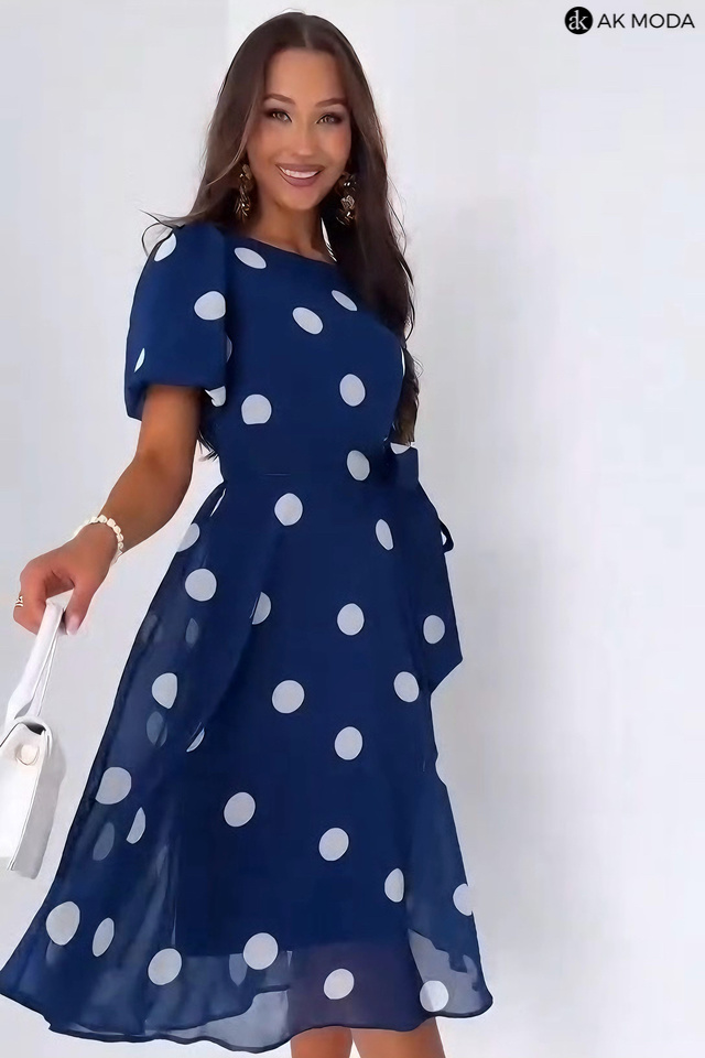 Rozkloszowana sukienka midi w kolorze granatowym w białe grochy z okrągłym dekoltem i lekko bufiastymi, krótkimi rękwami. W pasie z tyłu gumka, w talii wiązany pasek.