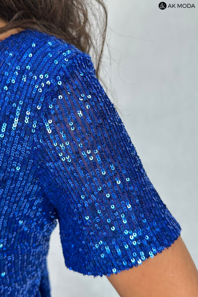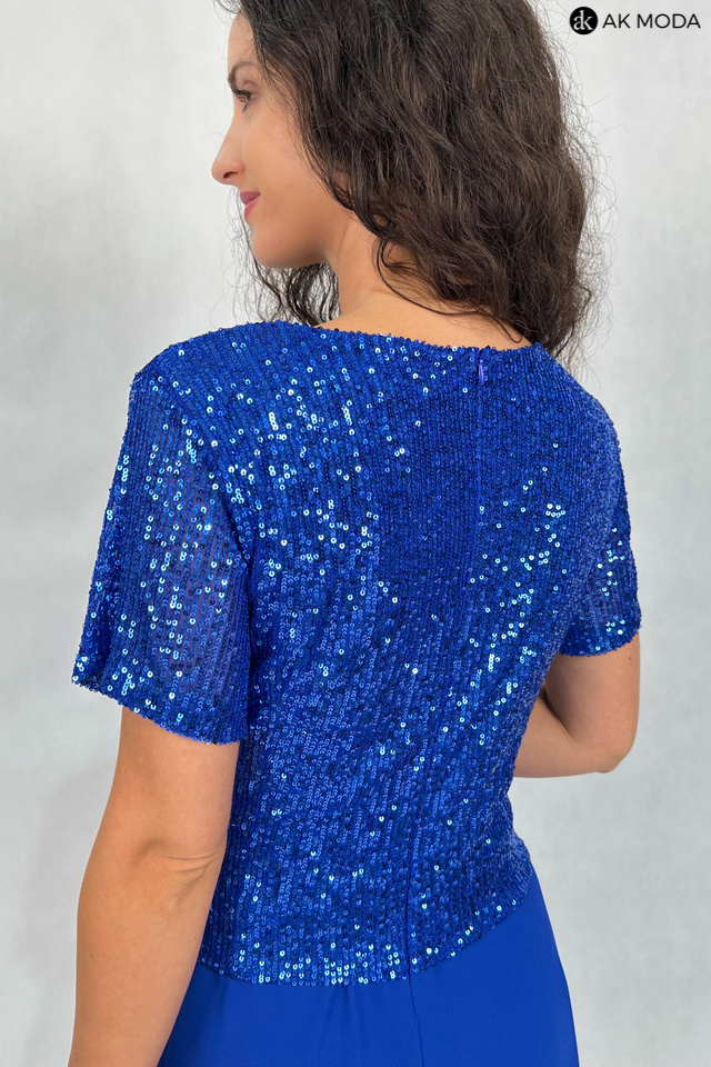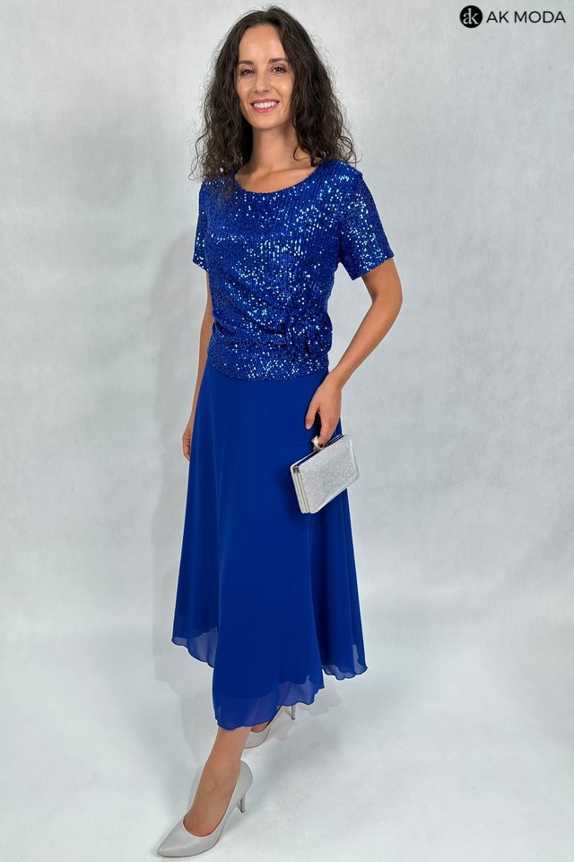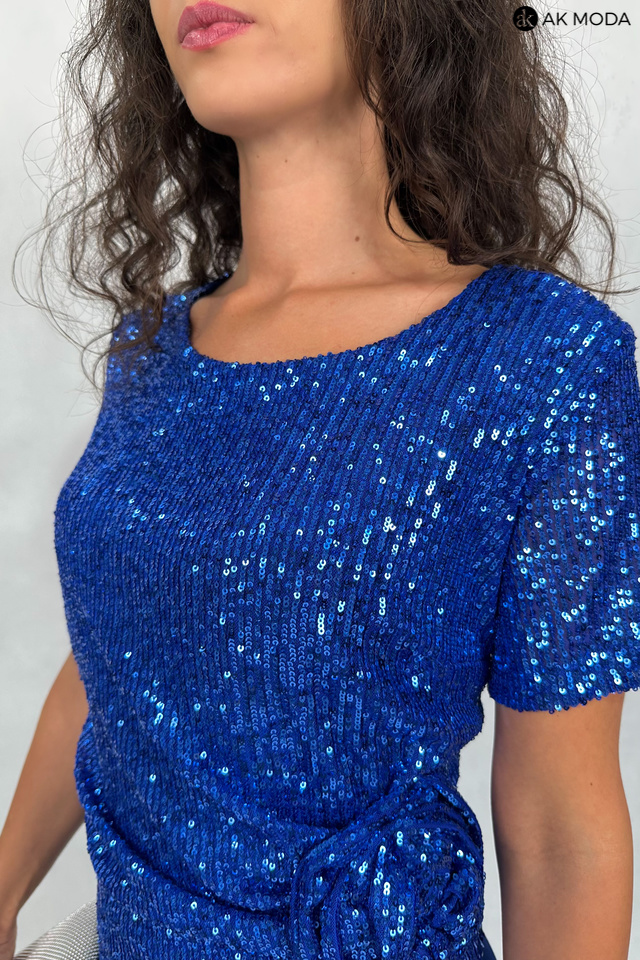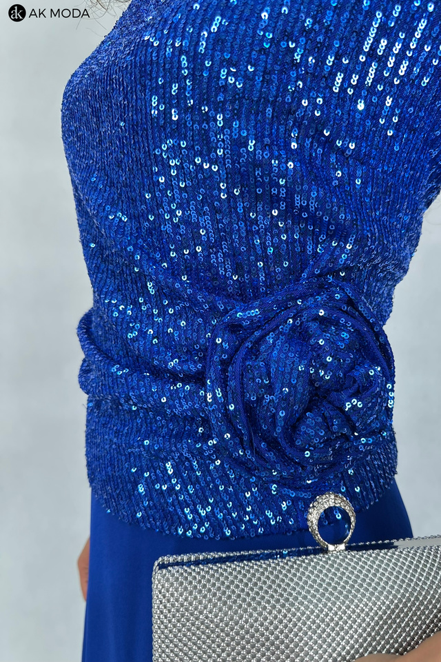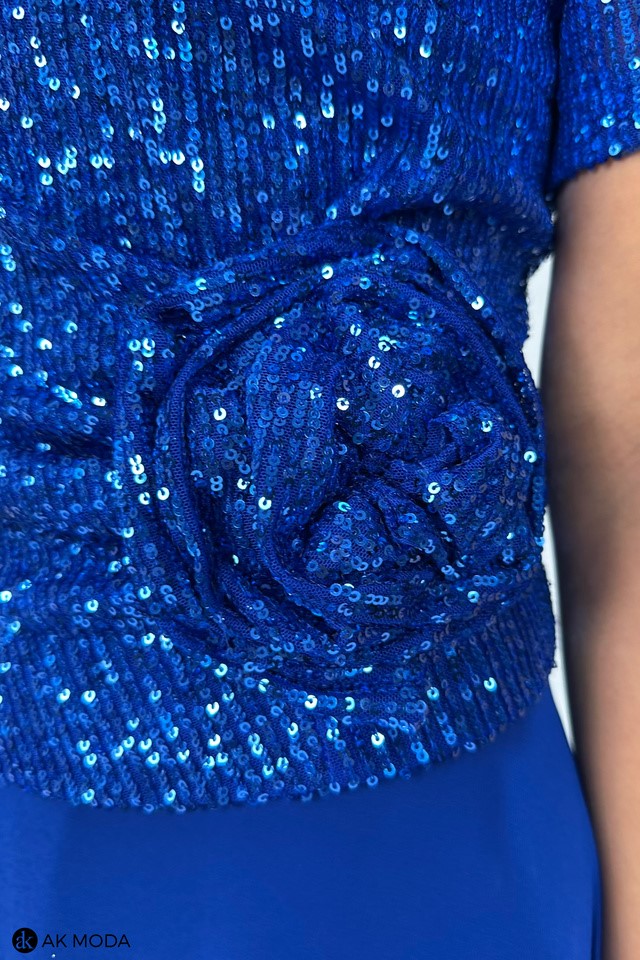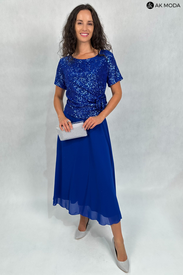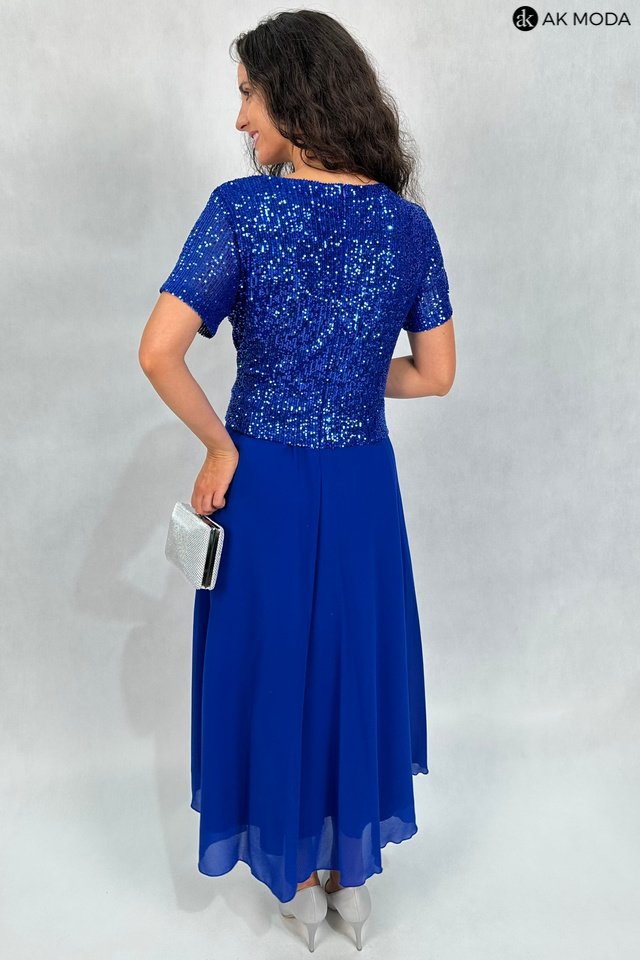 Długa, rozkloszowana sukienka w kolorze chabrowym z okrągłym dekoltem i krótkimi rękawami. Góra sukienki elastyczna, zdobiona cekinami, dół gładki.