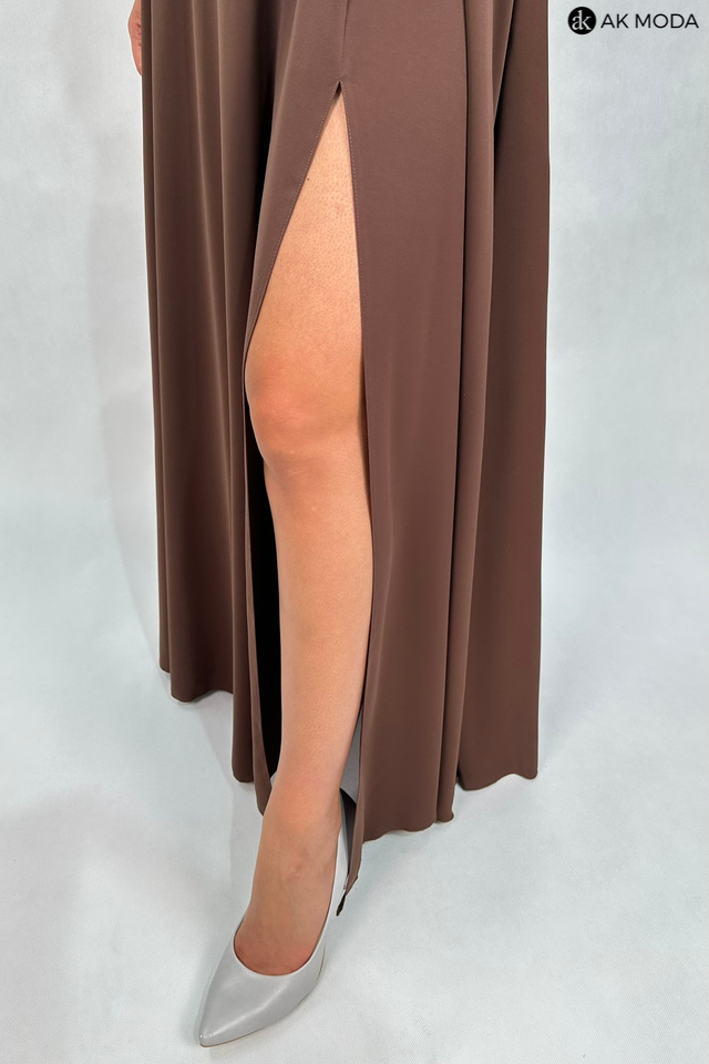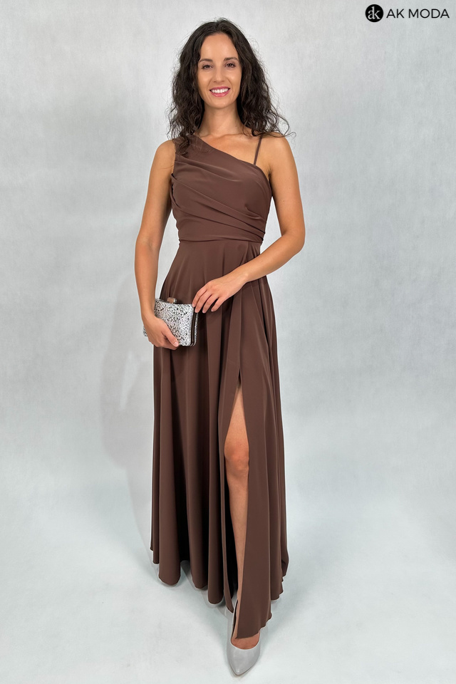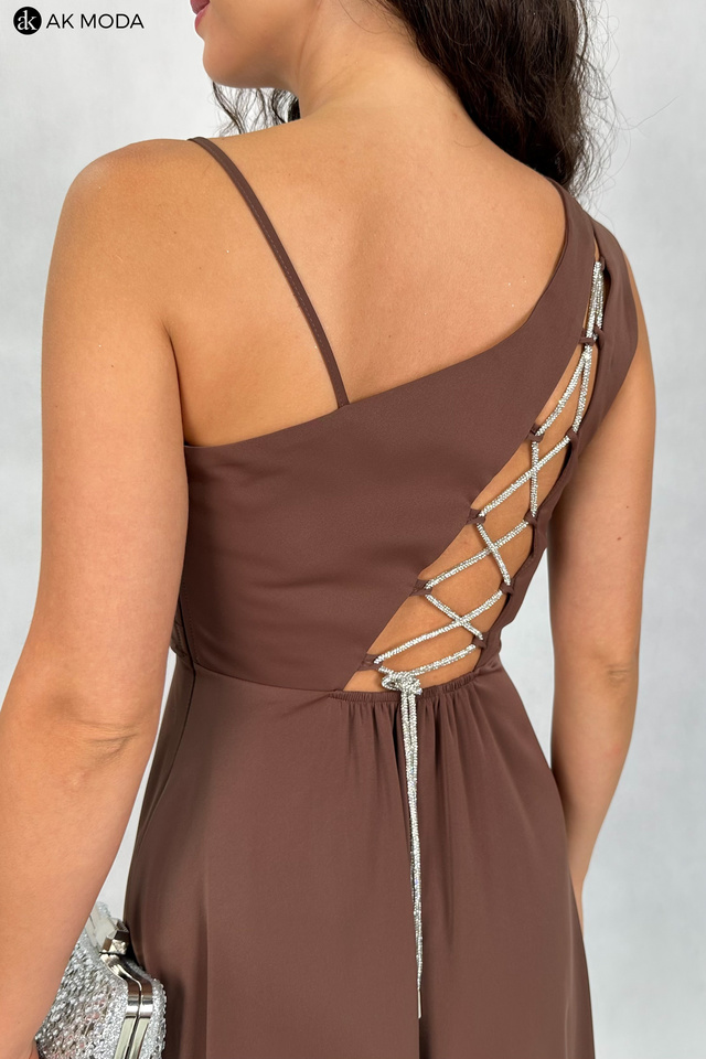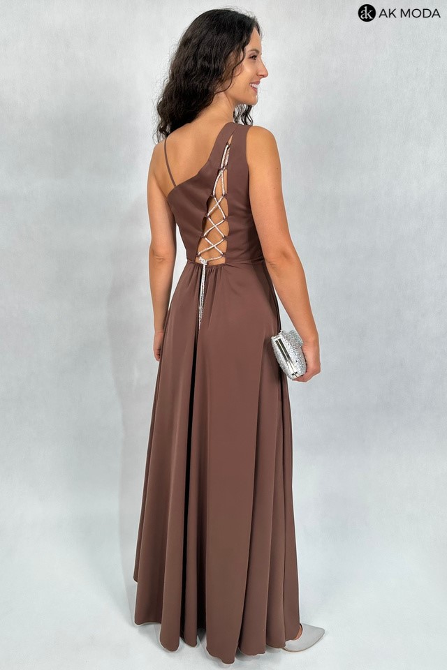 Elegancka sukienka maxi na jedno ramię, w kolorze brązowym, z efektownym sznurowaniem na plecach. Góra luźniejsza, dół rozkloszowany z rozcięciem na nadze, z tyłu w pasie gumka. W zestawie dwa sznurki do wiązania na plecach, ozdobny błyszczący oraz gładki, w kolorze sukienki.