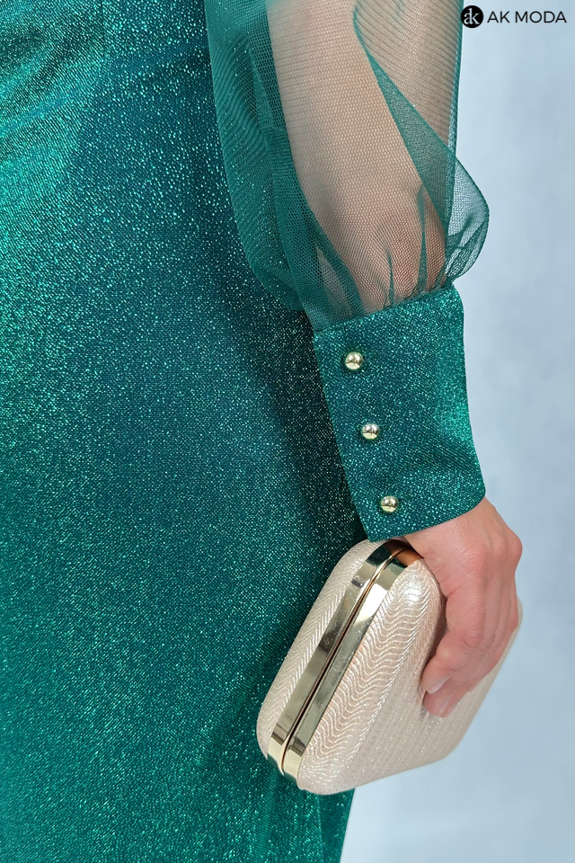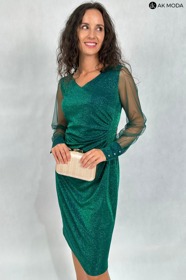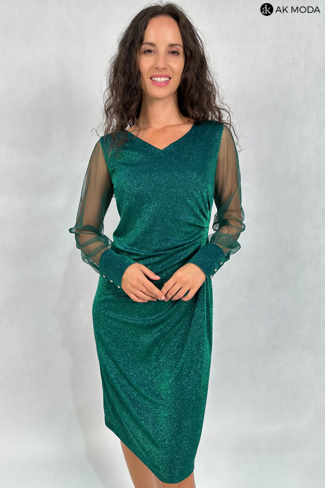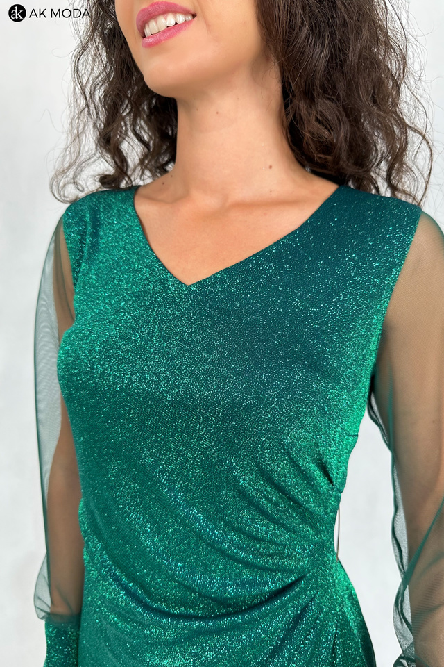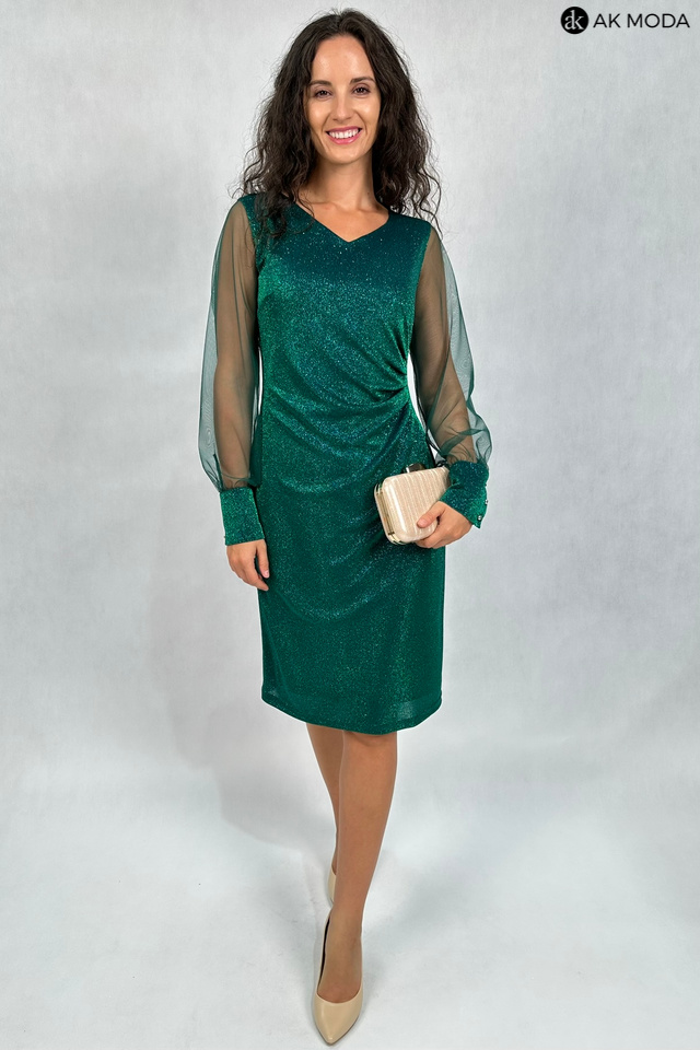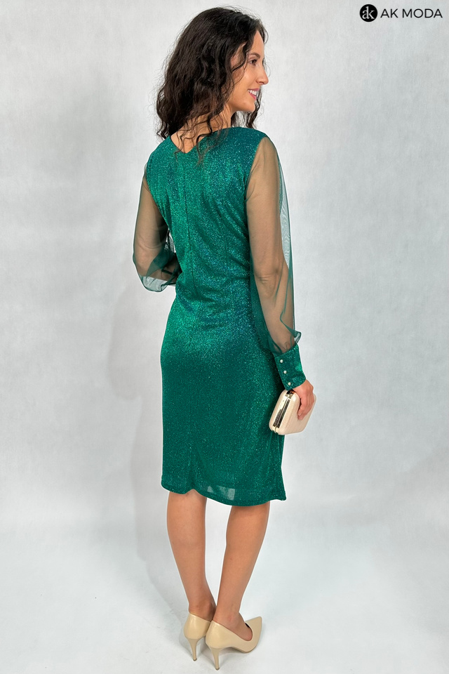 Elegancka sukienka w kolorze zielonym, uszyta z brokatowego, elastycznego materiału. Dekolt w szpic, tarnsparentne długie rękawy zakończone mankietami, w talii, na boku marszczenie.