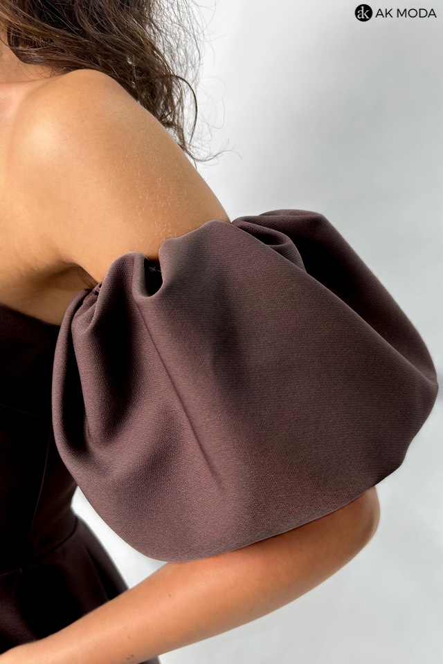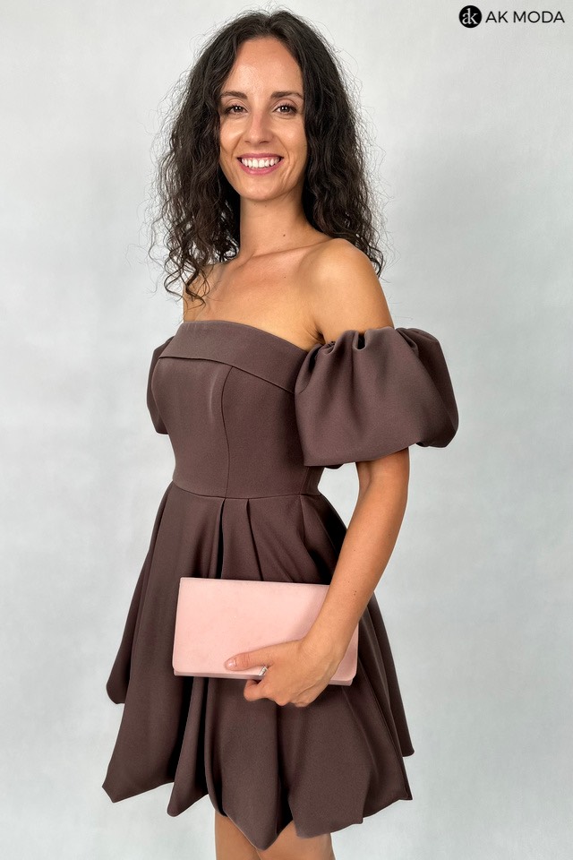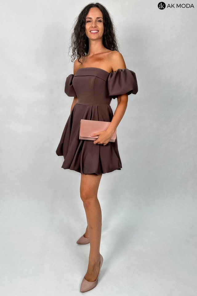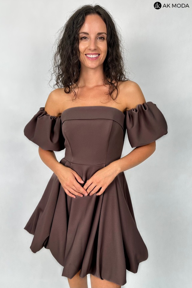 Ciemnobrązowa sukienka mini typu "bombka" na cienkich, odpinanych ramiączkach. W zestawie osobne bufiaste rękawki. Sukienka posiada wszyte fiszbiny.