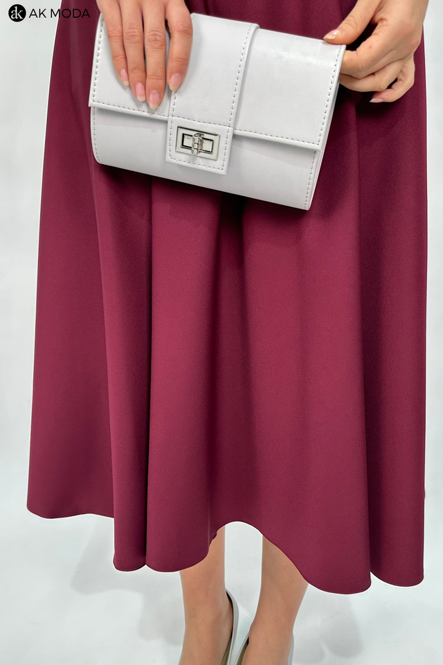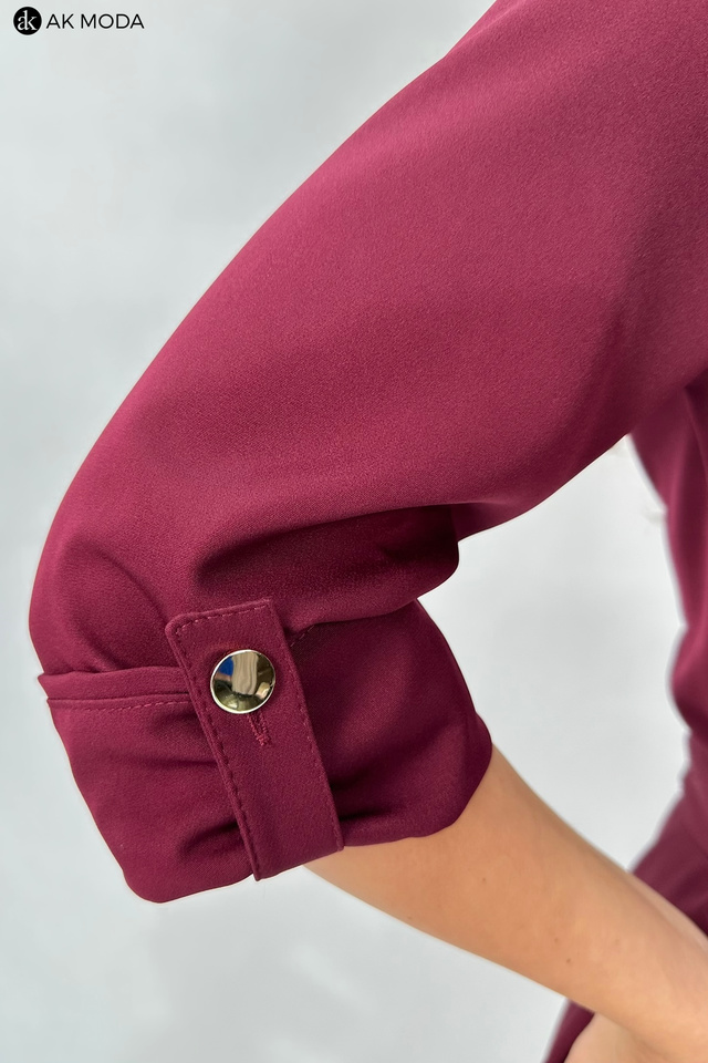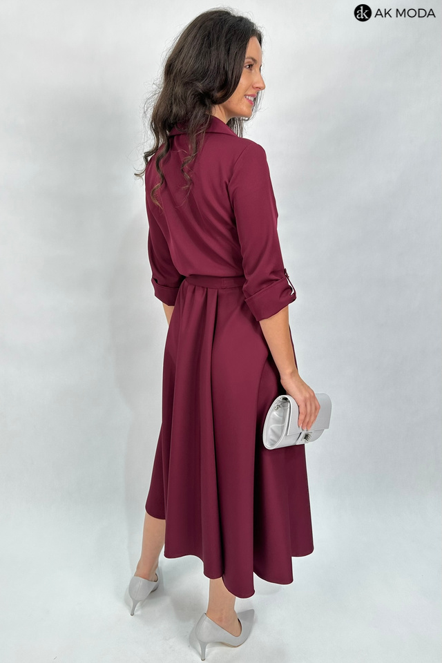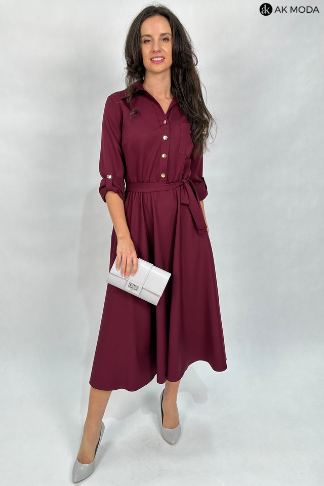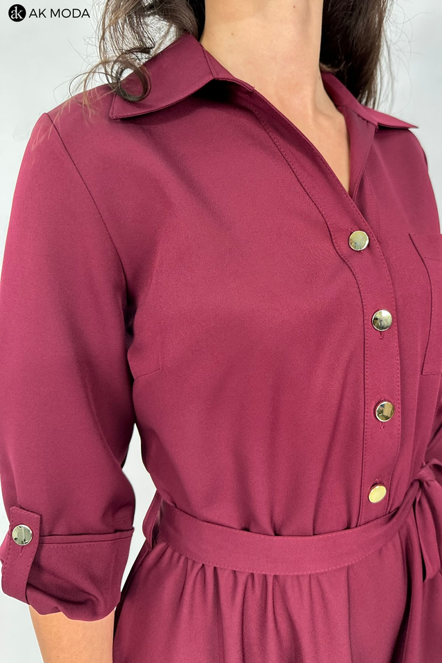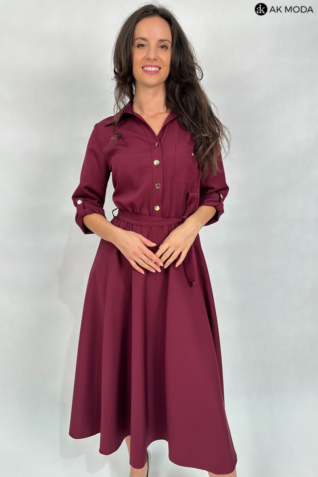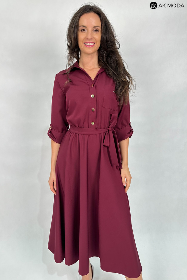 Elegancka sukienka midi w kolorze fioletowym. Górna część z kołnierzem i zapięciem na guziki, rękawy 3/4 odwijane, w pasie gumka i pasek. Fason rozkloszowany z kieszeniami.