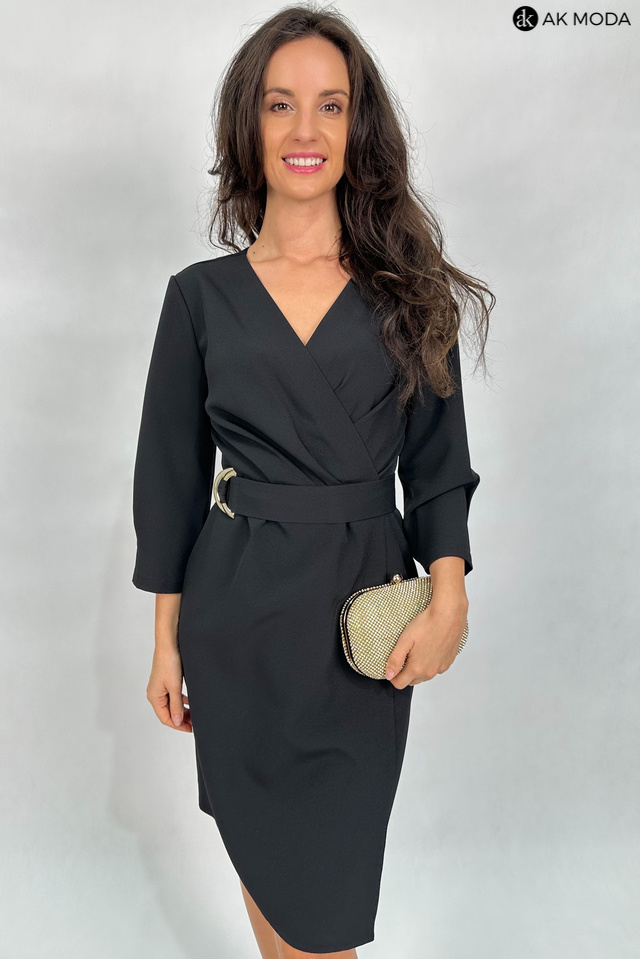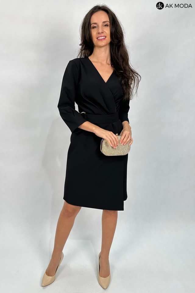Elegancka czarna sukienka z kopertowym dekoltem i rękawami 3/4. Fason odcinany w talii z asymetrycznym zakładanym dołem.