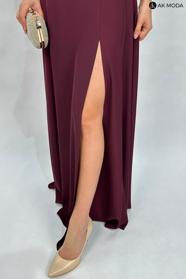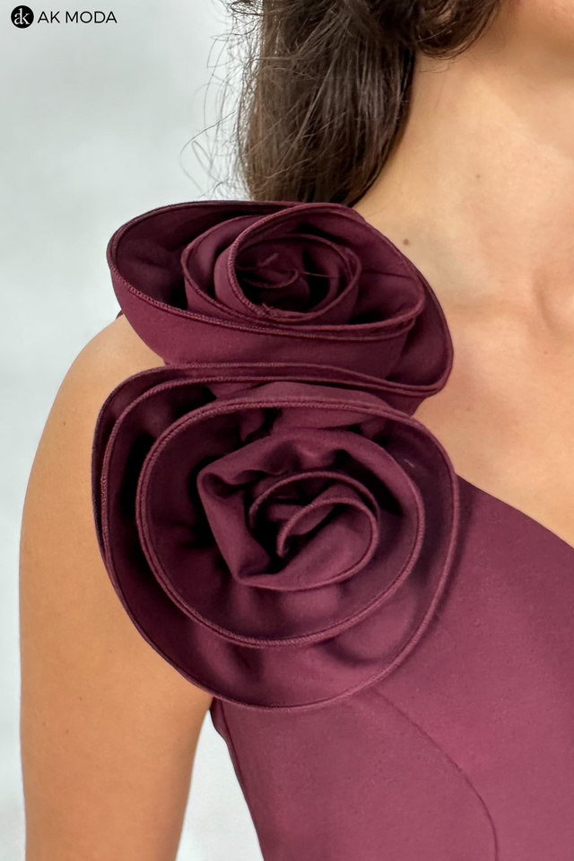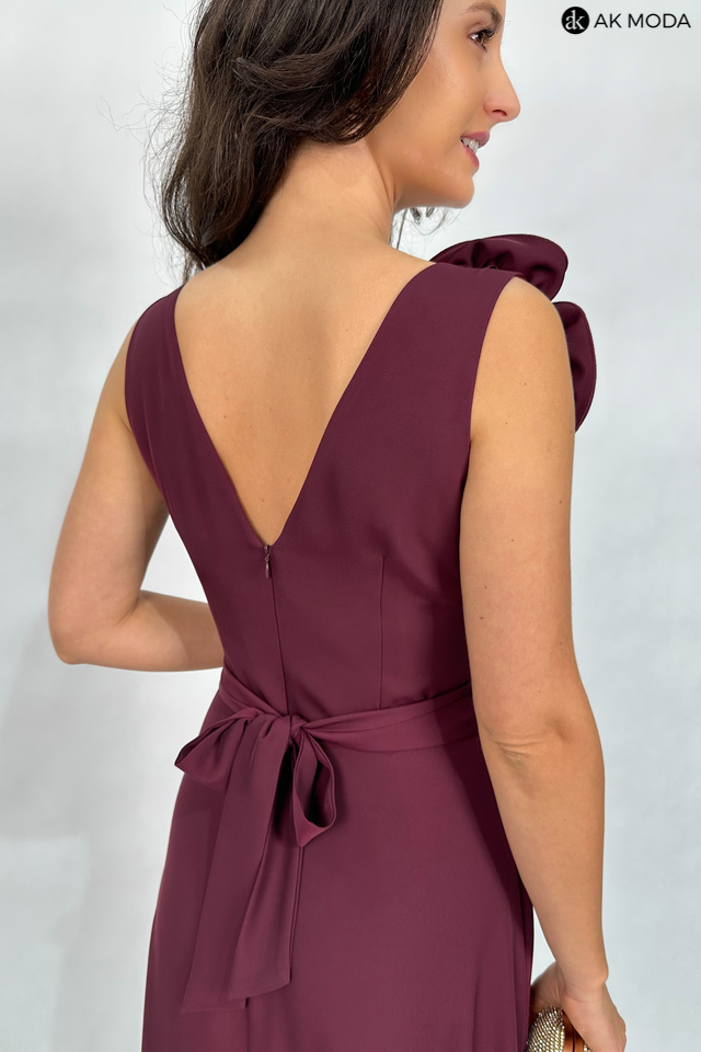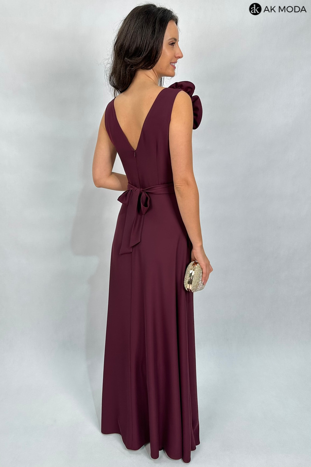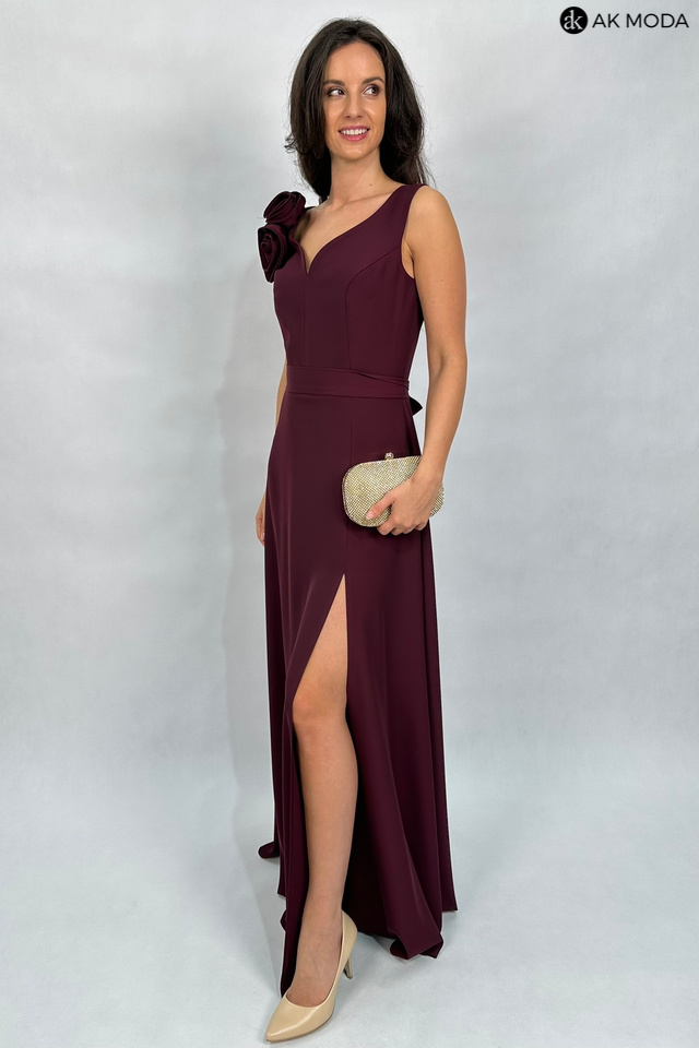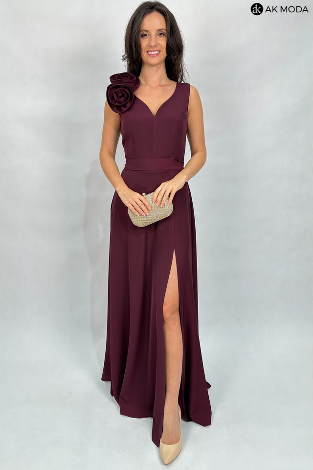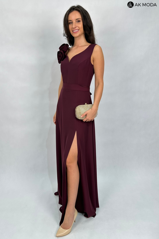 Długa, rozkloszowana sukienka w kolorze oberżyny z rozcięciem z boku. Dekolt w szpic, na ramieniu odpinany ozdobny kwiat, w talii wiązany pasek.