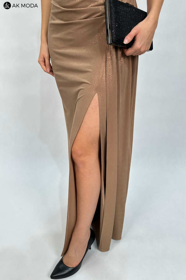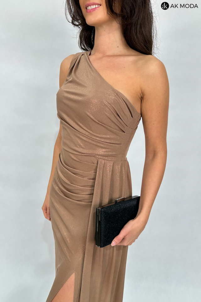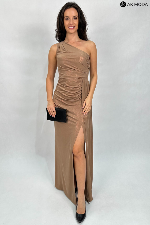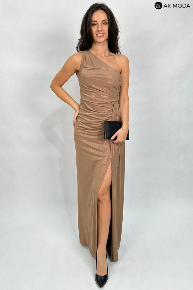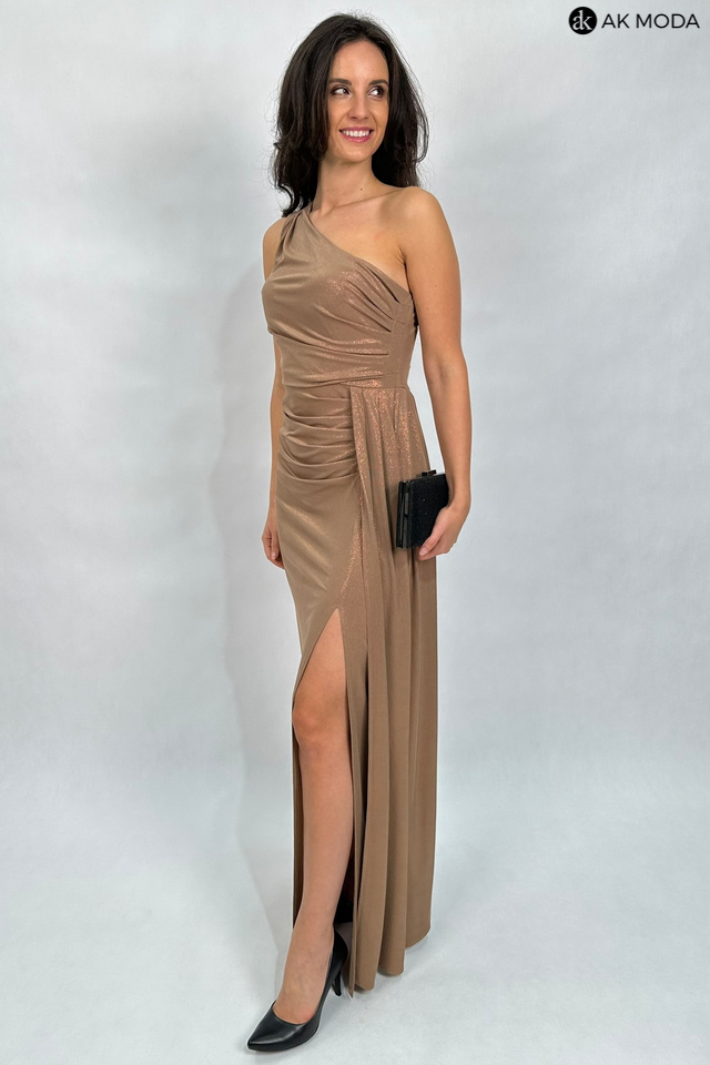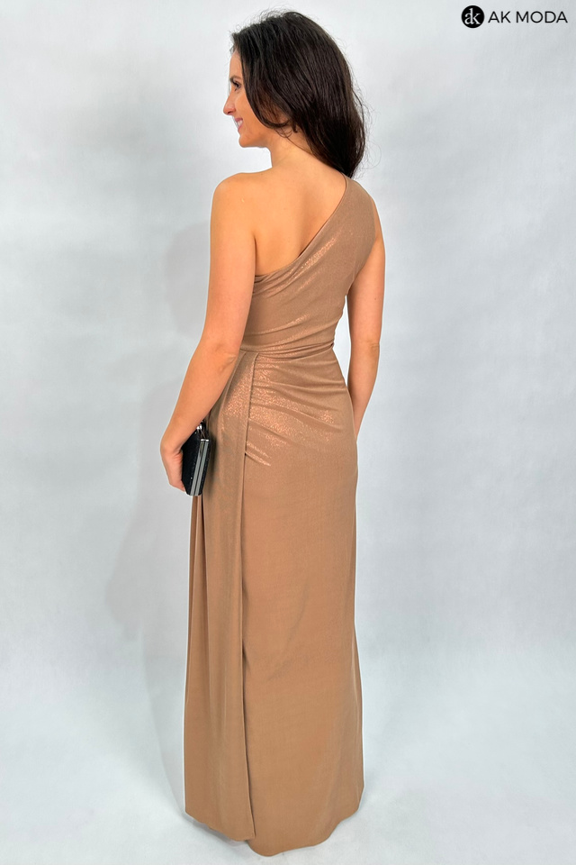 Elegancka długa sukienka na jedno ramię w kolorze beżowym z delikatnym połyskiem, uszyta z elastycznego materiału. Z boku efektowne marszczenie, rozcięcie na nodze.