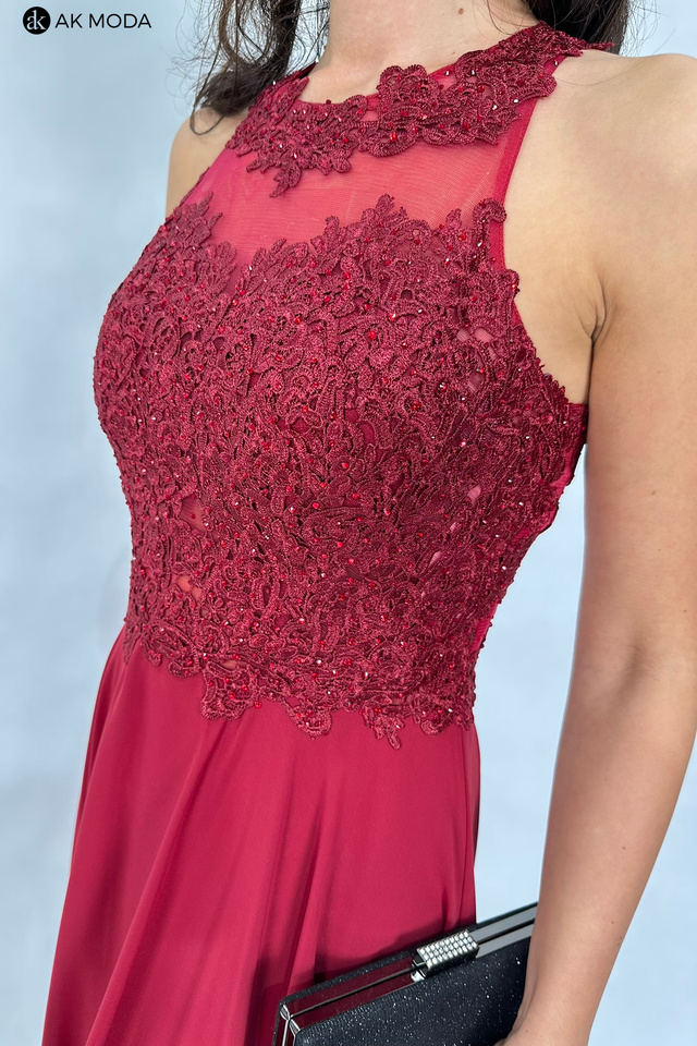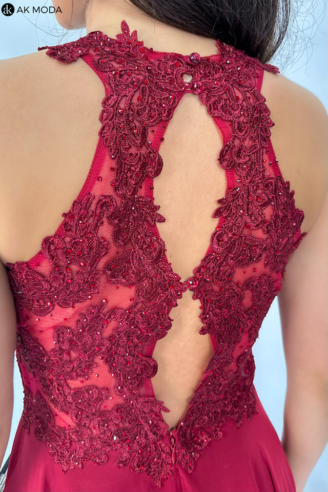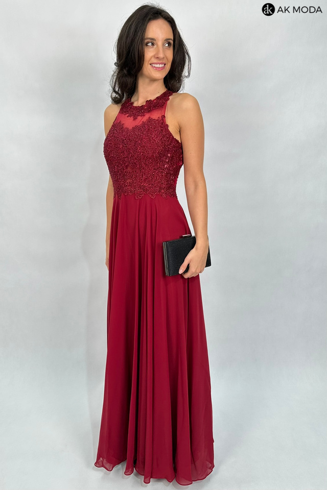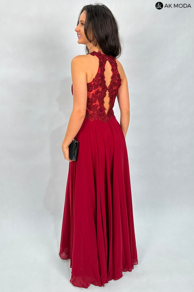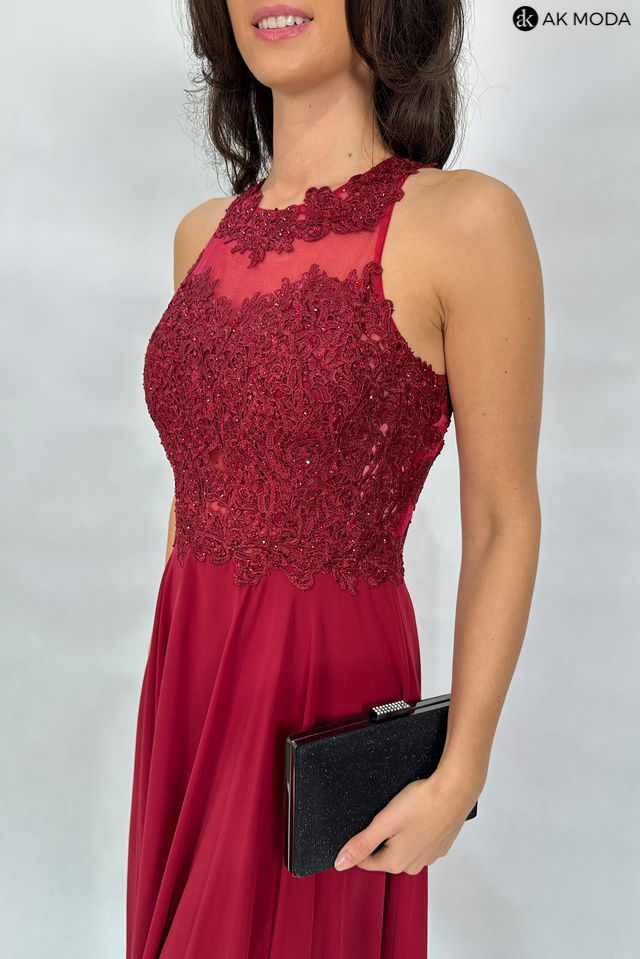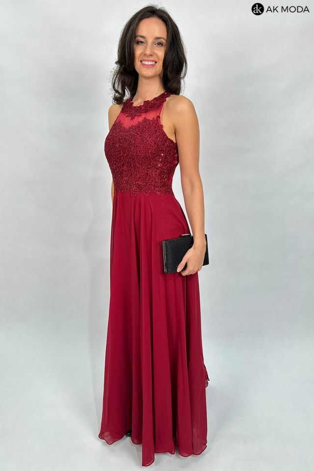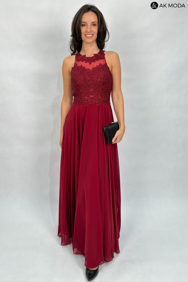 Długa rozkloszowana sukienka w kolorze bordowym z efektownym wycięciem na plecach. Góra sukienki zdobiona koronką i błyszczącymi cyrkoniami. Sukienka posiada wszyte miseczki.
