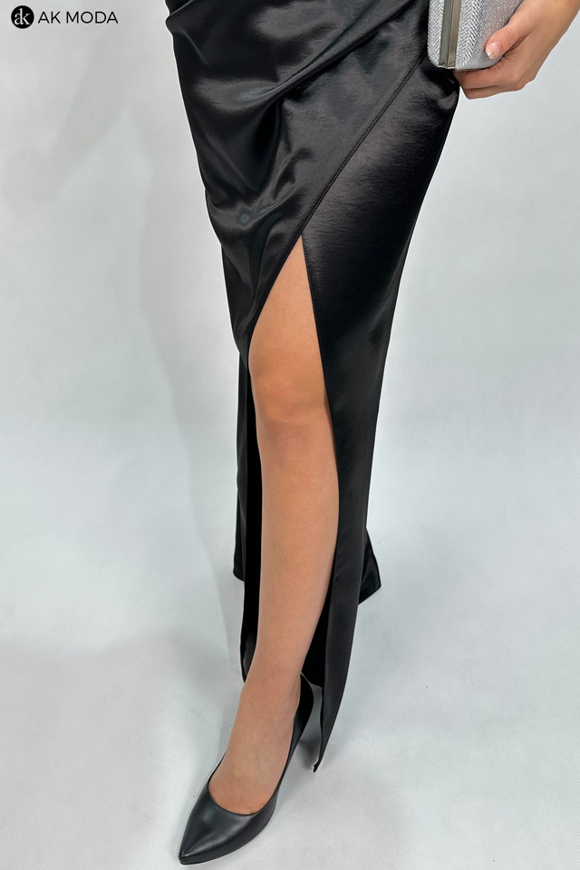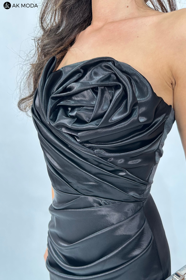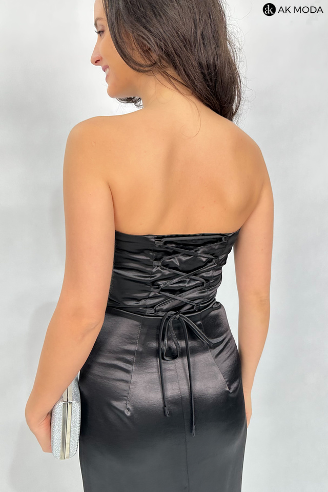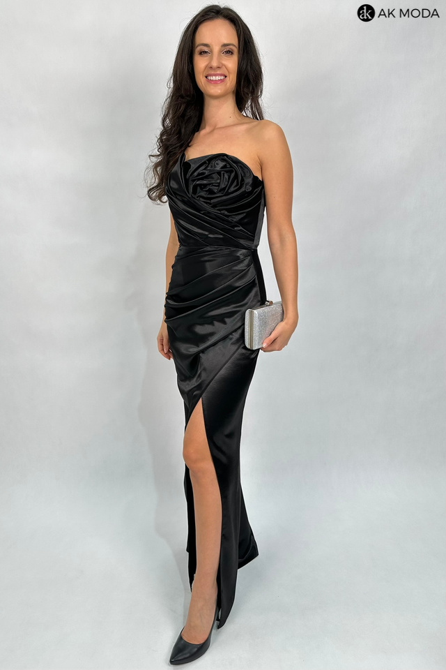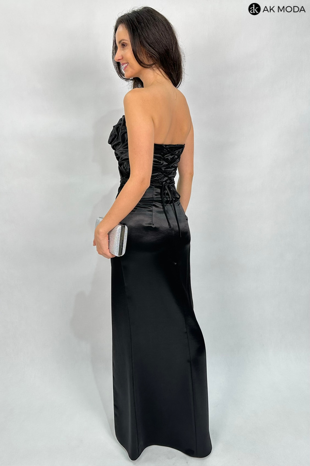 Długa, dopasowana sukienka bez ramiączek w kolorze czarnym, uszyta z satynowego materiału. Góra sukienki z efektownie upietym materiałem na kształt róży, dół z rozcięciem na nodze i marszczeniem z boku. Na biuście, od wewnetrznej strony silikonowa taśma, która pomaga utrzymać sukienkę na miejscu, na plecach wiązanie, umożliwiające dopasowanie sukienki.