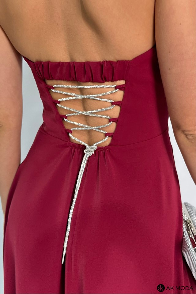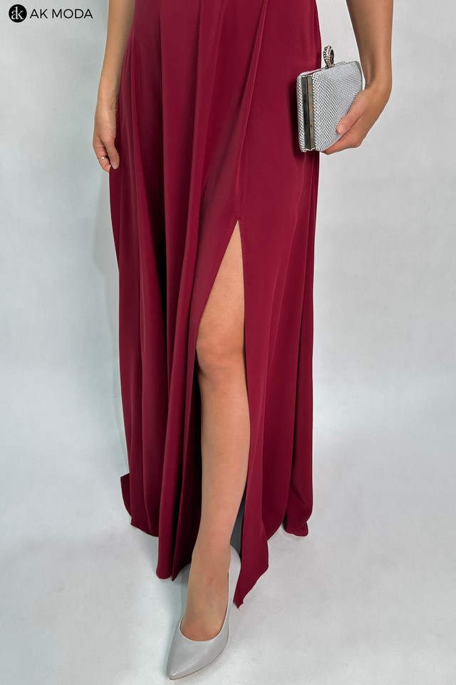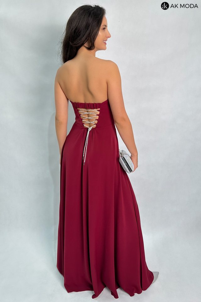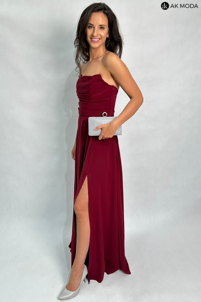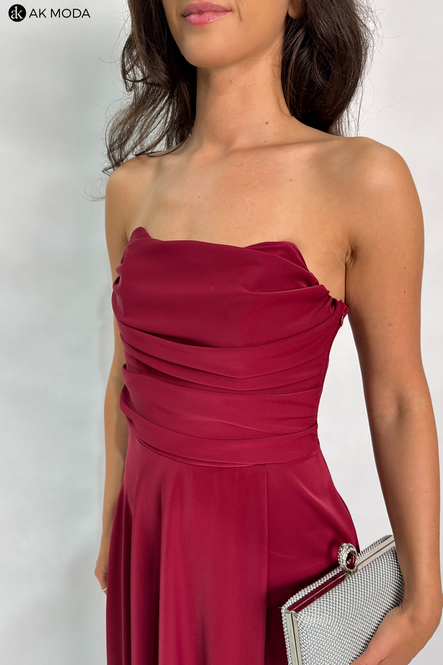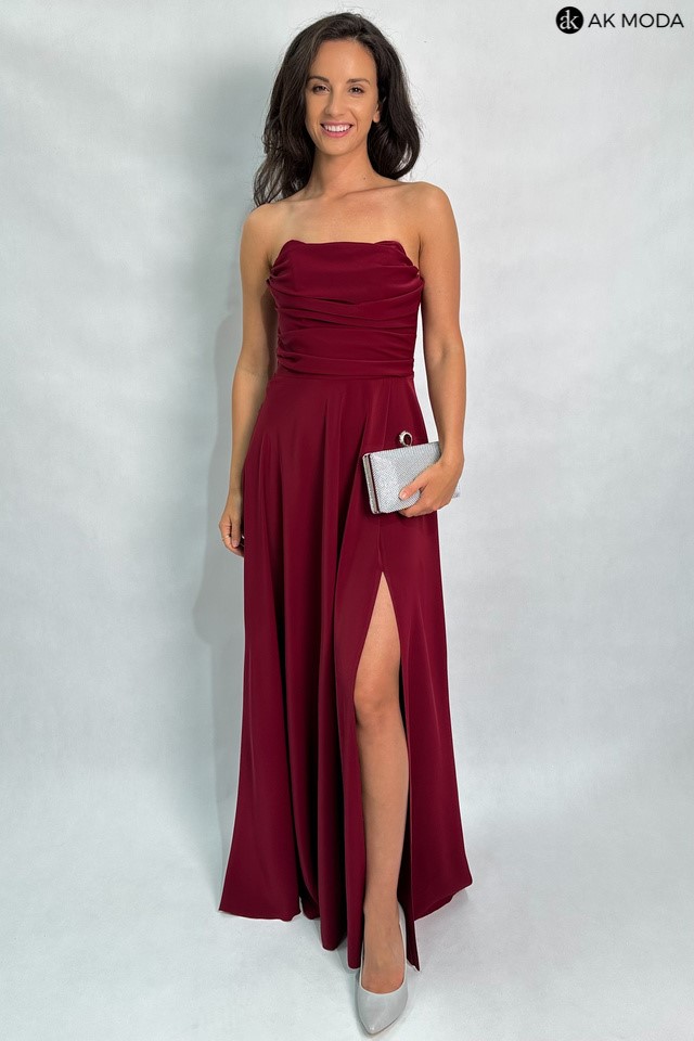 Długa rozkloszowana sukienka w kolorze bordowym z efektownym wiązaniem i gumką na plecach. Góra gorsetowa z marszczeniem, na nodze rozcięcie. W zestawie dopinane ramiączka.