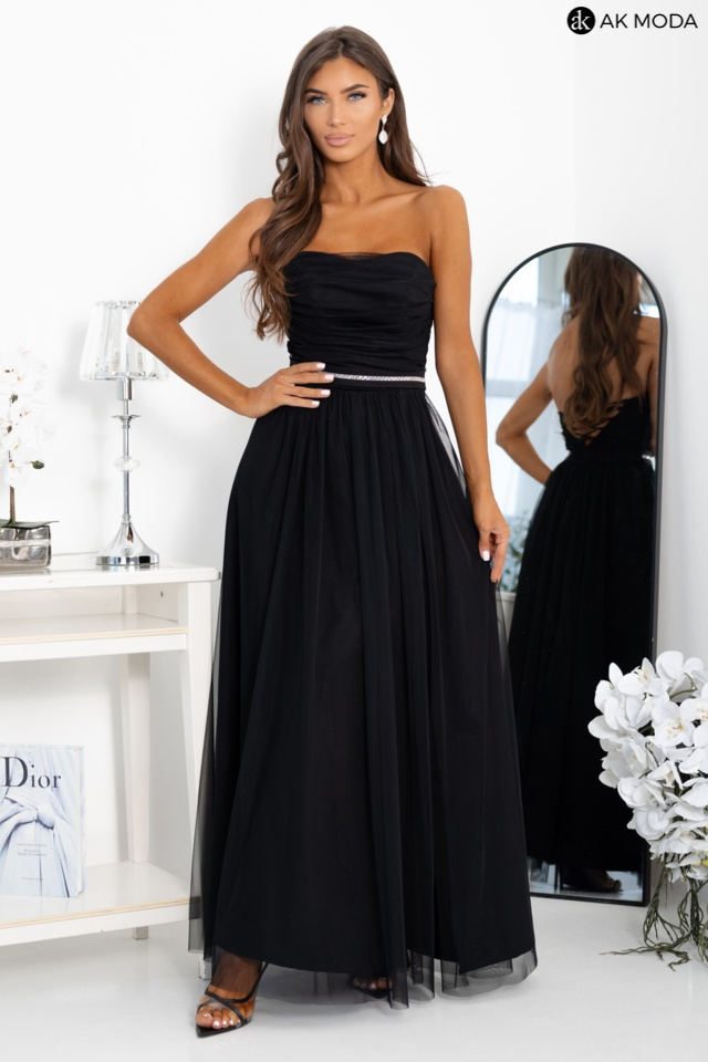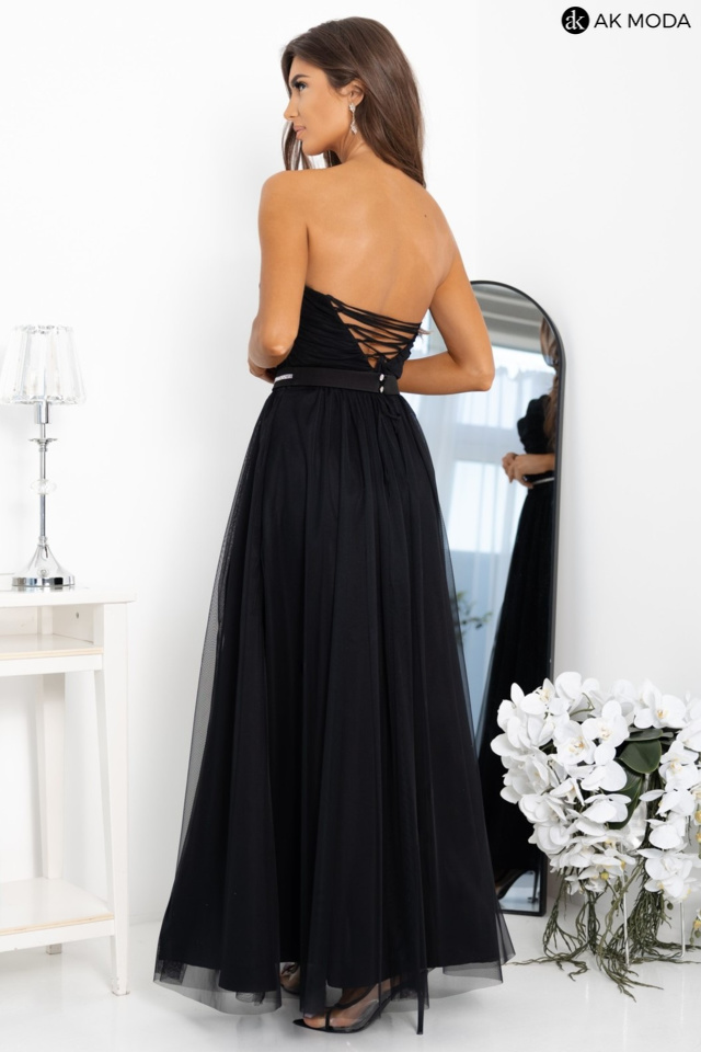 Długa rozkloszowana sukienka w kolorze czarnym z wierzchnią warstwą tiulu. Góra gorsetowa z marszczeniem i wiązaniem na plecach, na nodze rozcięcie. W zestawie dopinane ramiączka i ozdobny pasek.