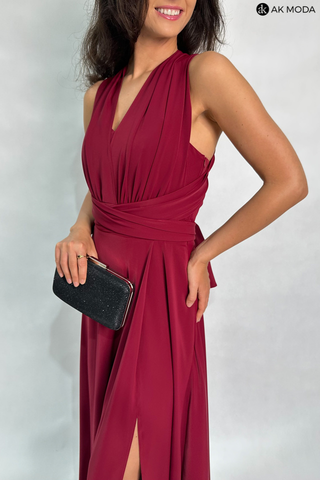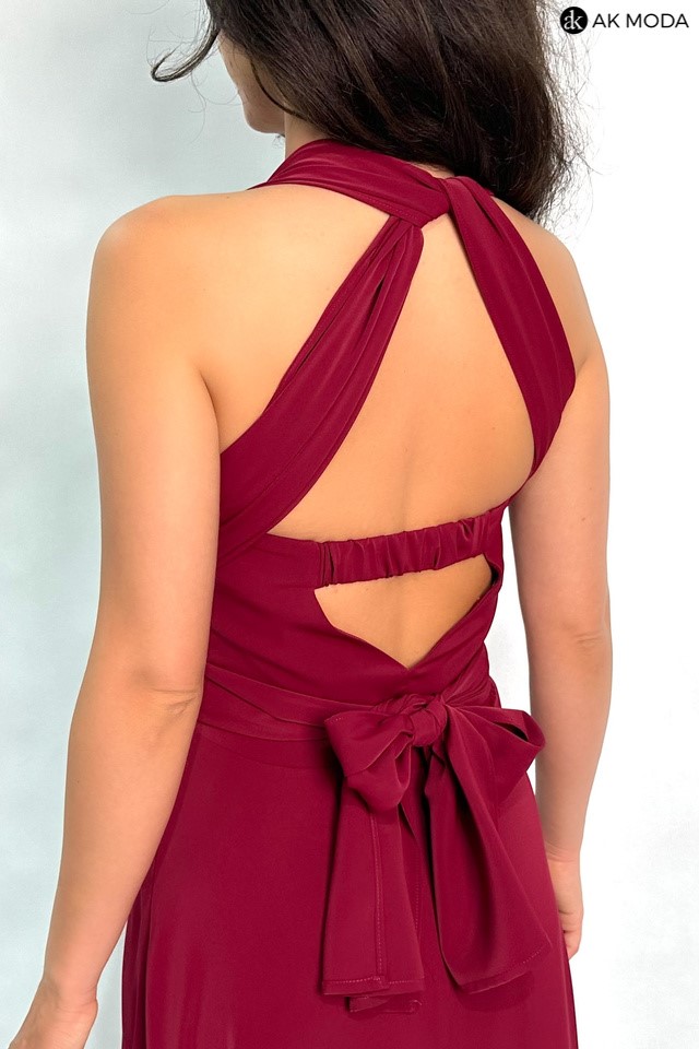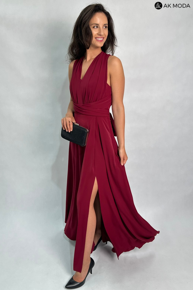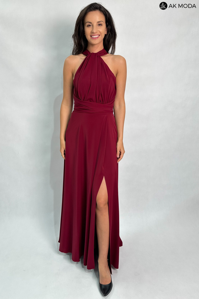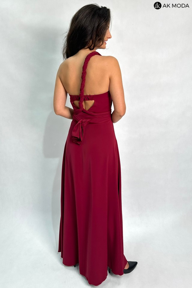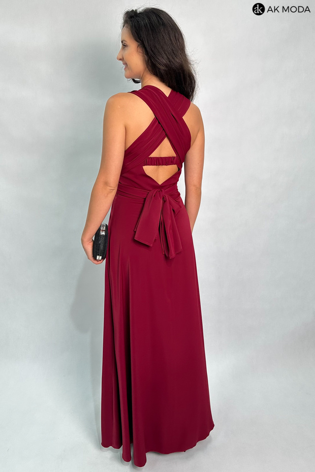 Długa rozkloszowana sukienka w kolorze bordowym, z wszytymi fiszbinami na biuście oraz gumką na plecach. Możliwość kilku sposobów wiązania szarf.
