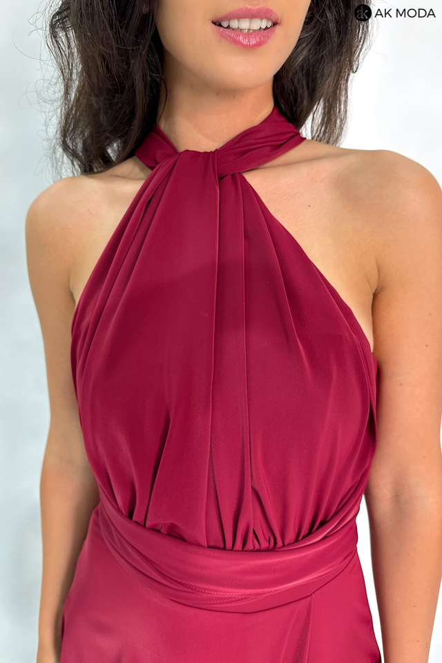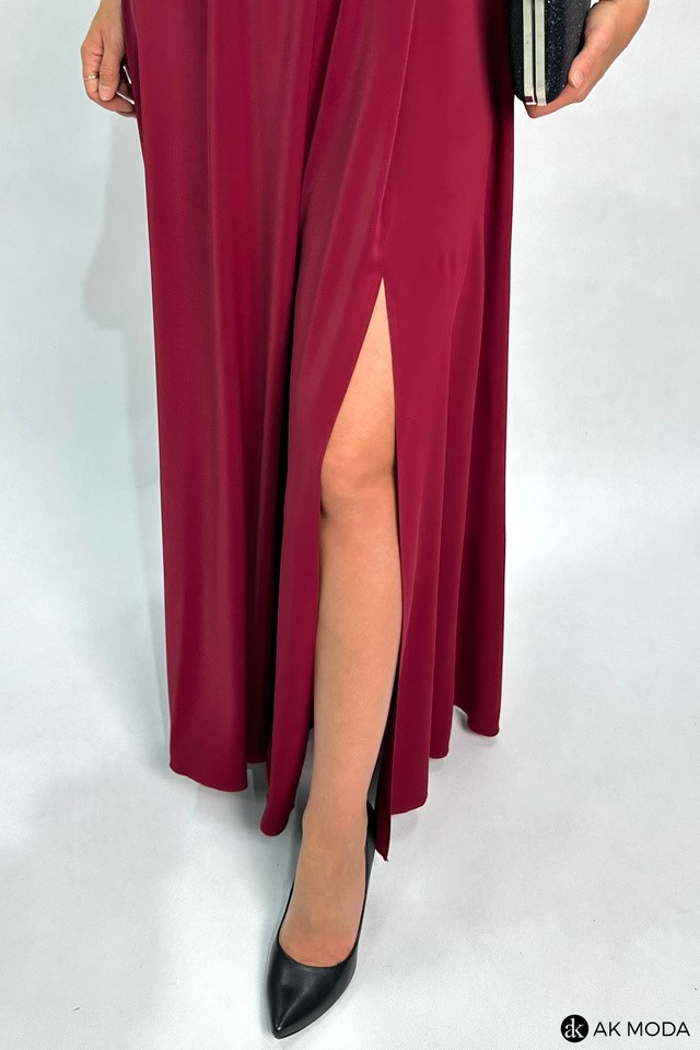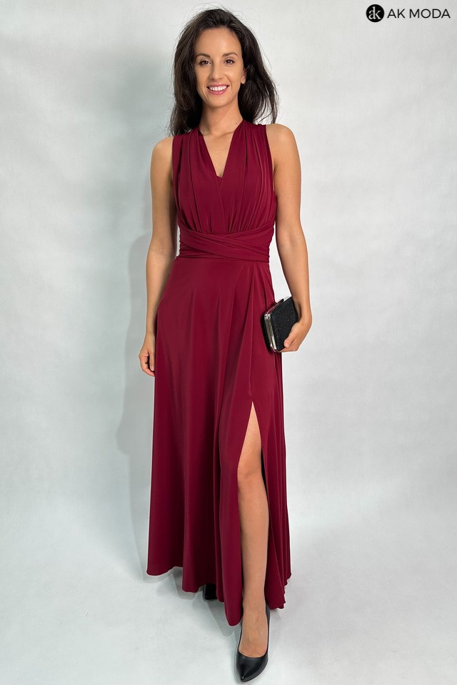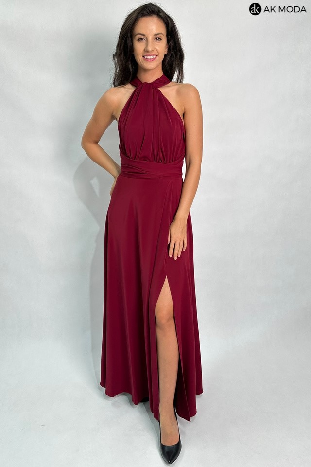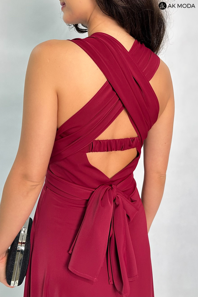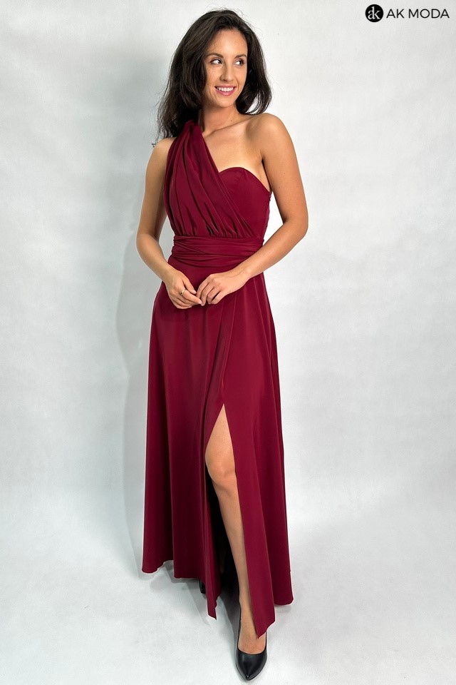 Długa rozkloszowana sukienka w kolorze bordowym, z wszytymi fiszbinami na biuście oraz gumką na plecach. Możliwość kilku sposobów wiązania szarf.