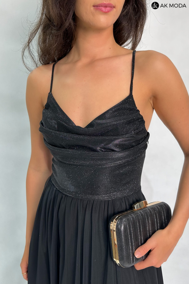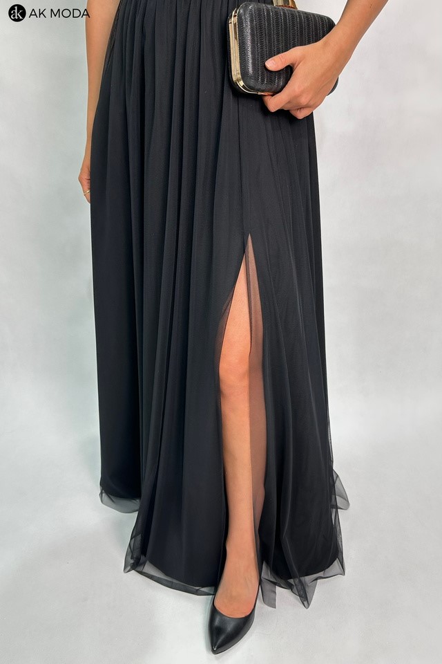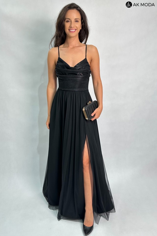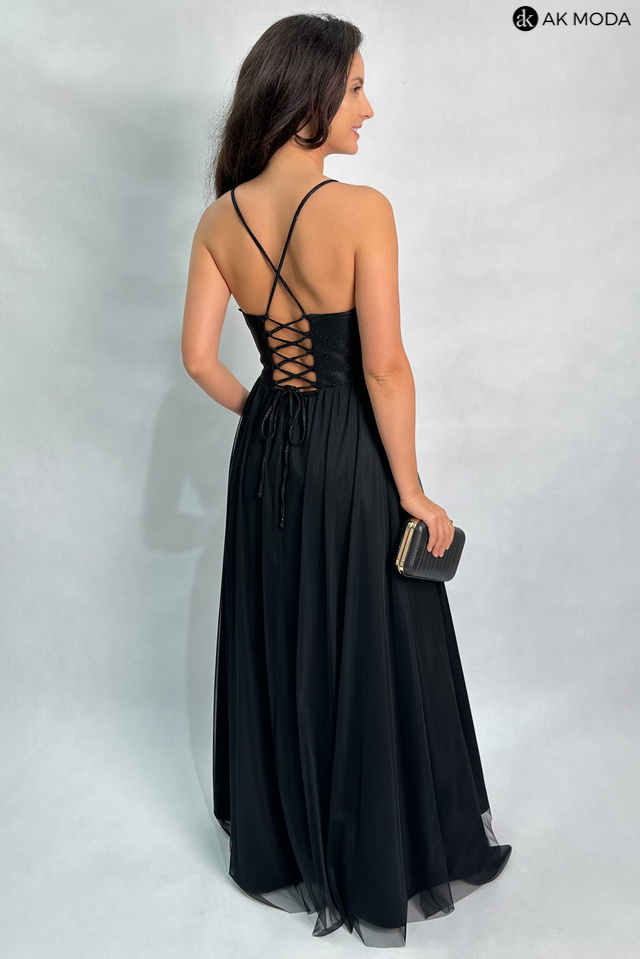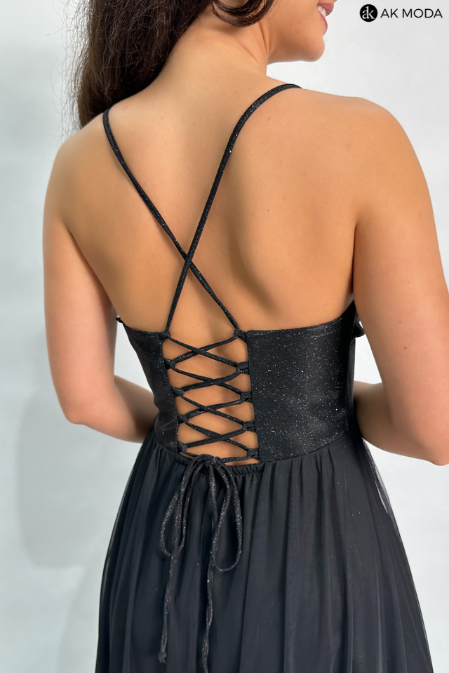Długa, rozkloszowana sukienka w kolorze czarnym z efektownym sznurowaniem na plecach. Dekolt typu "woda", góra sukienki brokatowa, dół z wierzchnią warstwą tiulu.