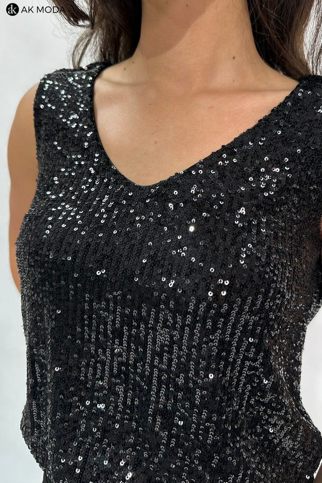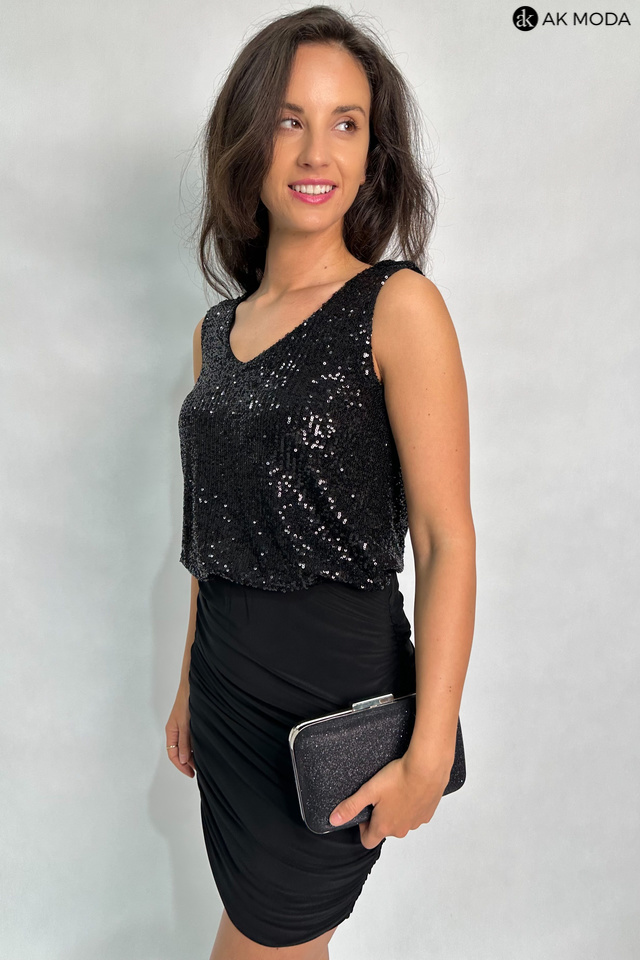 Elegancka sukienka mini w kolorze czarnym z odsłoniętymi plecami. Dół dopasowany z marszczeniami po bokach, góra luźniejsza wyszywana cekinami. Sukienka uszyta z elastycznego materiału.