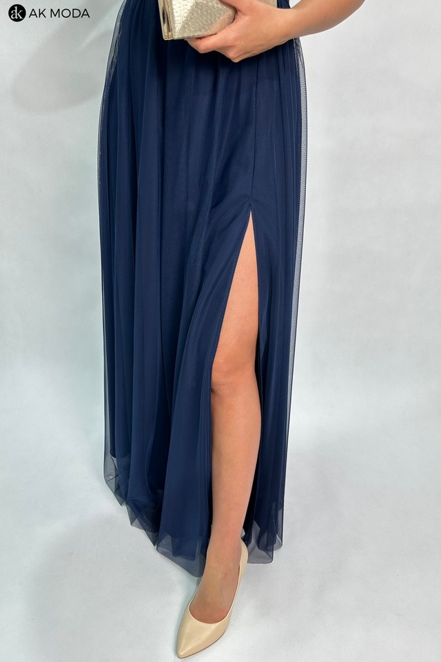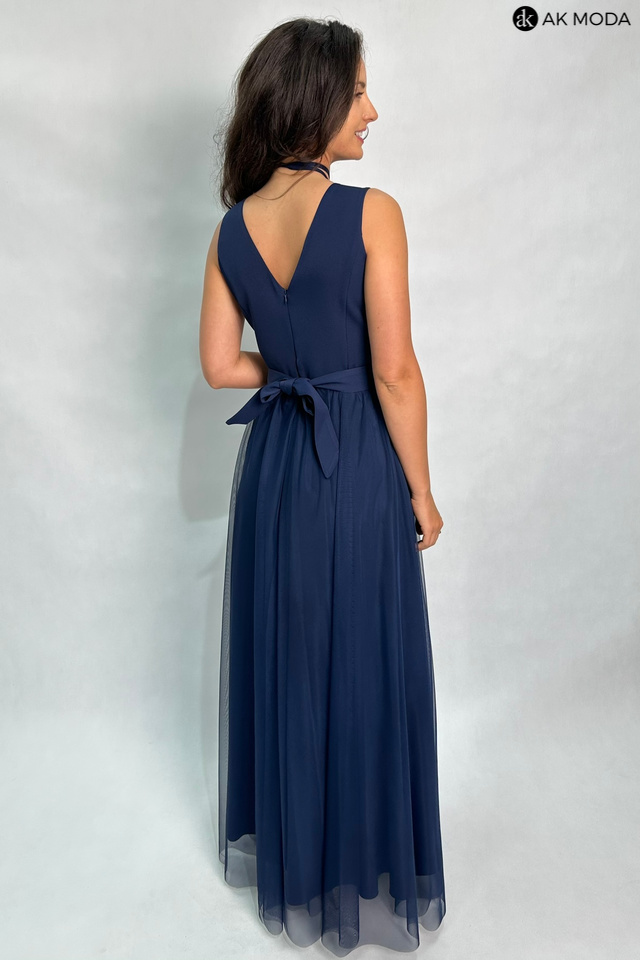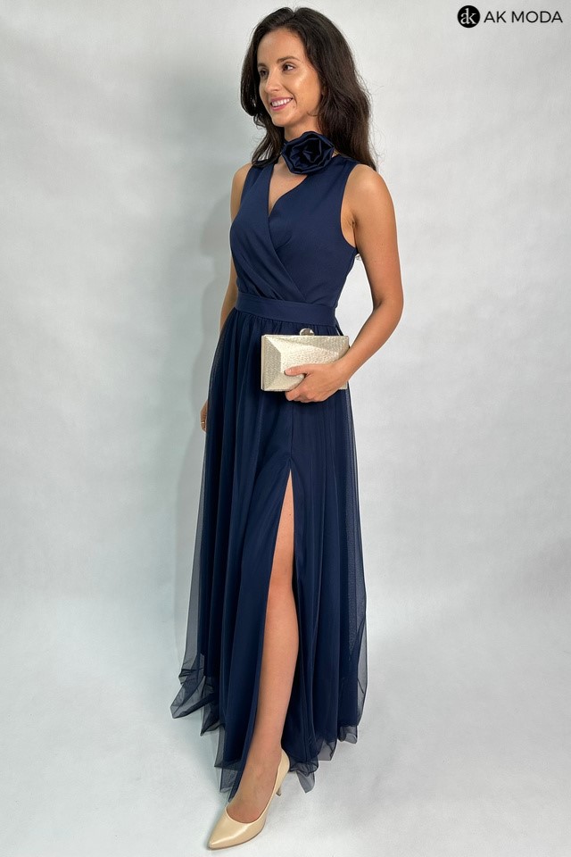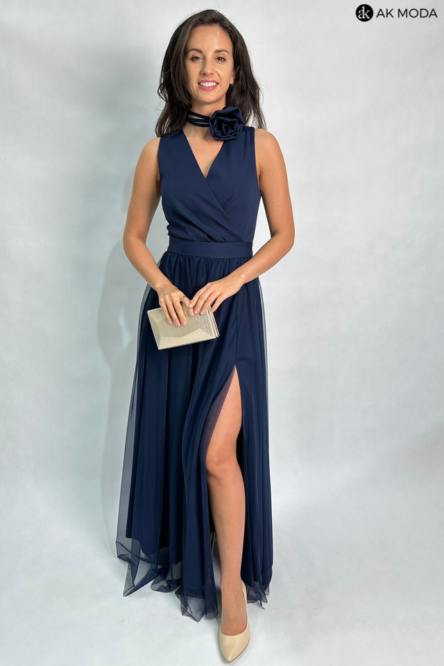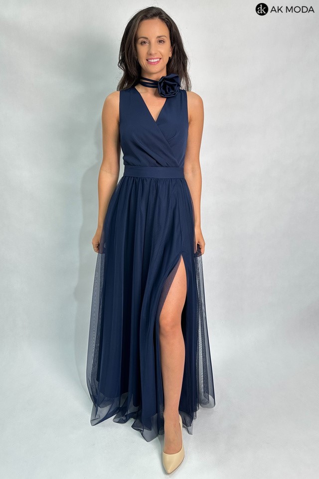 Elegancka długa sukienka w kolorze granatowym. Dekolt kopertowy, w talii wiązany pasek, dół rozkloszowany z wierzchnią warstwą tiulu. W zestawie pasek z ozdobnym kwiatkiem.