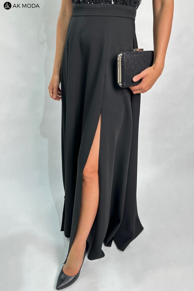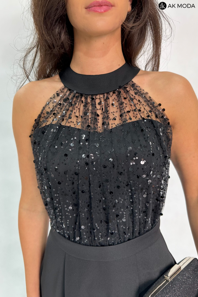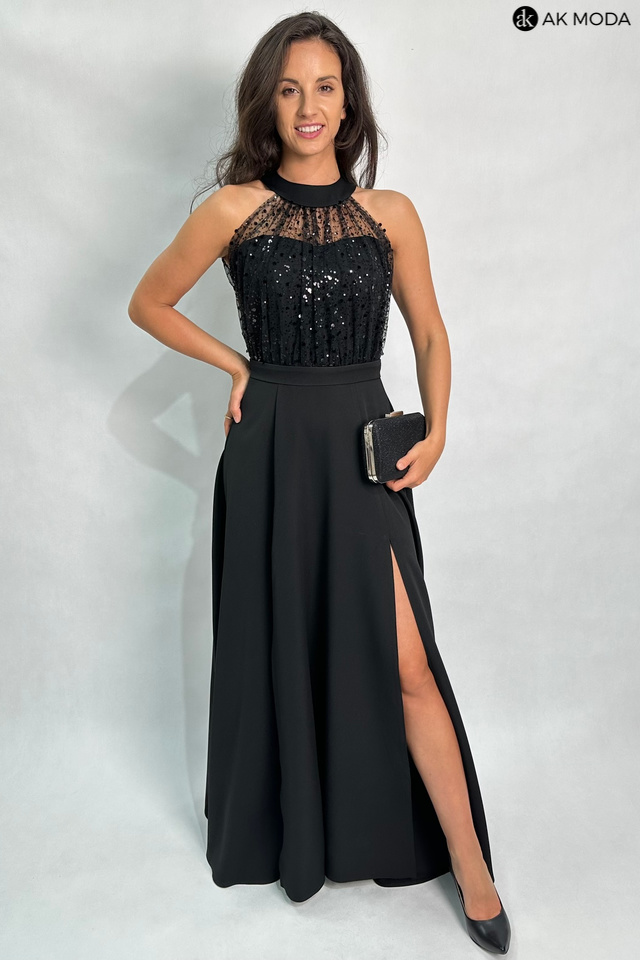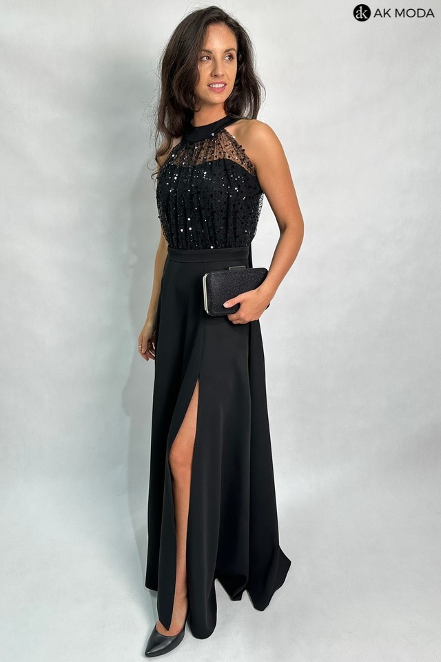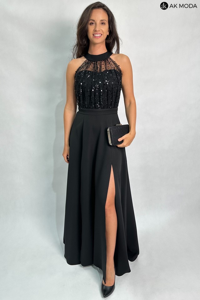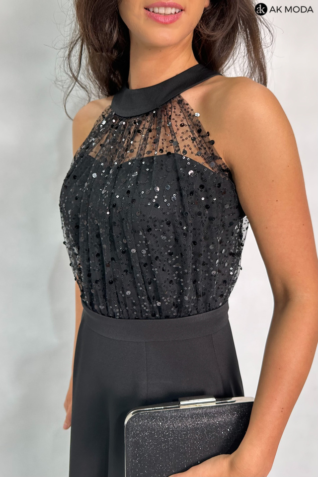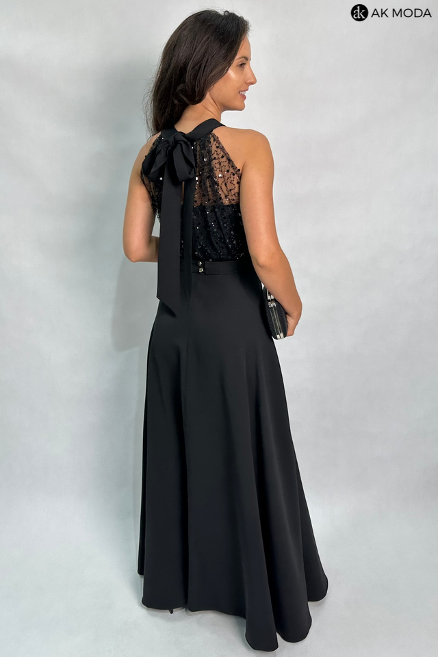 Długa rozkloszowana sukienka w kolorze czarnym, w górnej części ozdobiona cekinami. Dekolt typu halter, w talii pasek, na biuście wszyte fiszbiny.