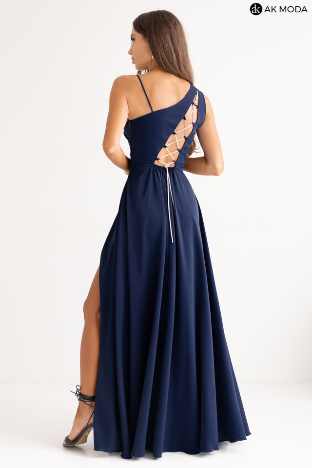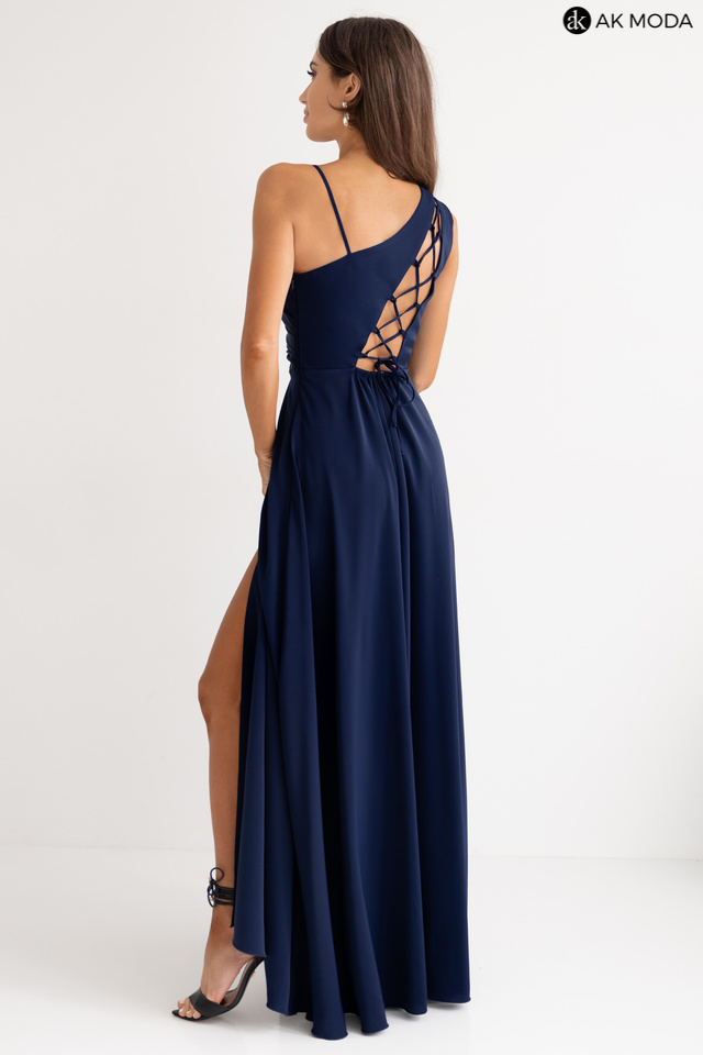 Długa, rozkloszowana sukienka na jedno ramię w kolorze granatowym z efektownym sznurowaniem na plecach i gumką w pasie. W zestawie dwa sznurki do wiązania na plecach, ozdobny brokatowy oraz gładki, w kolorze sukienki.