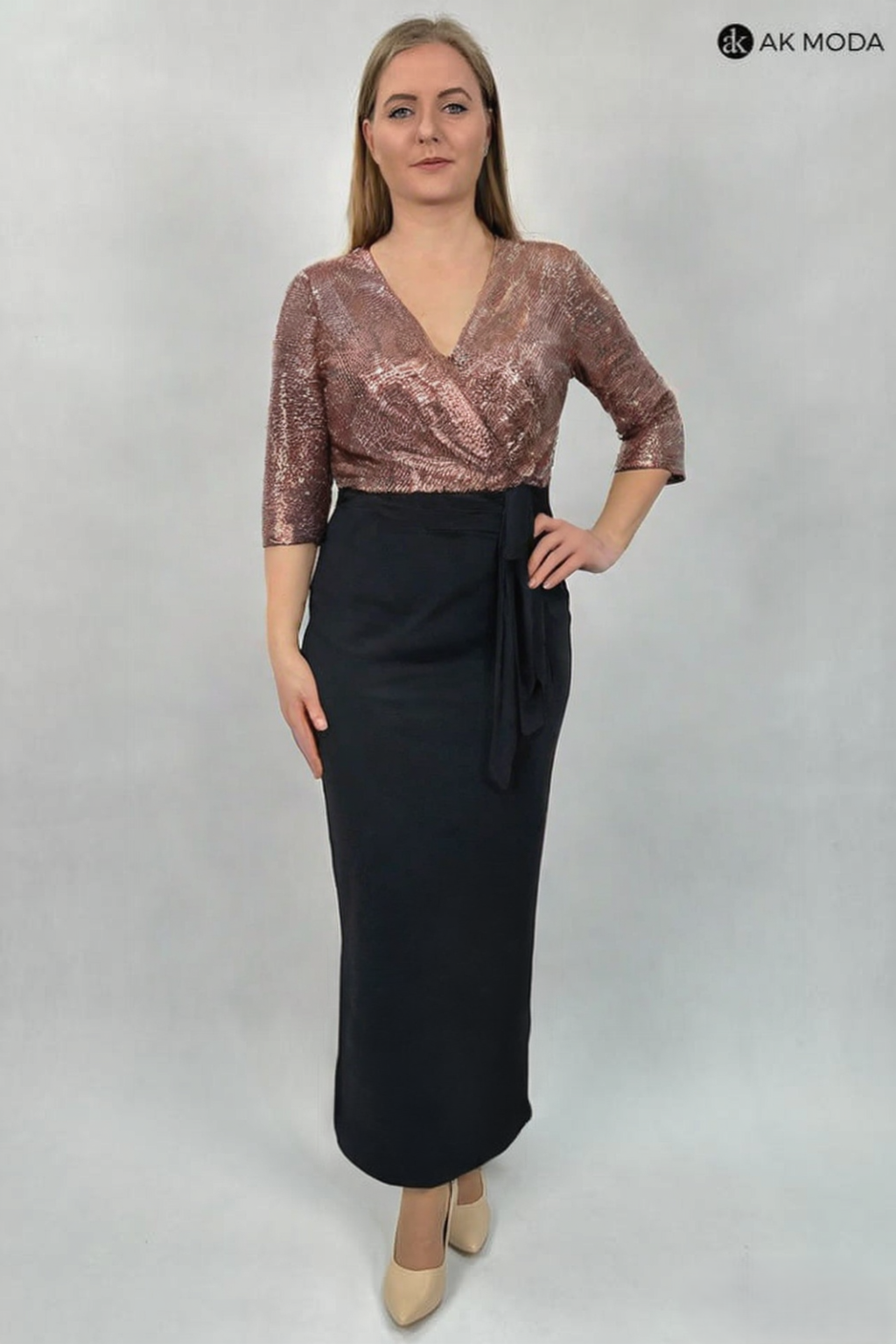 Elegancka, długa sukienka w czarno-miedzianej kolorystyce. Dekolt kopertowy, rękawy do łokcia. Góra sukienki w całości zdobiona błyzsczącymi cekinami, dół zakładany.
