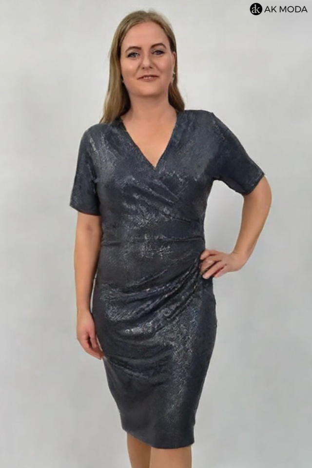 Eegancka czarna sukienka, uszyta z elastycznego materiału, w całości zdobiona błyszczącymi cekinami. Dekolt zakładany, krótkie, kimonowe rękawki, w talii marszczenie.