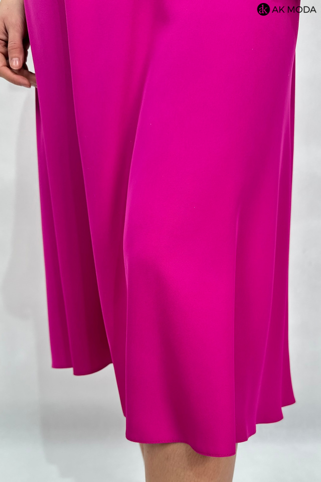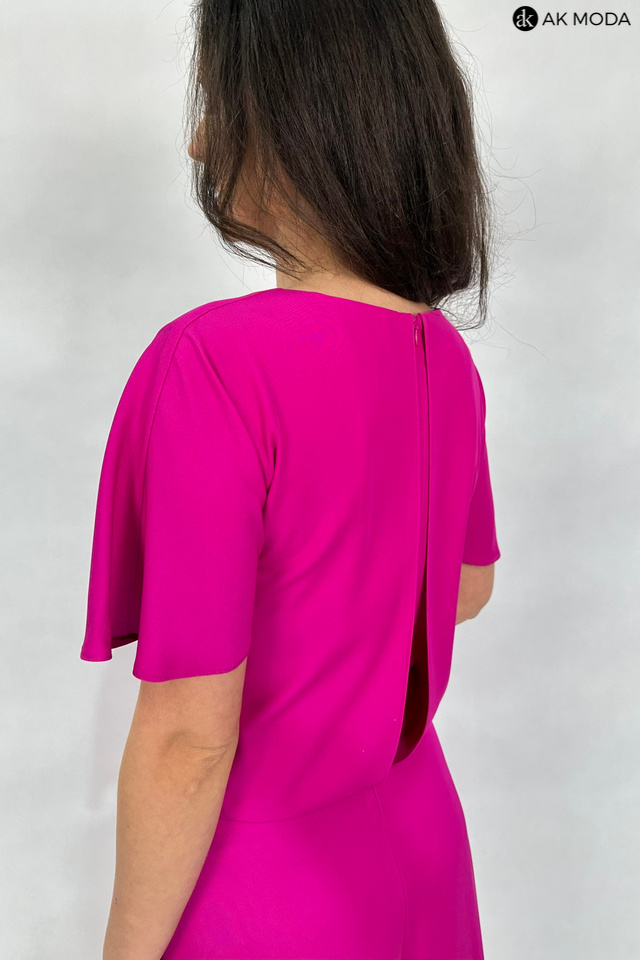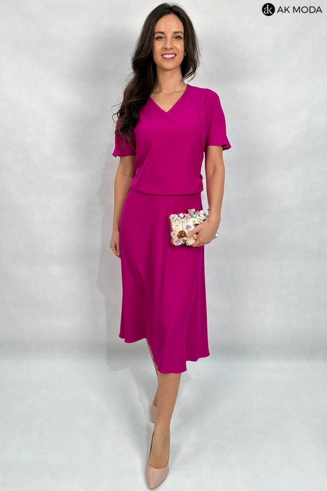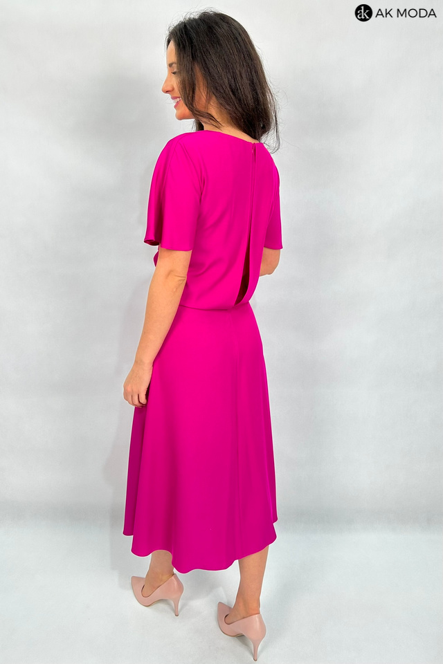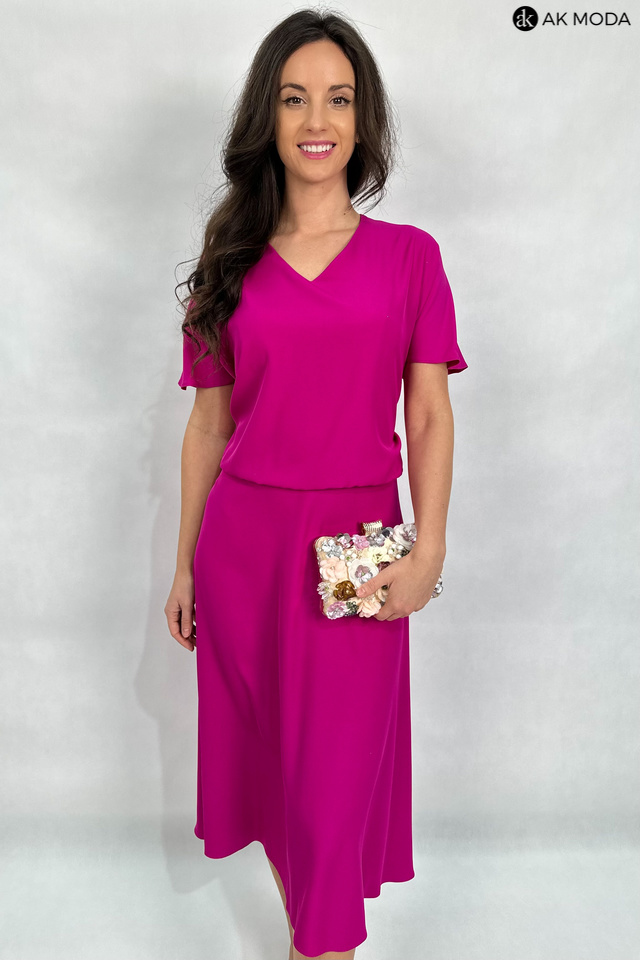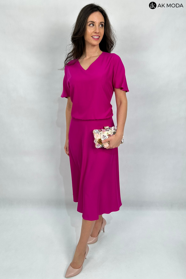 Elegancka sukienka midi w kolorze różowym z krótkimi kimonowymi rękawami i dekoltem w szpic. Dół rozkloszowany, góra luźniejsza.