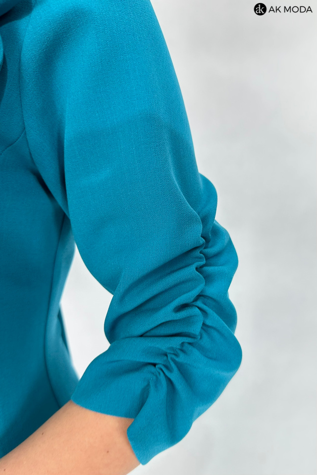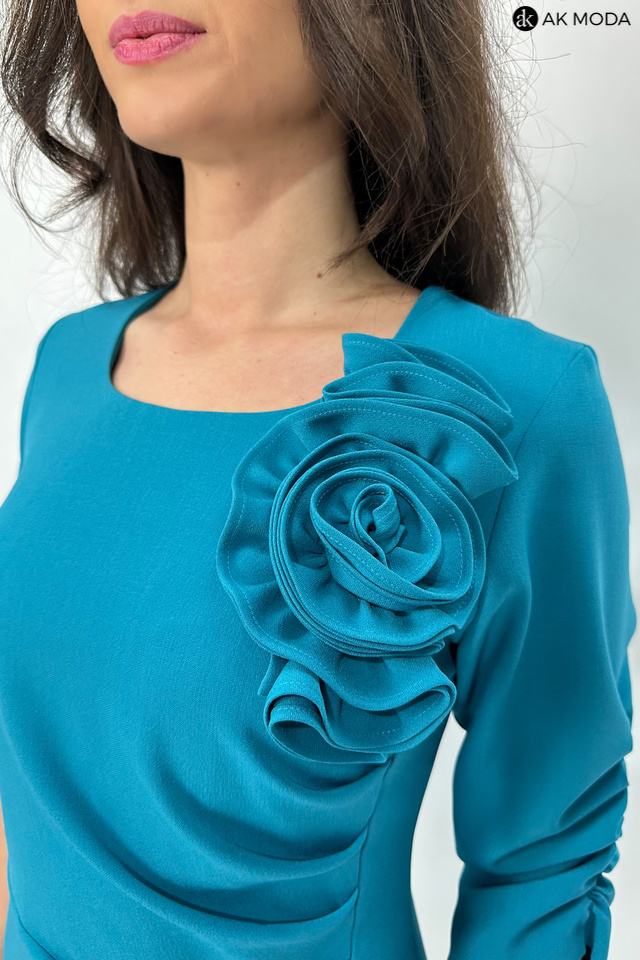 Elegancka, dopasowana sukienka w kolorze morskim, z odpinanym ozdobnym kwiatkiem. Dekolt okrągły, rękawy do łokcia, na boku marszczenie.