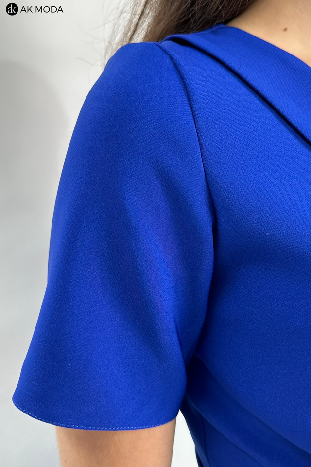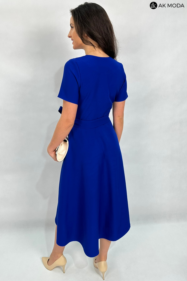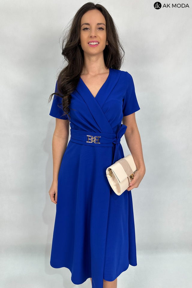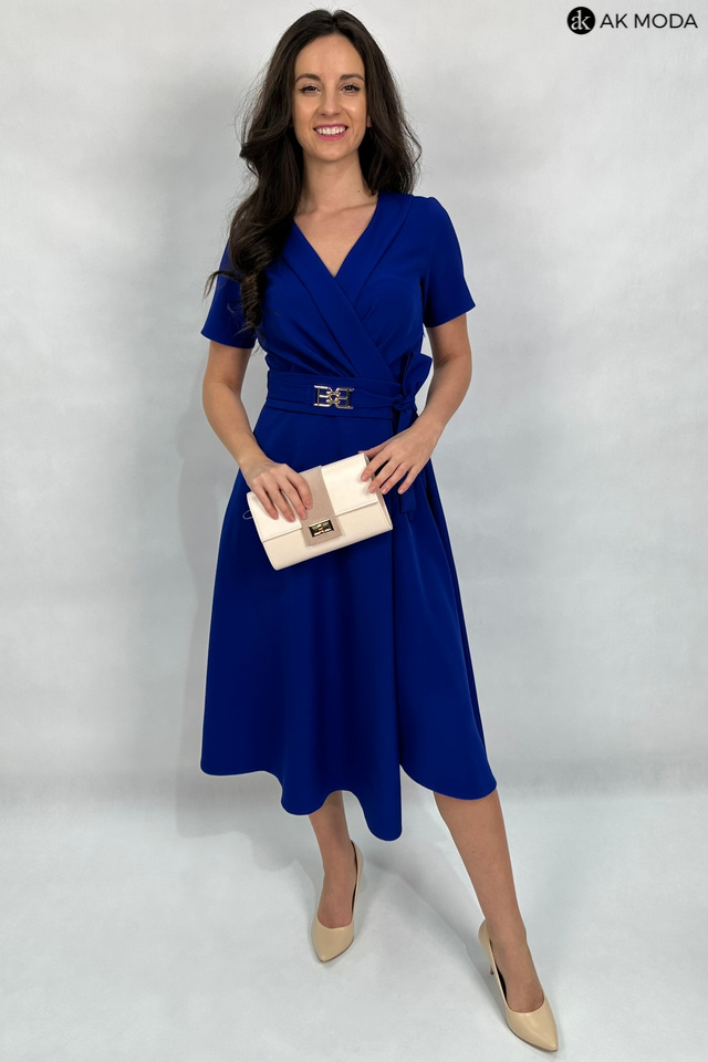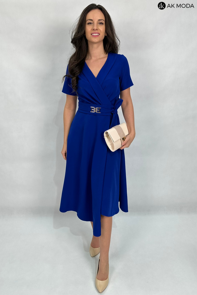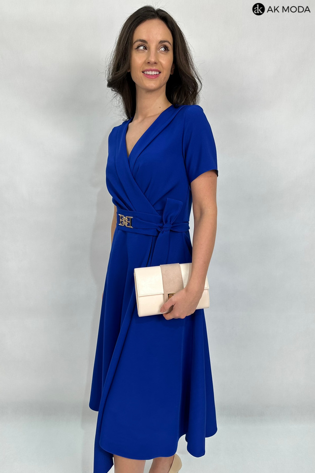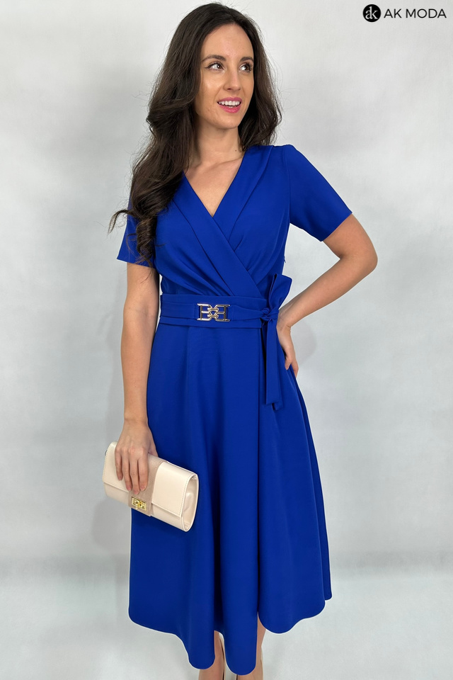 Rozkloszowana sukienka midi w kolorze chabrowym z załadanym dołem i szalowym kołnierzem. Krótkie rękawy, w talii pasek z ozdobną klamrą. Dekolt kopertowy - dopasowuje się do biustu.